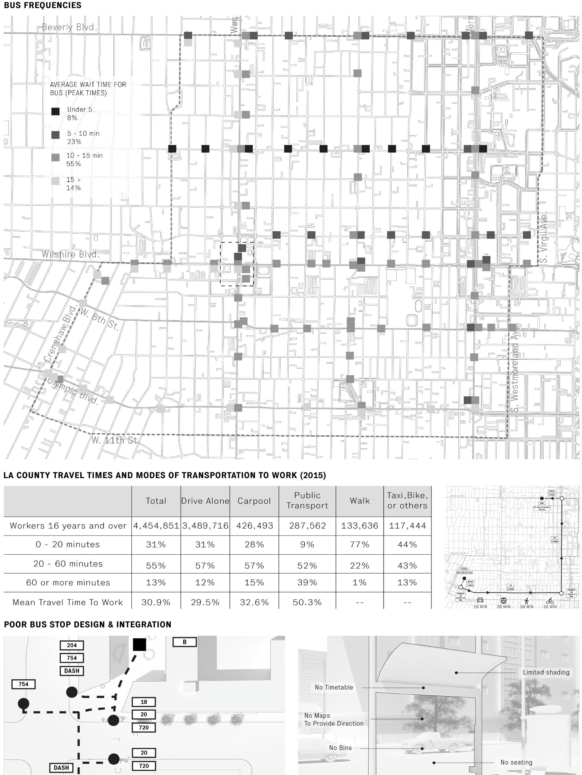 Koreatown’s current public transit network connects it to Hollywood and Downtown Los Angeles but lacks efficient options for inner-community travel, making local commutes inconvenient. A new bus system aims to fill this gap with two tailored lines. The Ktown Line circles the neighborhood, prioritizing accessibility for elderly residents by linking major landmarks, while the Rapid Line crosses the center, offering quick connections between commercial hubs for younger professionals. The bus stop designs incorporate existing elements like lamp posts and trees, blending seamlessly with the neighborhood while supporting sustainable urban development. This system enhances mobility, reduces commute times, and respects Koreatown’s unique character.