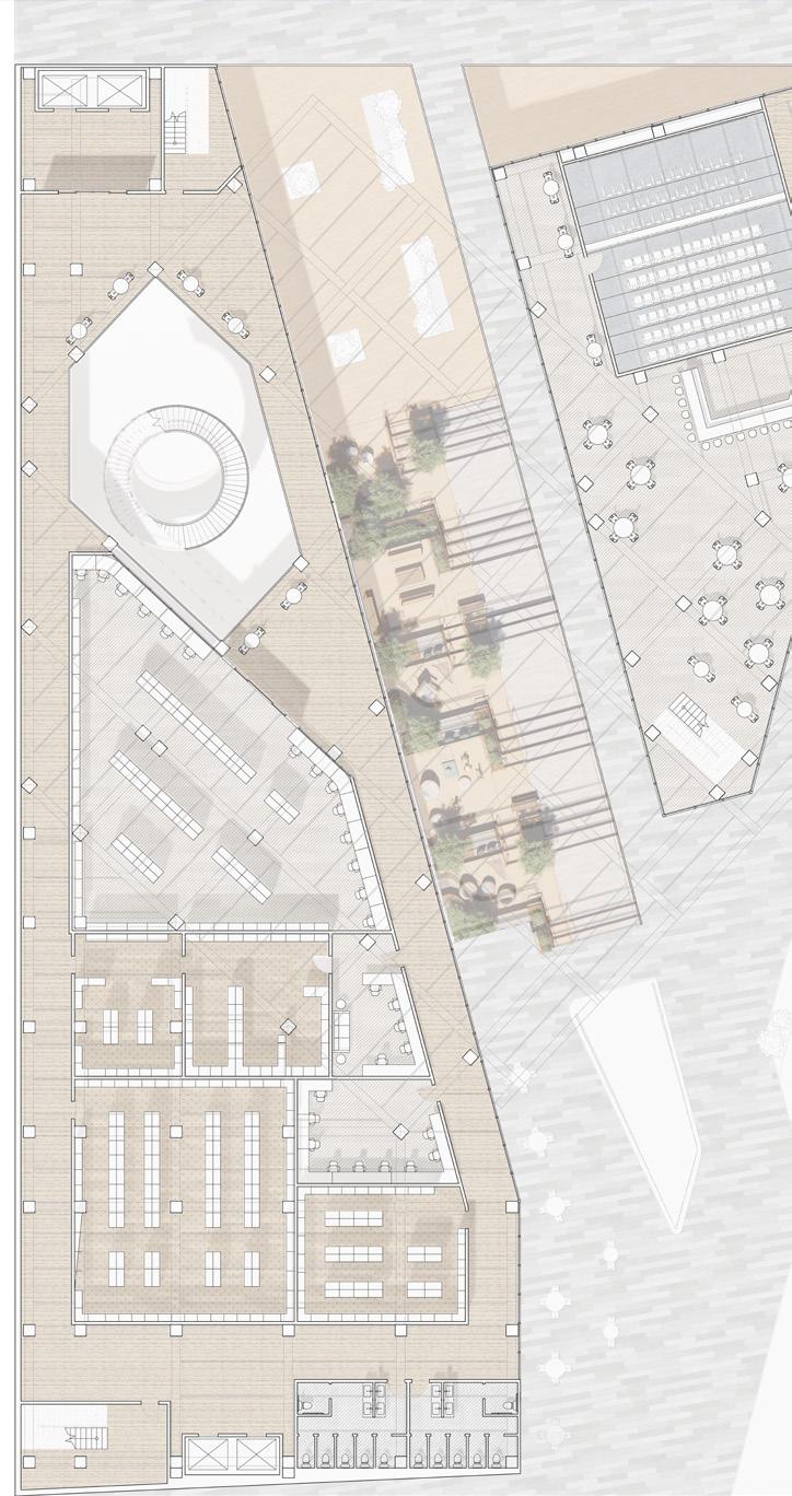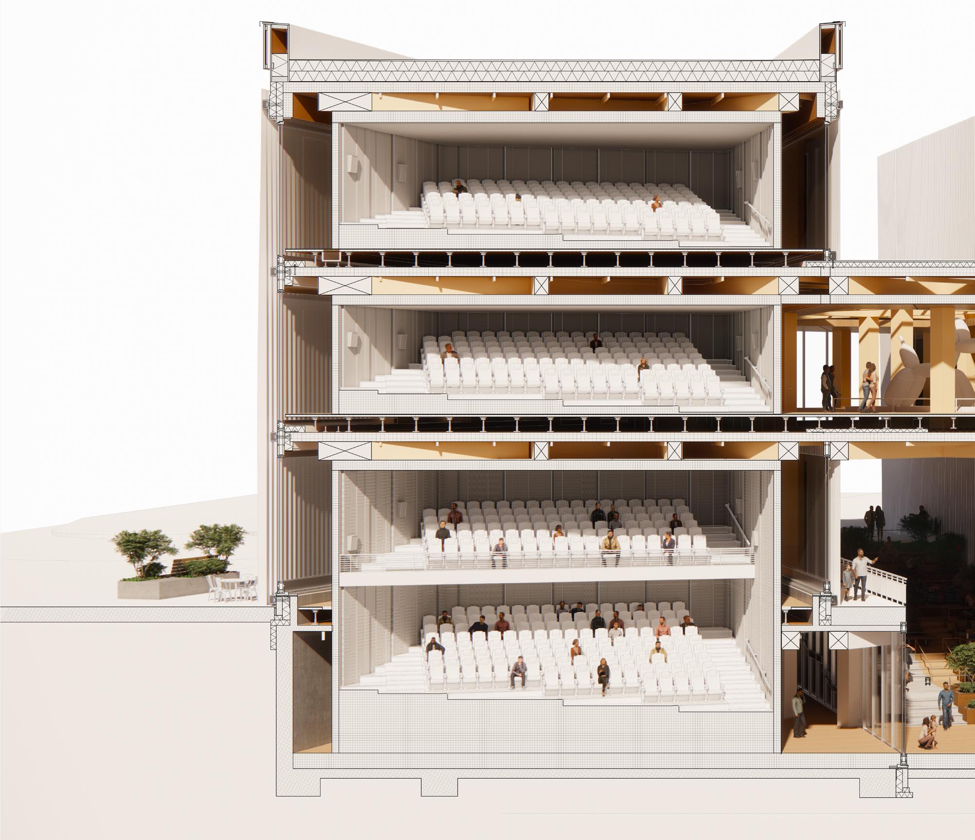 When designing the Institute of Film for Downtown Los Angeles, I focused on extending the El Pueblo-Chinatown corridor into the site, shaping the building’s massing. The design features a stepped staircase with integrated seating, leading visitors to the museum’s entrance and separating them from the busy streets. The museum’s façade incorporates adjustable fins that modulate light, providing dynamic illumination in circulation areas and reduced glare in private spaces.