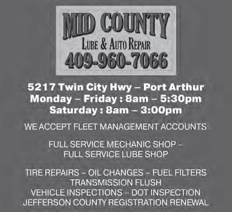 Weekend, June 24-25, 2023 / The News NEWS/ A15 5217 Twin City Hwy – Port Arthur Monday – Friday : 8am – 5:30pm Saturday : 8am – 3:00pm WE ACCEPT FLEET MANAGEMENT ACCOUNTS FULL SERVICE MECHANIC SHOP –FULL SERVICE LUBE SHOP TIRE REPAIRS – OIL CHANGES – FUEL FILTERS TRANSMISSION FLUSH VEHICLE INSPECTIONS – DOT INSPECTION JEFFERSON COUNTY REGISTRATION RENEWAL STORE HOURS: Mon to Fri: 8AM-7PM | Sat: 9AM-4PM RX HOURS: Mon to Fri: 9AM-7PM | Sat: 10AM-4PM 1505 Hwy 69 | Nederland, TX (409) 853-4100 Proud Supporter of our Hometown Heroes! Thank you for your dedication to keeping our communities safe and healthy. HOMETOWN HEROES Thank You to our HOMETOWN HEROES for all you do in our community. Mid County Insurance Julian “Clay” Salter III Agent • Commercial • Personal • Marine 2319 Nederland Ave., Nederland 727-7677