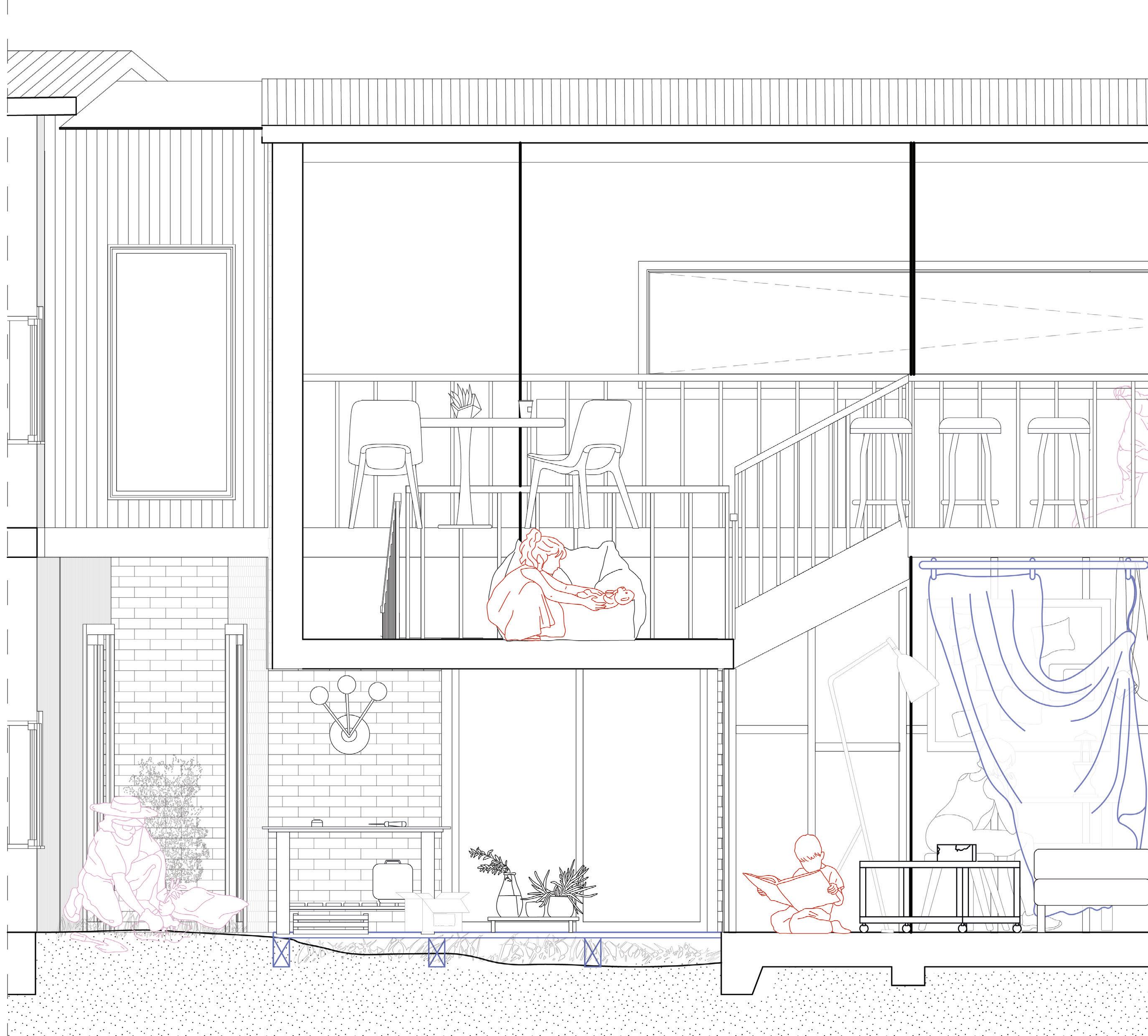 From the exterior, the translucent panel functions as a temporal facade over the light framing. This temporal aspect reflects the panel’s role to evolve with the household’s changing needs, creating temporary or transitional spaces that can be easily reconfigured, opened to outdoor or enclosed to support a living space that is not static but grows and transforms in multigenerational living and various lifestyle changes.