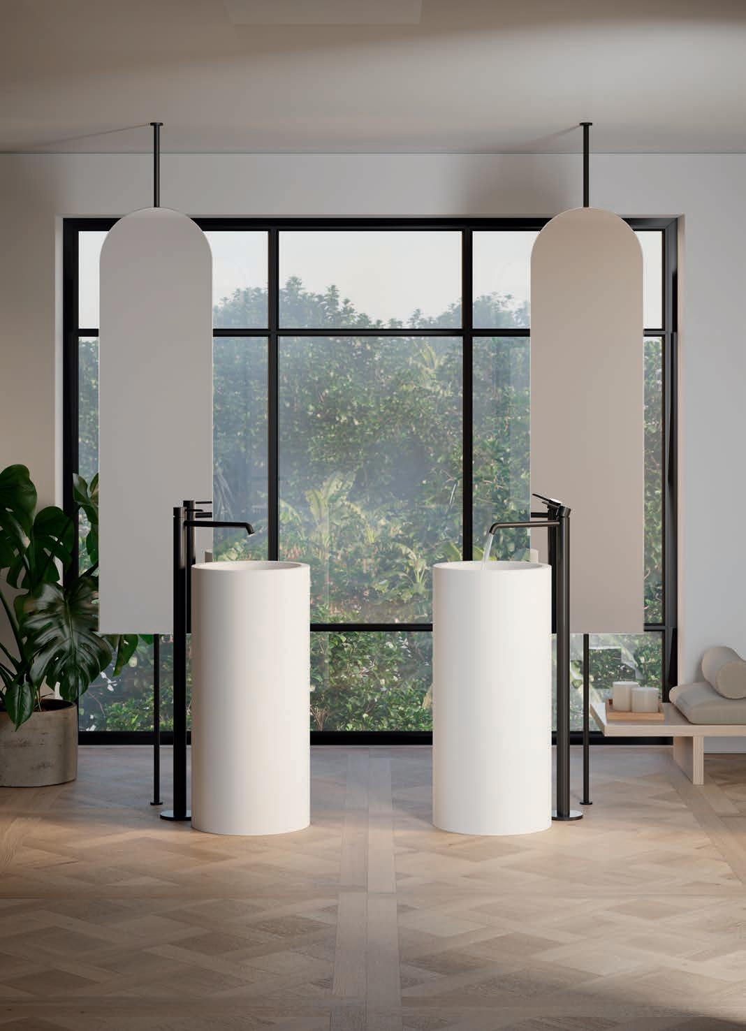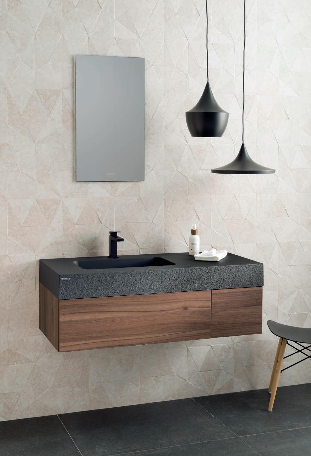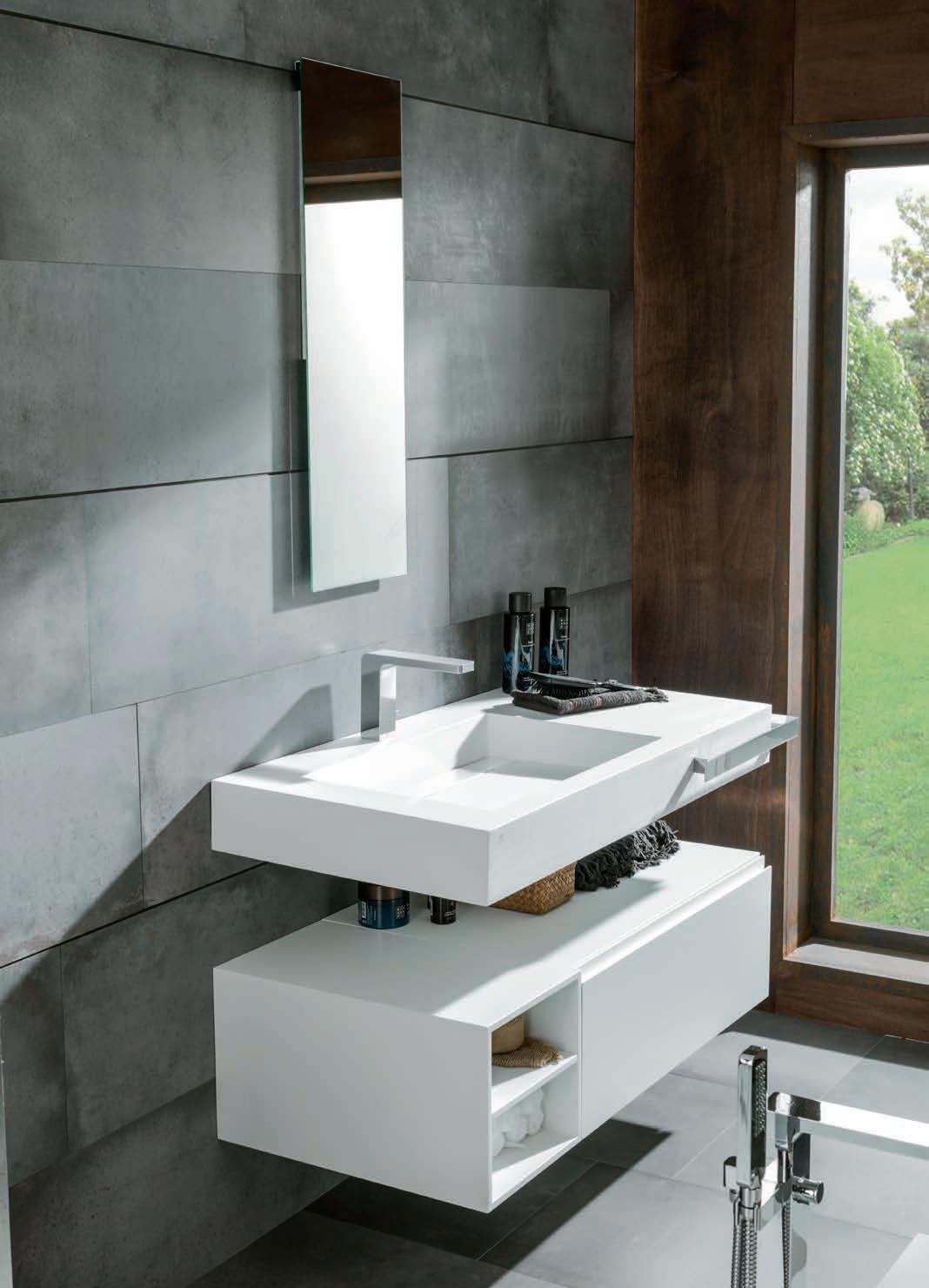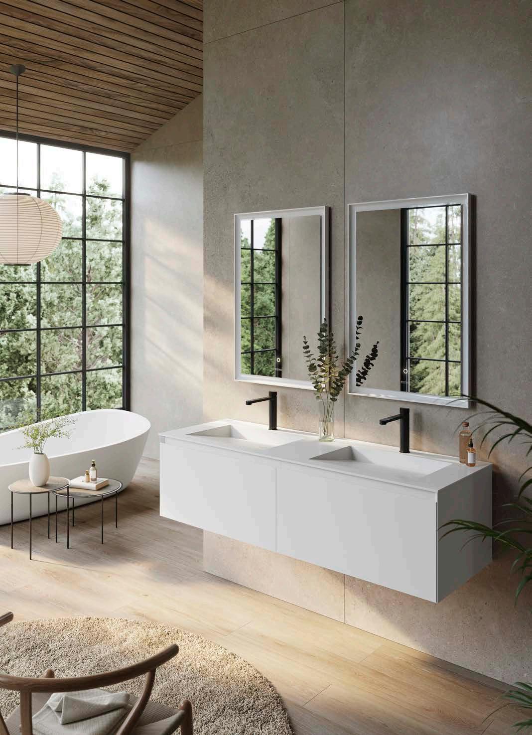 Fabriquée en KRION®, présente des éléments freestanding dans l´option de la baignoire, lavabo au sol et lavabo semiencastré.