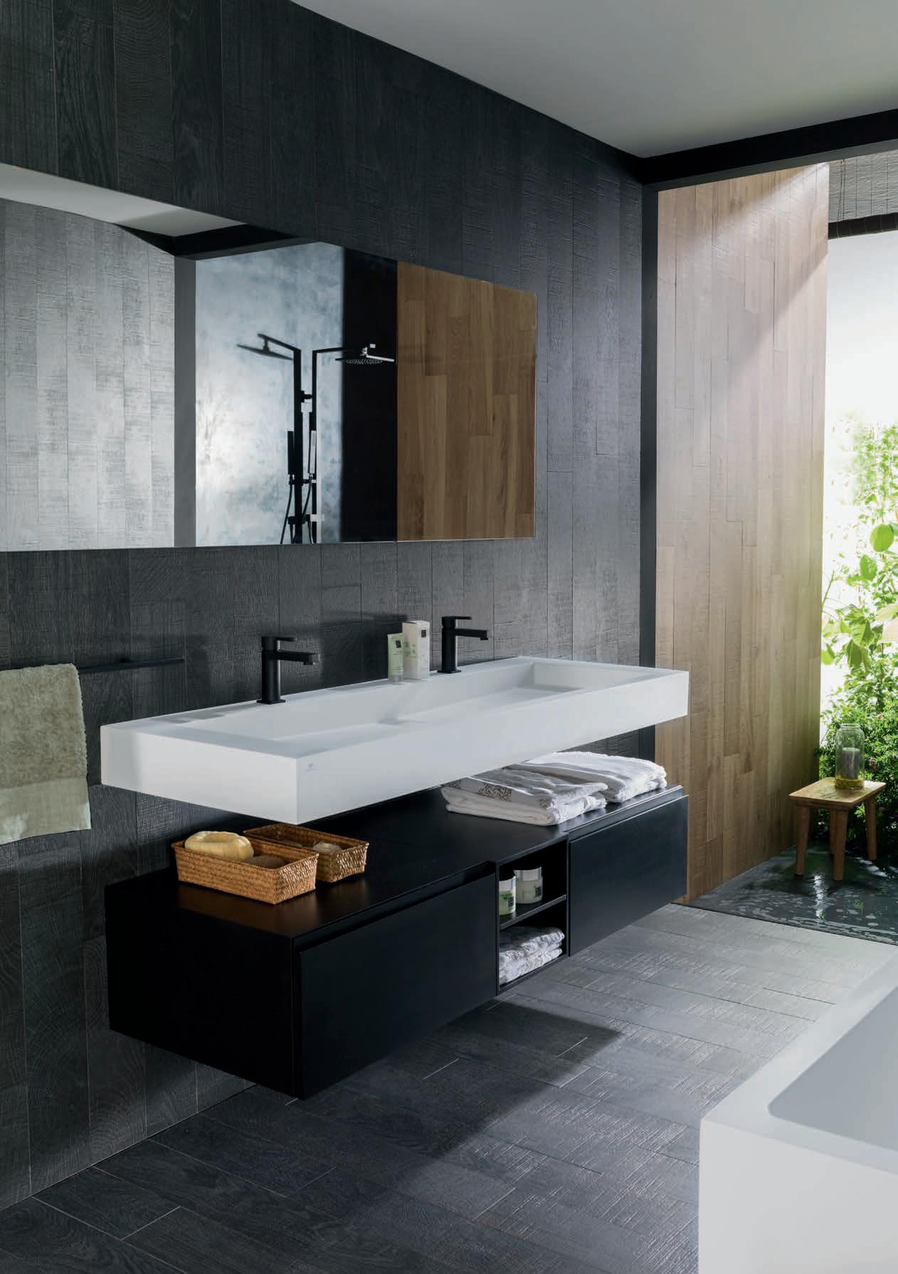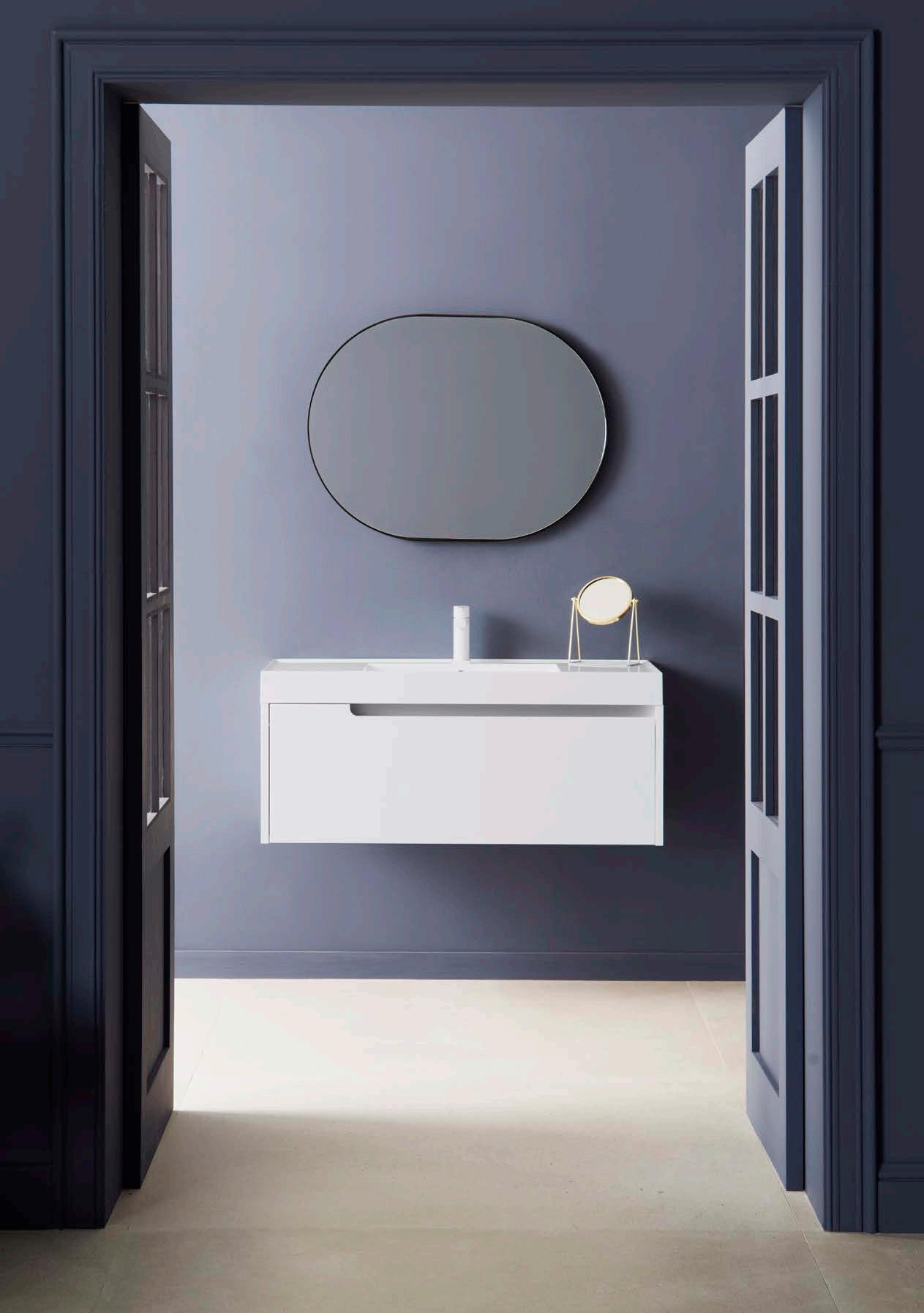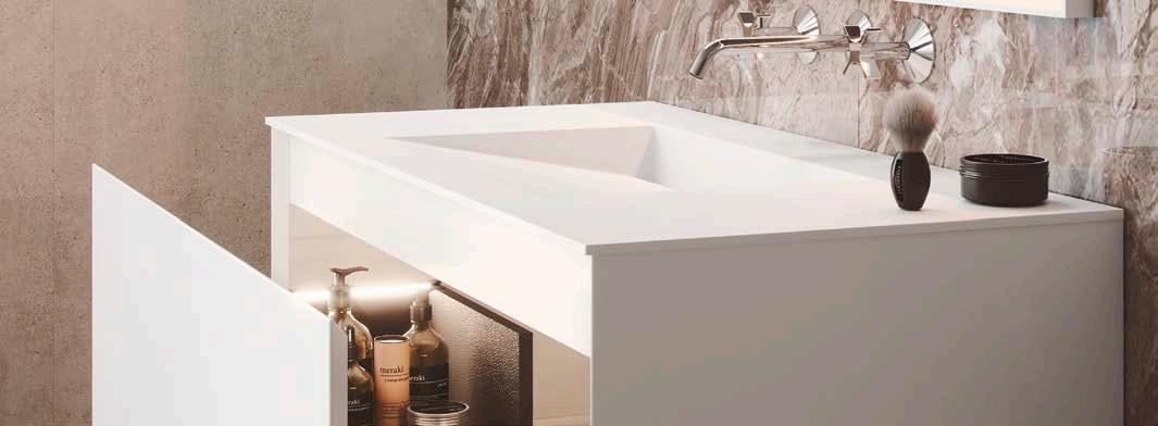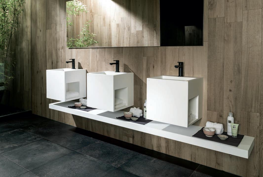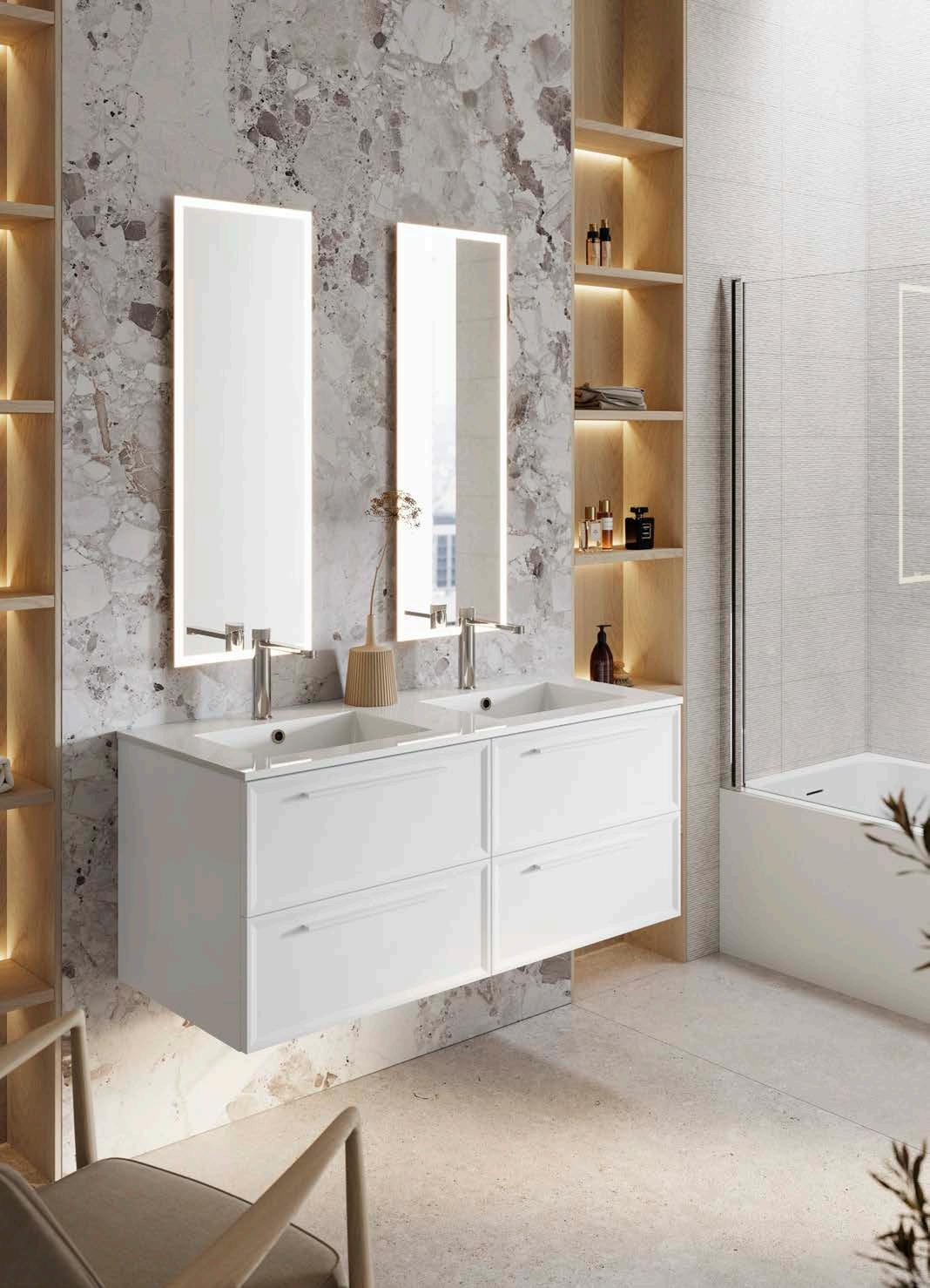 Fabriquée en KRION®, présente des éléments freestanding dans l´option de la baignoire, lavabo au sol et lavabo semiencastré.