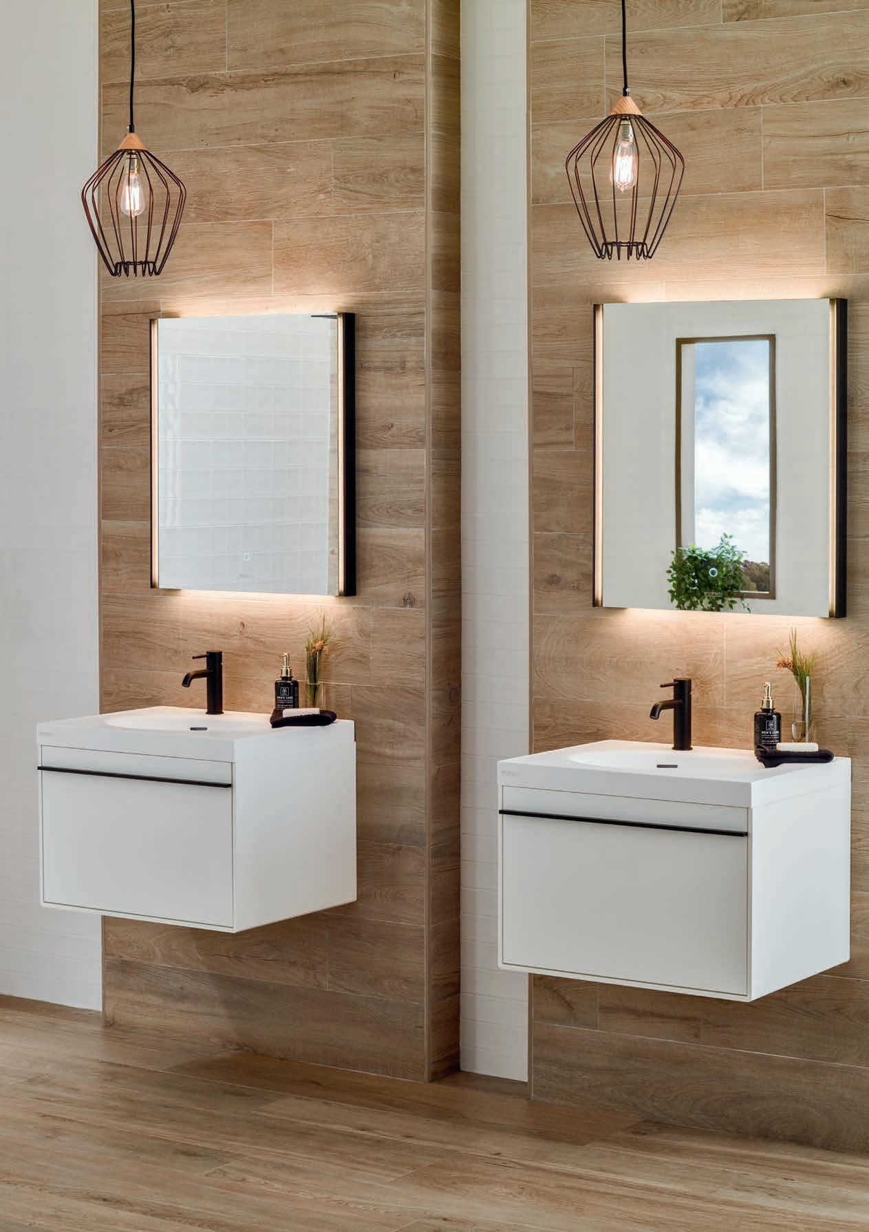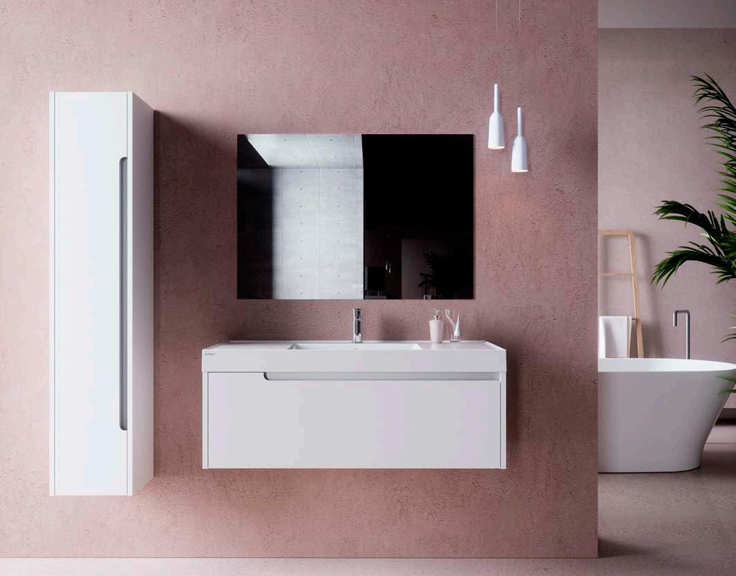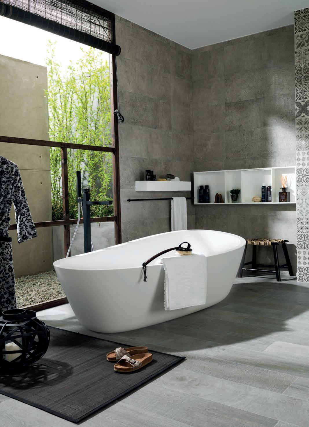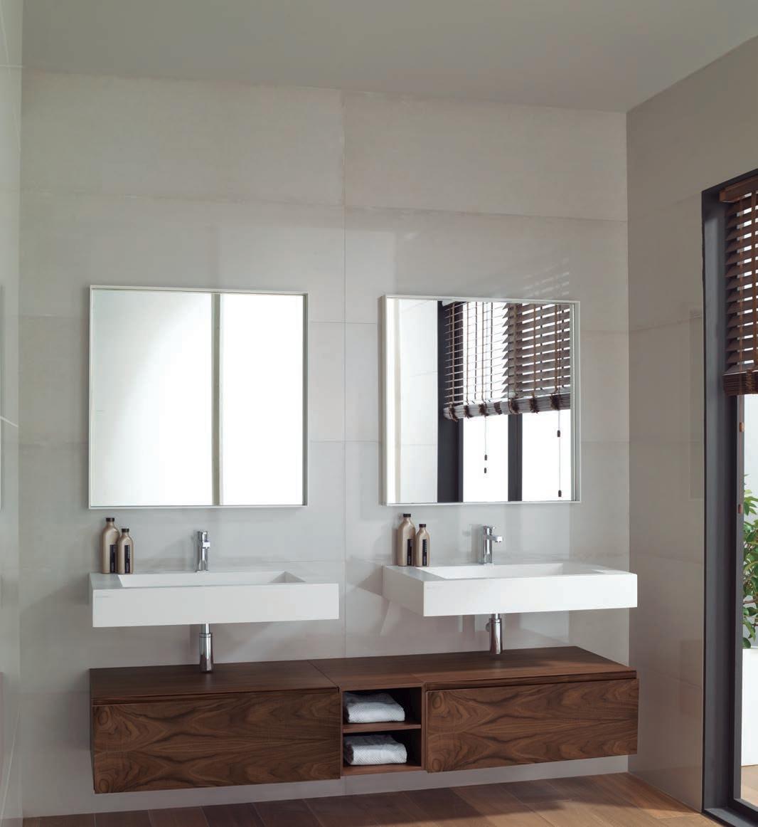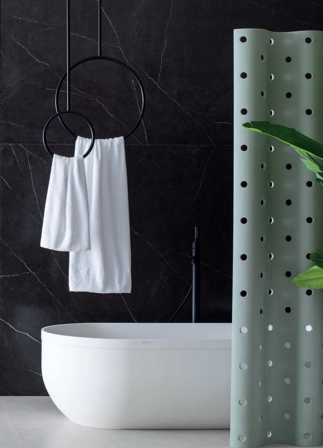 Fabriquée en KRION®, présente des éléments freestanding dans l´option de la baignoire, lavabo au sol et lavabo semiencastré.