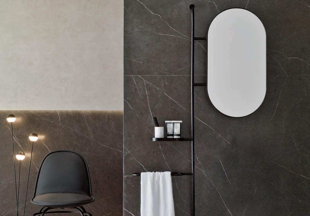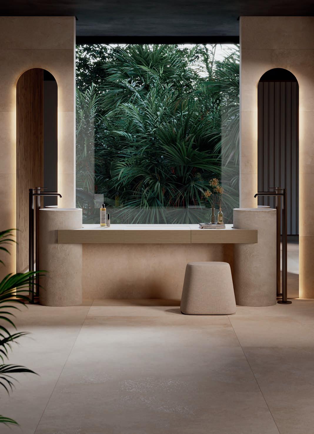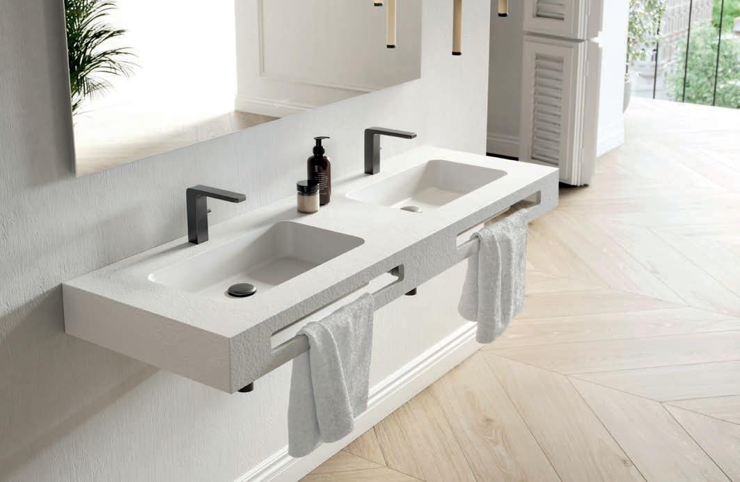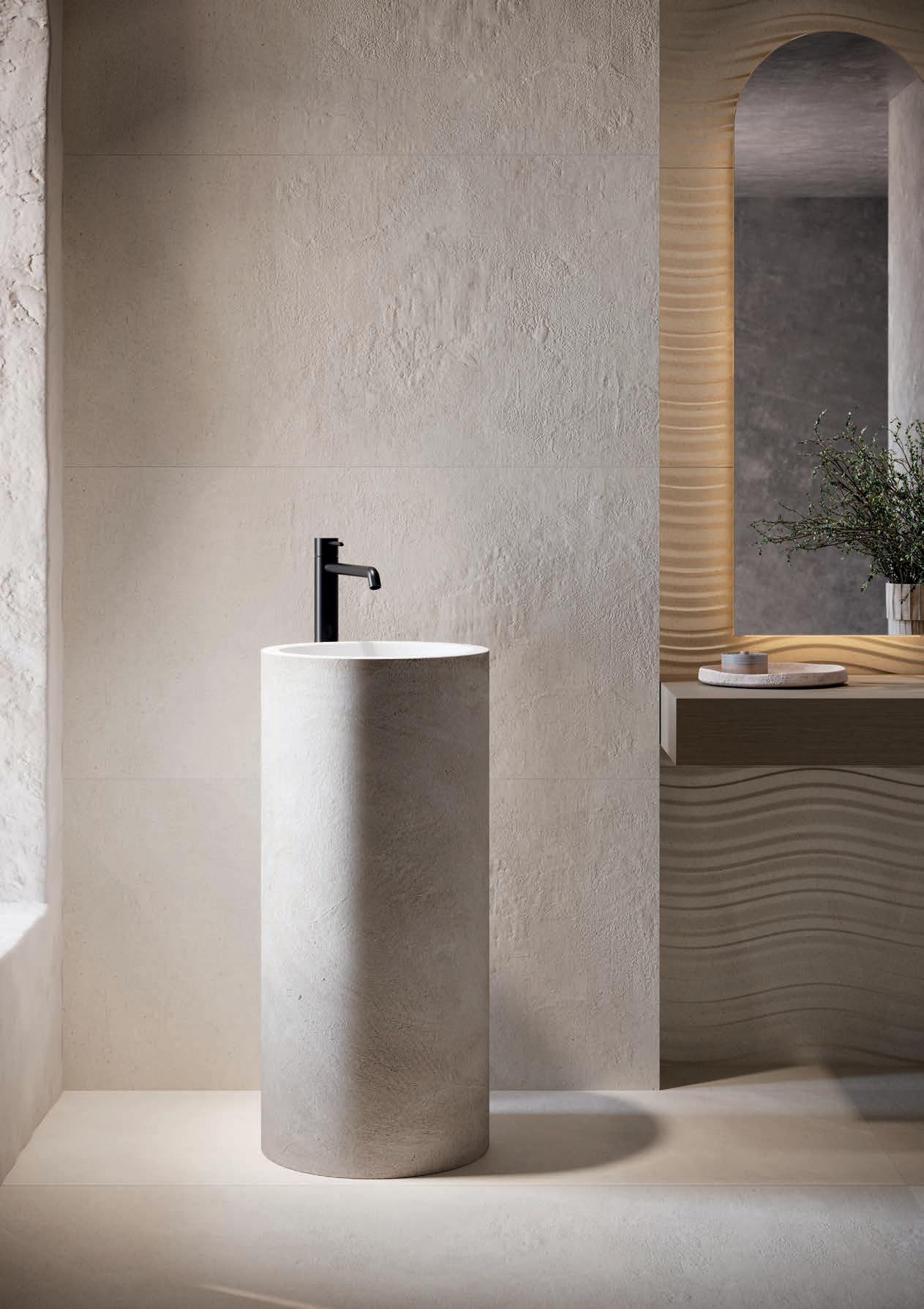 L’un des grands attraits d’Eclipse réside dans la variété de ses finitions. La collection est disponible aussi bien dans la version classique lisse et soyeuse de Krion® Solid que dans une finition texturée microcimentée, appliquée à la main, qui fait de chaque pièce un objet unique doté d’un caractère propre. Cette dualité des finitions permet d’adapter la collection à différents styles d’intérieur, tout en conservant la qualité et la pureté du matériau.