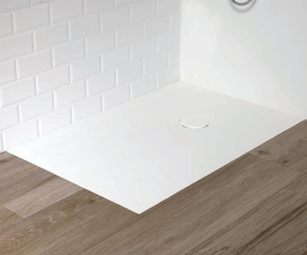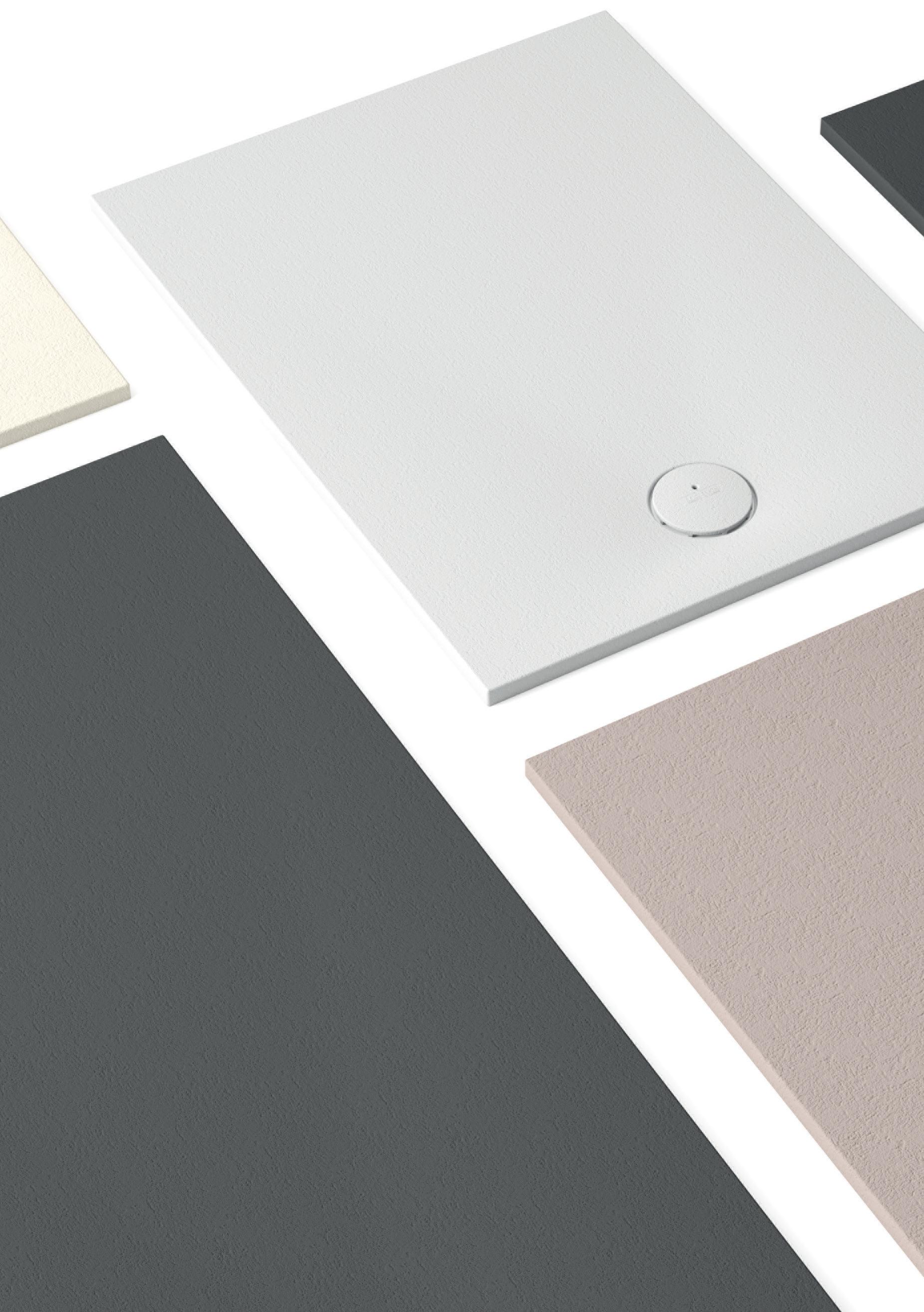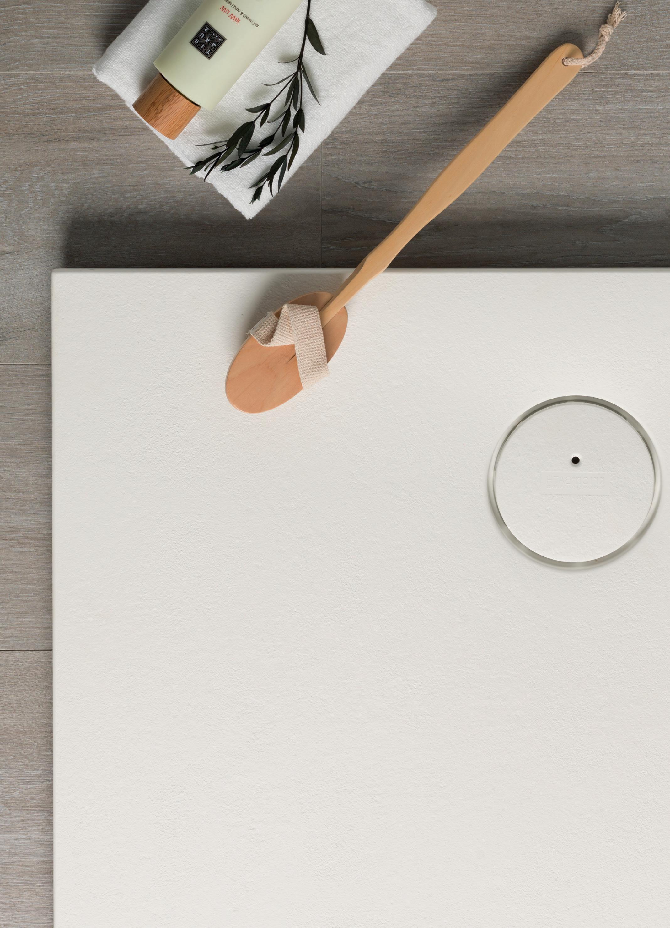 An extra-flat shower tray made using Krion Shell® technology, developed inhouse by Krion. Its new Rock texture is designed to avoid slipping while maintaining a homogeneous, simple and smoothshaped design over the entire surface. The perfect choice, thanks to its wide variety of standard sizes and its Silk or Rock textures in white.