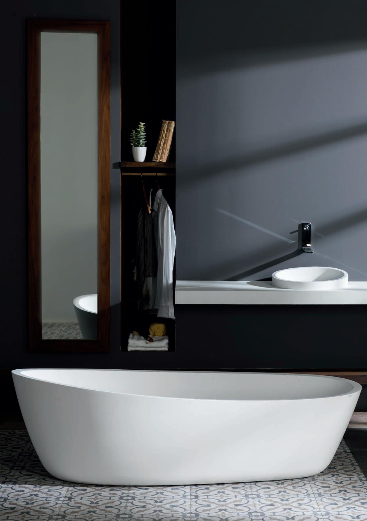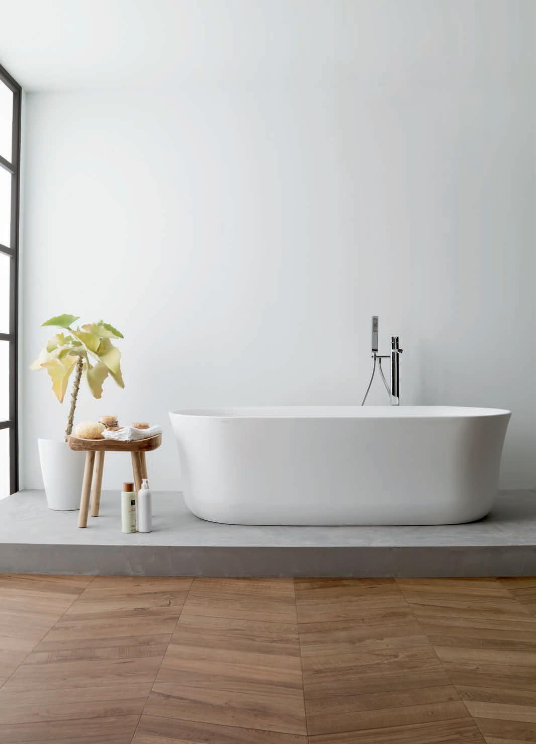 De formas suaves y redondeadas, la serie Almond transmite su esencia icónica, casi escultural, para hacer de tu baño un espacio único en el que belleza formal y ergonomía van de la mano. Fabricada en KRION®, presenta elementos freestanding en la opción de bañera, lavabo a suelo y lavabo de semiencastre.