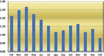 - Cotización Promedio Marzo Máxima Anual 8 46 Mínima Anual 5 26 Promedio 02/19 5 74 Promedio 02/20 5 79