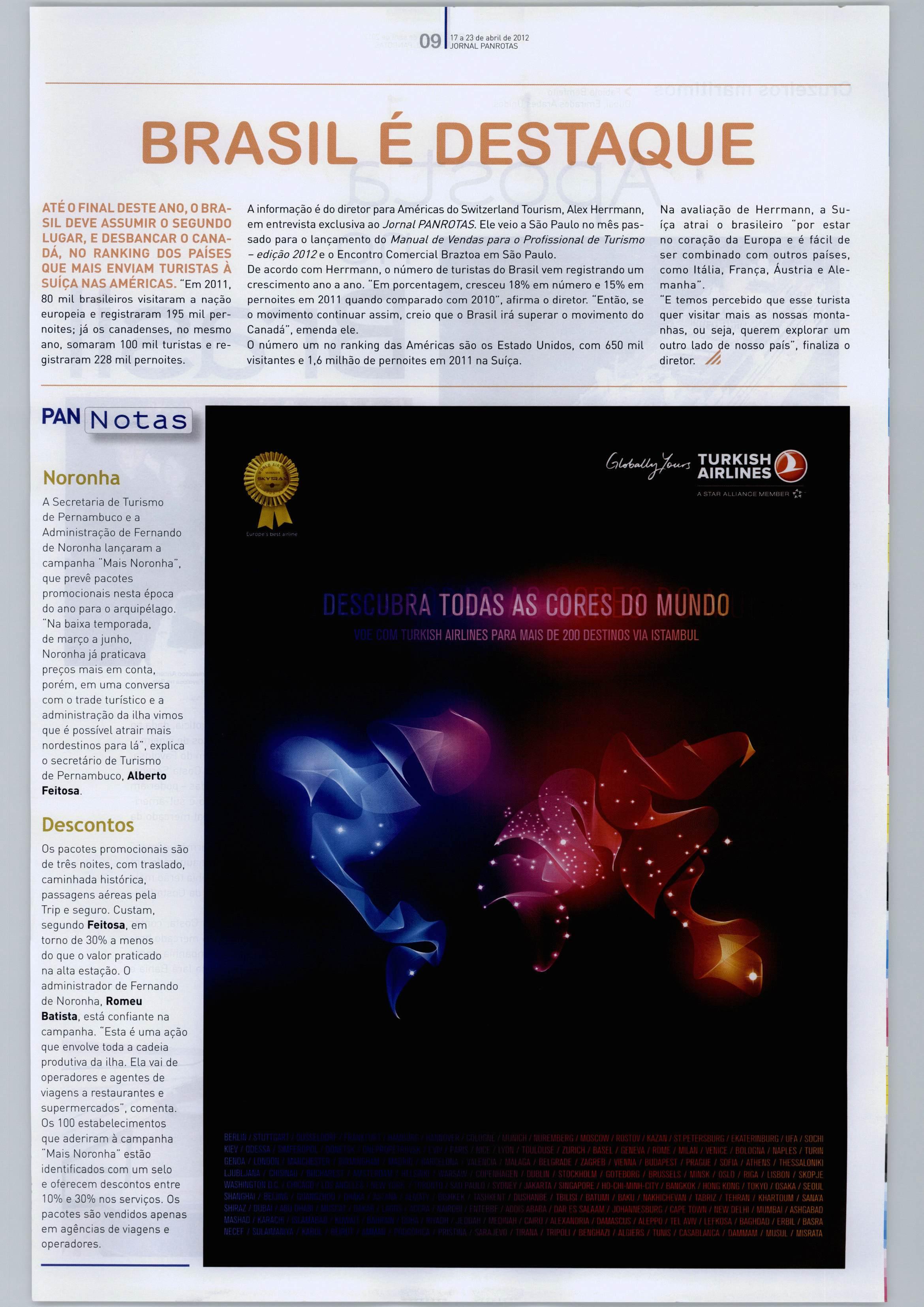 Começa a circular noPow Wow, que acontece entre 21e26deabril, emLos Angeles, nos EUA, a edição 2012do BrazUian Overview. "O objetivoé apresentar o Brasil ao mercado internacional. Eo momento não poderia ser melhor, já que o mundo está de ollio no potencial brasileiro", diz GuiUermo Alcorta, presidente da PANROTAS, que já publica o OverviewUá 20 anos. Impresso exclusivamente em inglês, com muitos gráficos e tabelas, a publicação fazum raio-x do Brasil por seu potencial econômico, mostrando a grandiosidade do mercado esua capacidade de consumo, com destaque para o segmento turístico brasileiro. A edição será distribuída ao mercado internacional noPowWowe também circula nos eventos internacionais que a PANROTAS realiza ou participa. OBrazUianOverview2012 poóe ainda ser adquirido diretamente no vww.panrotas.com.br ouno (111 2764-4816 aovalor de R$ 29,90. ^