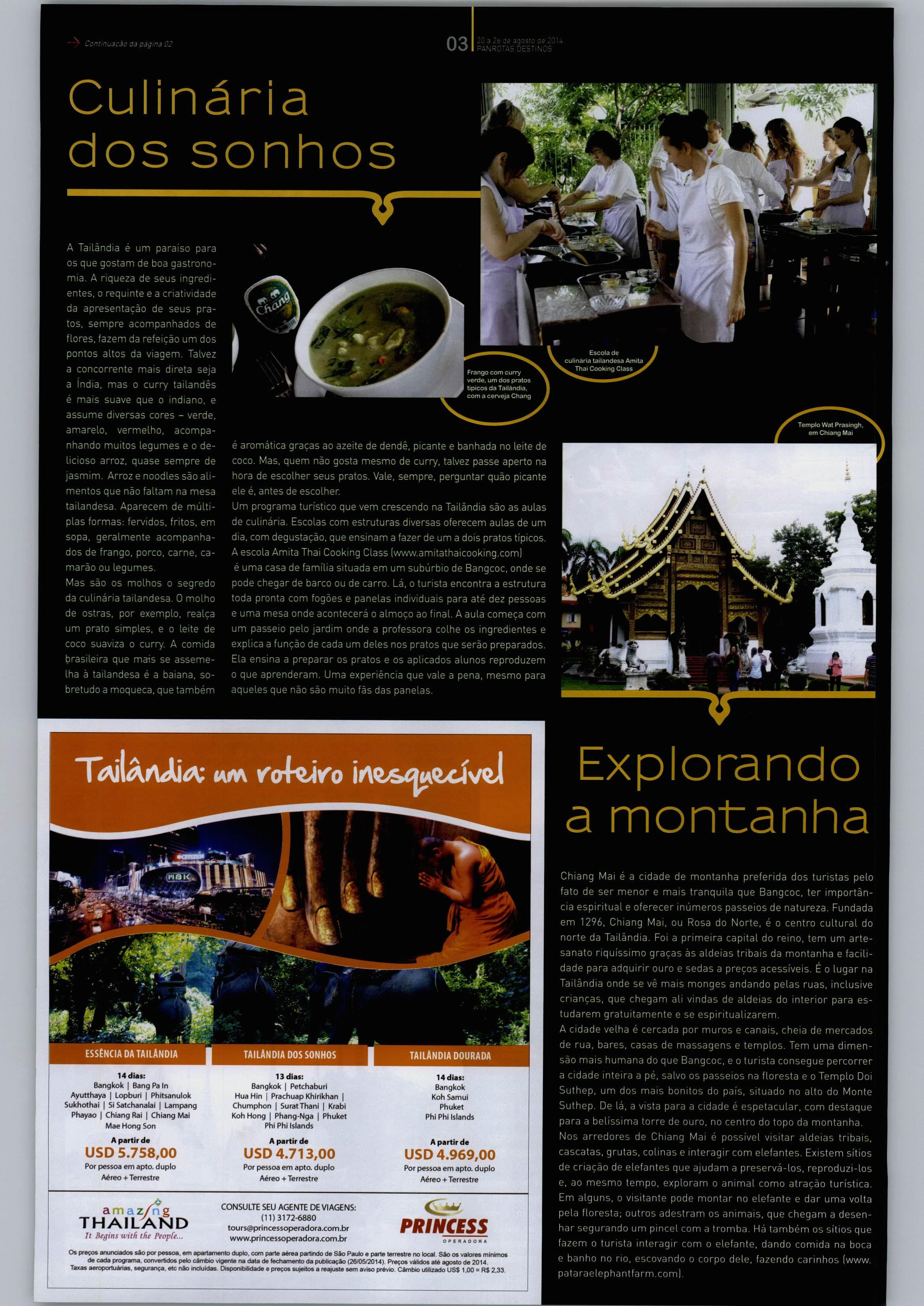 éaromáticagraçasaoazeitede dendê, picanteebanhadanoleitede coco. Mas, quemnãogostamesmodecurry.talvezpasseapertona horade escolher seus pratos. Vale, sempre, perguntar quãopicante ele é, antes de escolher Um programa turísticoquevem crescendo naTailândiasãoas aulas de culinária. Escolas com estruturas diversas oferecem aulas de um dia.comdegustação,queensinamafazerdeumadoispratostípicos. Aescola Amita Thai Cooking Class (wvw.amitathaicooking.com) éumacasade família situadaemumsubúrbiode Bangcoc. ondese pode chegar debarcooude carro. Lá,o turista encontra a estrutura todaprontacomfogõese panelas individuaisparaatédez pessoas euma mesa onde acontecerá o almoço aofinal.Aaula começa com um passeio pelojardimondea professora colheos ingredientes e explicaafunçãodecadaumdelesnospratosque serão preparados. Elaensinaa preparar ospratoseosaplicadosalunosreproduzem oque aprenderam. Uma experiência quevaleapena, mesmo para aqueles quenãosãomuitofãsdas panelas.