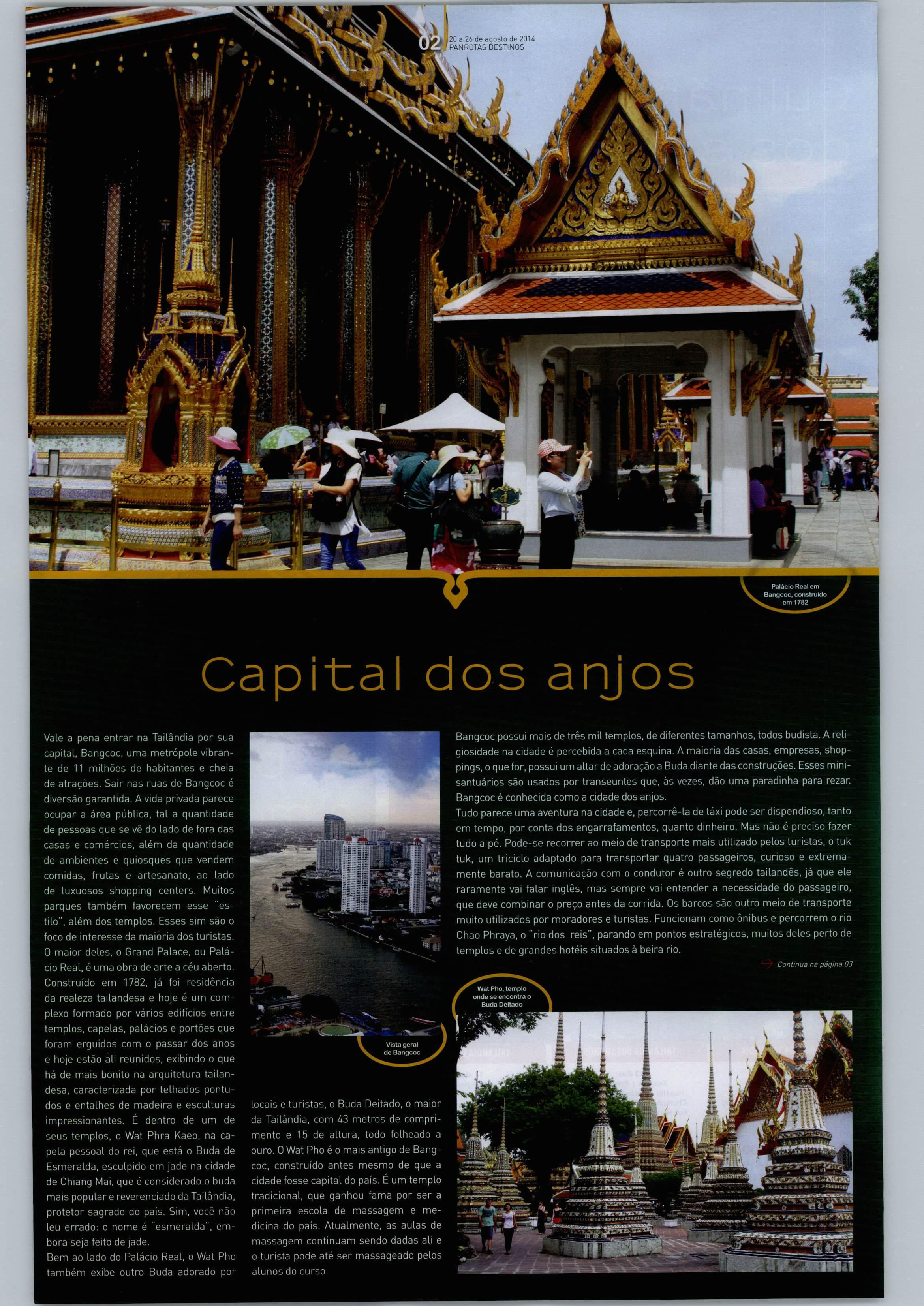 Vale apena entrar naTailândiapor sua capital,Bangcoc.uma metrópole vibran te de 11 milhões de habitantes e cheia de atrações. Sairnas ruas deBangcocé diversão garantida. Avidaprivada parece ocupar aárea pública, tala quantidade de pessoas quesevêdoladodefora das casas e comércios, além da quantidade de ambientes e quiosques que vendem comidas, frutas e artesanato, ao lado de luxuosos shopping centers. Muitos parquestambém favorecem esse"es tilo", além dos templos. Esses sim são o foco de interesse da maioria dos turistas. O maior deles, o Grand Palace, ou Palá cioReal.é uma obra de arte a céu aberto. Construídoem 1782, já foi residência darealeza tailandesa ehojeéumcom plexoformadoporváriosedifíciosentre templos, capelas, palácios e portões que foram erguidos como passar dos anos ehoje estão ali reunidos, exibindooque háde mais bonito na arquitetura tailan desa. caracterizada por telhados pontudos e entalhes de madeira e esculturas impressionantes. É dentro de um de seus templos,oWatPhraKaeo,naca pelapessoaldorei,queestáoBudade Esmeralda, esculpido em jade na cidade deChiangMai.queé considerado obuda maispopularereverenciadoda Tailândia, protetor sagrado dopaís.Sim.vocênão leu errado: o nome é "esmeralda", em bora seja feitode jade. Bem ao lado do Palácio Real. o Wat Pho também exibe outro Buda adorado por