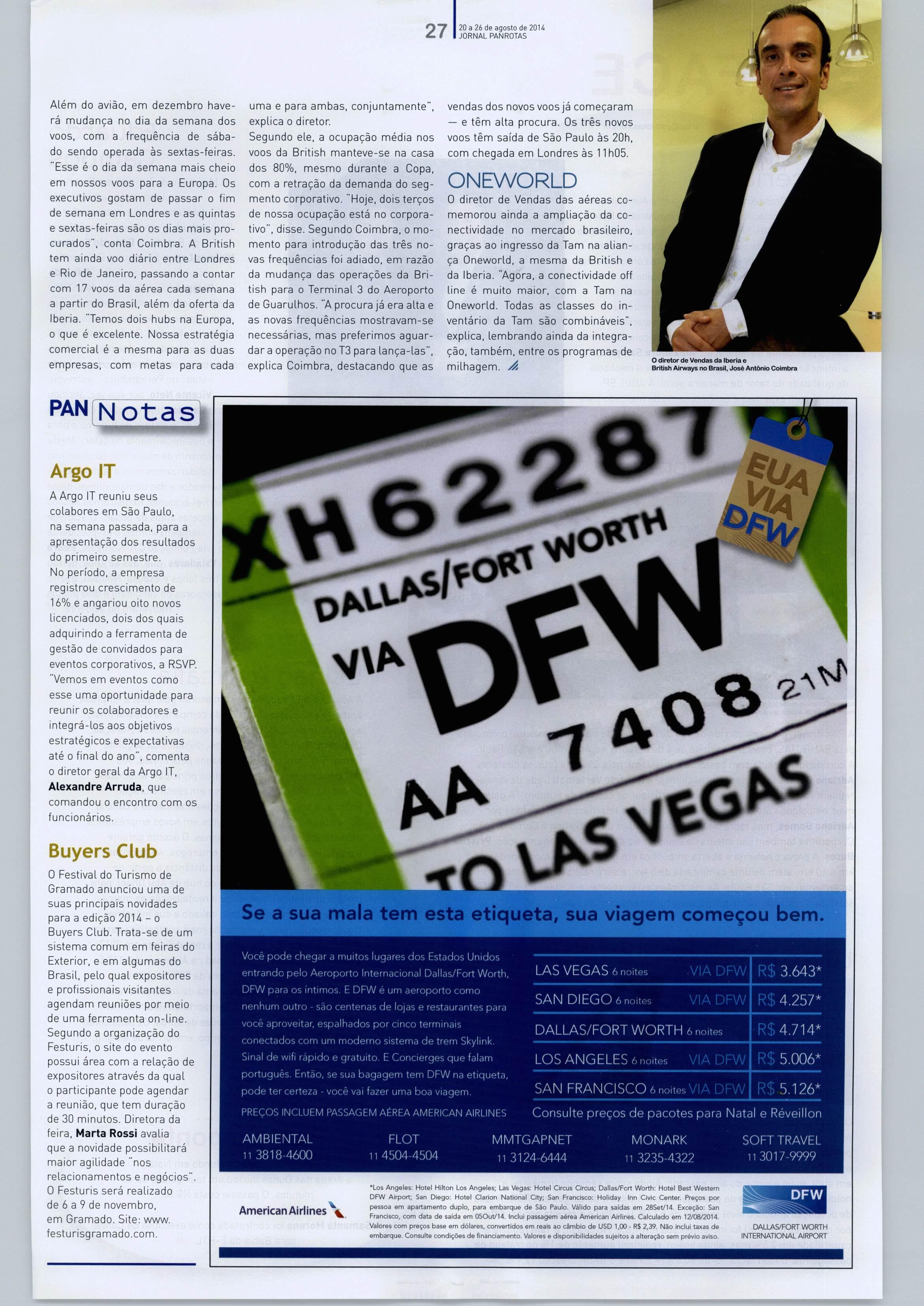 2014 éum ano defesta e celebrações noturismo brasileiro! A que marca as bodas de prata da Braztoa e as quatro décadas deumdosmais relevantes veículosde comunicação do turismo nacional Atentoe registrando a evolução do mercado enosso parceiro em vários projetos eeventos.No Jornal PANROTAS acompanho as coberturas dos fatos mais relevantes do setor A editora está sempre olhando para ofuturo, trazendo as tendências e projeções para que seus leitores possam estar muito atualizados. Quevenhamos próximos 40 anos!