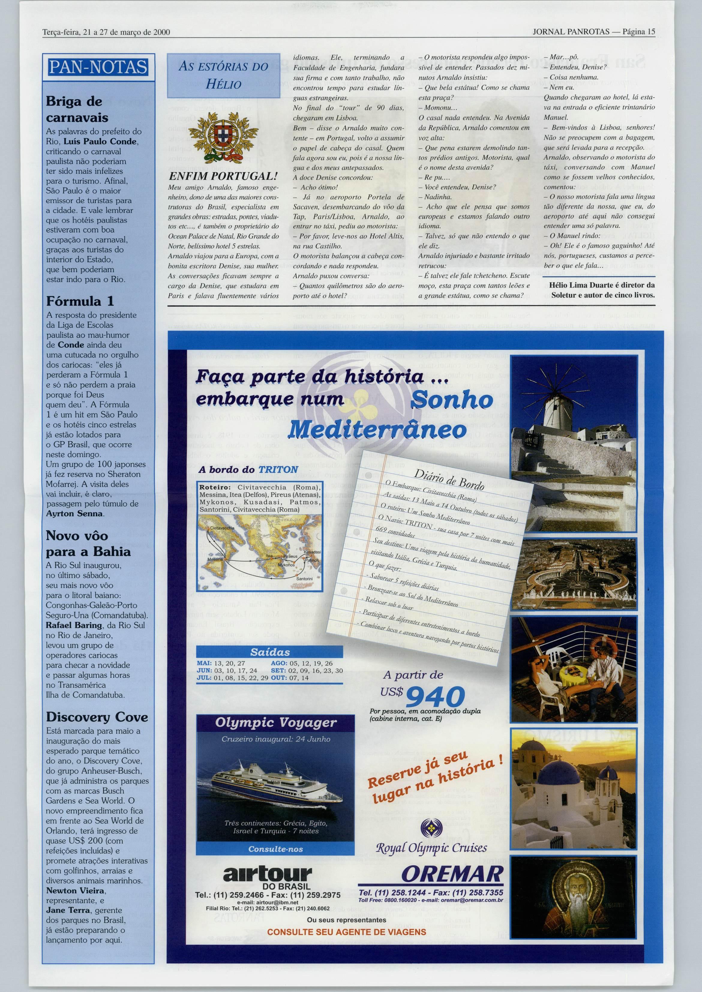 na Sapucaí. Distribuidores Camarote dos 500 Anos em Salvador: Alexandre Bariliari, João Cláudio, diretor de marketing da Bahiatursa. a baiana Marli Portela, e Victor Fasano. Luis Miguel com o gerente geral do Sheraton Córdoba, Marcelo Moretti. que era gerente executivo do Sheraton Rio. No Palácio Imperial Schõnbrunn, 1 em Viena, Teresa 'Perez, Davtd ^ogers, presidente da Abercrombie & Kent, e Kristi Jones, diretora de marketing. PAN ROÍAS EXPEDIENTE Propriedade: PANROTAS Editora Ltda. Matriz: Av. Jabaquara, 1.761, São Paulo, ()4()45-901, tel. (II) 5070^800, fax (11)2761602- Filial: Av. Rio Branco, 277. sala 1602. Rio de Janeiro. 2(KM0-(X)9. tels. (21) 2200249 e 24Ü-9443 e fax (21) 220-3741. REDAÇAO Editor: Artur Luiz Andrade E-maii: anur.panrotas@uol.com.br Repórteres: Nicolas Borges. Maria Izabel Reigada c Isalielle Somma (SP) Rio: Maysa Torres e Glauce Cavalcanti Revisora: Thaize Nunes Marcelino A.ssi.stetite de Redação: Patrícia Barbosa Fotógrafos: João Bastos. Emerson de Souza (SP) e Marluce Balbino (RJ) DEPARTAMENTO COMERCIAL Diretor financeiro: João Bastista de Rezende Coordenação de Vendas: Fernando Begara Promotores: Antonio Jorge Filho. Jorge Karapipcris, LuísCarlosBorges.WilsonRoldan Gerente Rio de Janeiro: Durlene Mello Chefe de Assinaturas: Valderez Wallner ARTE E GRÁFICA Coordenação e Tráfego: Alice I.de Re7£nde e Ronei do Na.scimento de Lacerda Terça-feira, 21 a27demarçode2000 Descontração emeventodo Canadá: Martin Jansen. Renata Ribeiro e Alexandre Cinque,da Queensberry. Carlos Alberto Carvalho, da Leiser. Marcus di Tommaso, da Maktour, e Antônio Aulisio, da Flot, durante palestra deStephen Katntz, na Ambiental. Diagrumação: Juarez Estevarn dos Santos Editoração Eletrônica; Eduardo Araújo de Oliveira. Maria da Penha Campregher e Lucien Louis Liefquin Tratamento de Imagcas: José Fernando Bertolo dos Santos Gerente de Produção: Newton dos Santos O acabamento ea impressão são da Lis Gráfica e Editora Ltiia. (Rua Felício Antonio Alves, 370 Bonsucesso/Cuaruthos). Informe Publicitário informativo us 586 3 imtD Ho»l En^lades Delta + 41.000 SkyMiie \i, 1 U$ 586 4 dias Hinivan {/U)W A Delta + 41.000 Skyniln u$ 899 3<fisCarToDnnnivElc/U)W A Delta + 44.000 Sk/Híls US 895 4 noíRs Aodas Sl Germain Café da lianhã swístoir US 885 3noites Hotil Aademia Traslatto de chegada /IIÍtalÍ3 Caféda Manhã US 3 noitesHotelCamino Real Traslados 1069 ^aeromexico. htpi Ml pem a 0^ nUn ffiipA Ininé» ütoi UoPiiile be éi jaewe ho leàiis* ti» iiide* toemi «IR» 1 dii#efiibil*di - ImfaipieMosas £* lemçíe depirmíseu itínia («âma eOBi bMbsn dOBéMrmaAi urtiM 1 ahira^ i«a prm iim PACOTES BRASfL ALTA TEMPORADA AEROTERRESTRE R mm n.VMHtH Passagem oéreo, trasladose hospedagem comcaféda manhã. Indui: ingressoparaoespetáculodaPaixãode Crtsto, títy tourcomvisitaaOlindae Caruarú Hotel Praia Othon em Recife A PARTIR DE 3X r.273 AVISTA R» 819 Inclui:Traslado Rlo/Búzios/Rio - senrtço regular 3t>octes Hotel Coloiina Park A PARTIR DE 3X r.195 AVISTA R* 566 BONITO Indui: Passáos naGrutado lago Azul.Balneário Municipale passeio de t>arco peloRioFormoso Hote) Exoen APARTIROE 3X r.296 À VISTA RS 888 CONDIÇÕES: Pcaços ein 11$ (Reais) Bm splo. DSL Pr«coseul»itoe 8 allera;Aa* Incluiparte aérsa em v6os regularat. fioaRtOagema pasielos conforme descrito» Váliao psra emBorques entre 12MAR e30JUN. eicelo lerieflo» Taxas da emt»rque nio Inclusas Lugaras limitados e suteHos a dtsponlblMlde. SÃOPAULO Tel.:10XX111257-9788 fax: 259-7833 E-mail: trode@tradetours.com RIODE JANEIRO Tel.:|0XX21)5O7-O686-rax 221-5480 E-moil Iroderio-gitradetourç com ASSINATURA (11) 5070-4814/15/16 Assinatura anual: 52 exemplares Postagem pelo Correio: como impresso R$ 30,00 (entrega em 7 dias) como carta R$ 102,00 (entrega rápida)