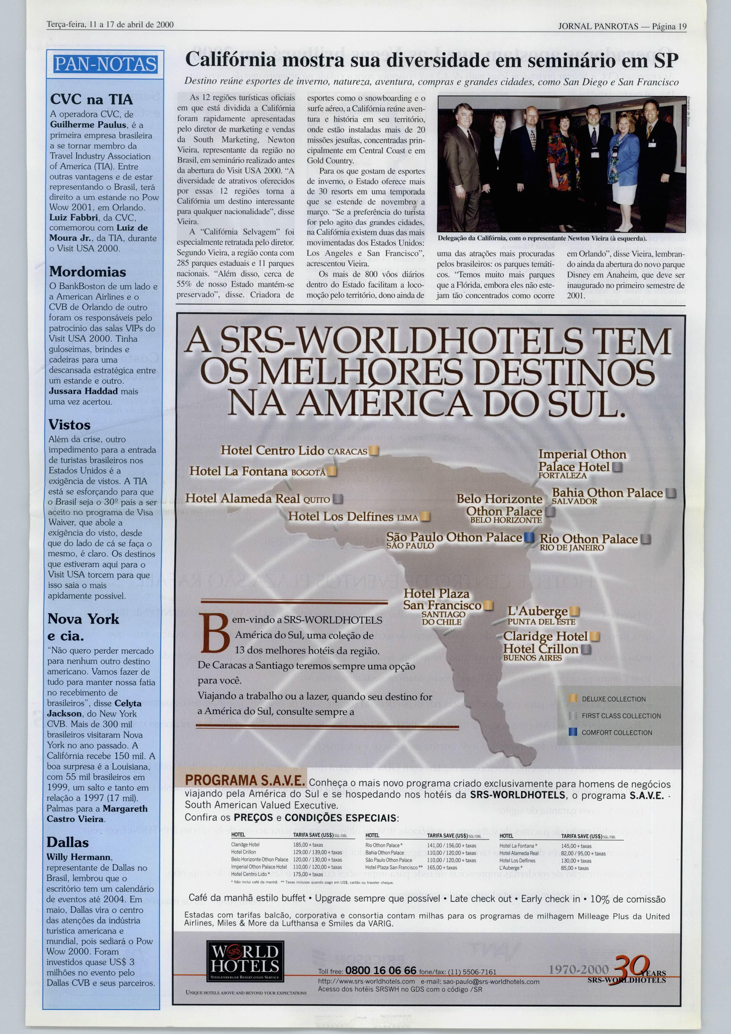 A edição 2000 dafeiraVisit USApodeser considerada um sucesso.Depoisdeumanonegro parao trálego deturistasentreo Brasil e os Estados Unidos foram 627 mil brasileiros visitando o Ho Sain em1999,umaquedade27% —,conseguirque 116 expositores americanostenhamvindoparaa feira, recebendo cerca de 1.800 profissionaisdeturismo,é,com certeza, uma vitória. Segundo o Departamento de Comércio dos Estados Unidos, a retomada do crescimento do mercado brasileiro já começou, eaexpectativapara esteanoédepelomenos3%.Os empresáriosacreditamemmais,e dizemjáestarsentindoumamelho ra. Destinos como LasVegas. Miami, Orlando. Boston, Califórnia e Nova York mostraram suas novi dades. como investimentos em equipaiTientos eatrações,epro moçõesespeciaisparaosbrasi leiros.Entreosqueacabamdeabrir escritórioderepresentaçãonoBrasil estão a Filadélfia, Nova York e Bal Harbour.Naspáginas14a23,traze mosreportagenscomacobertura completada feira, dosseminários aoseventossociais.Págs.14a23
