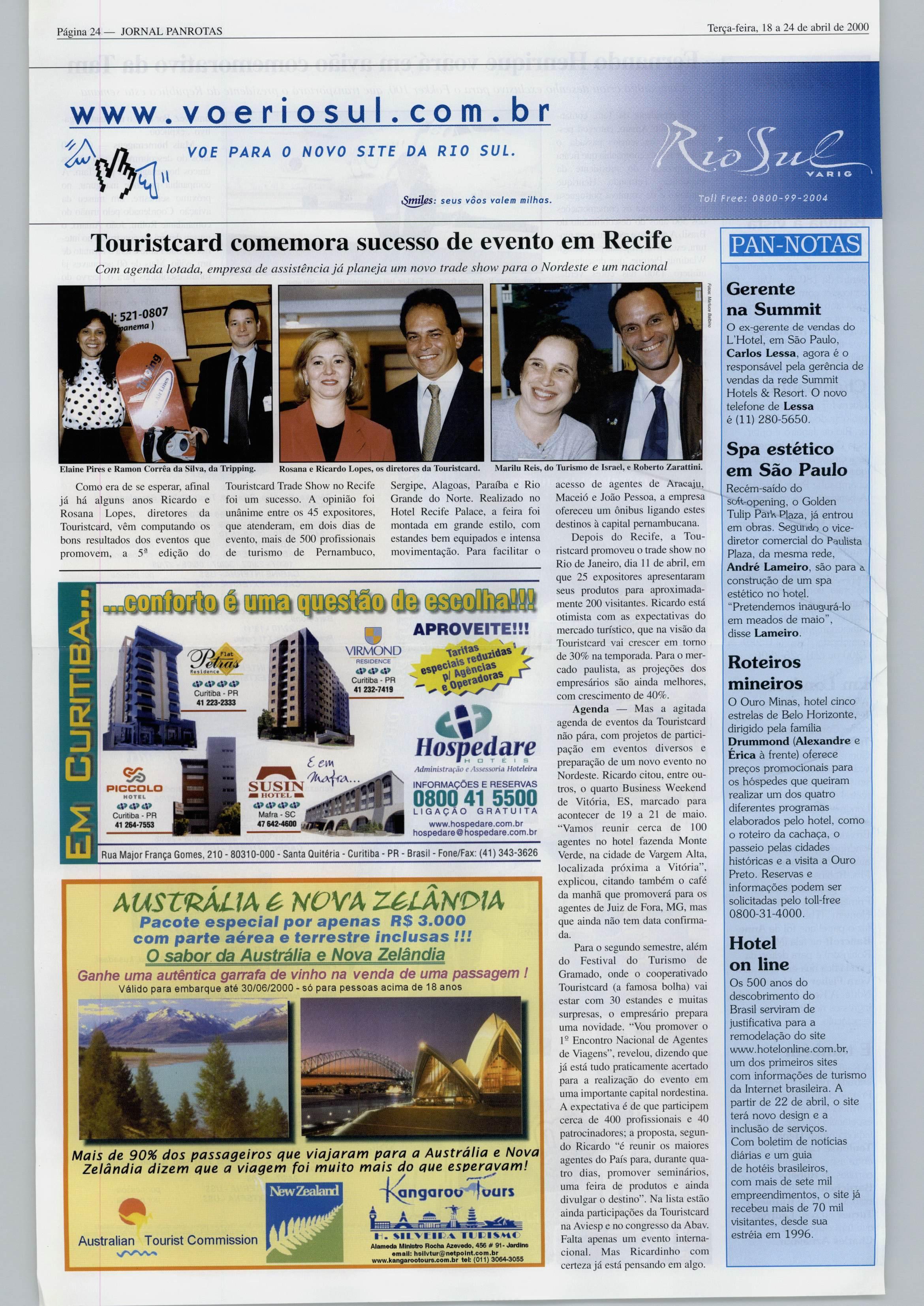 Aesquerda,ocasalRosana e lücardo Lopes, daempresade assistência em viagens, Touristcard. O llash é do evento (ia empresa noRiode Janeiro, mas aconteceu também o tradicional Trade Show do Recife, uma semana antes.O próximo será cm Vitória. EmSão Paulo. Kátiac Magdaia Castro, na abertura doHotel Travei Show.quetevedoisdias para os agentes de viagens.Ena terceira foto, Trícia Sander, da Orion, como presidente da Abav-PR, Antônio Azevedo, nosalãoda entidade. Haja evento. Éo que todo mundo Na semana passada, o salão fala—tantoexpositorescomo paranaense, emCuritiba,oseven-