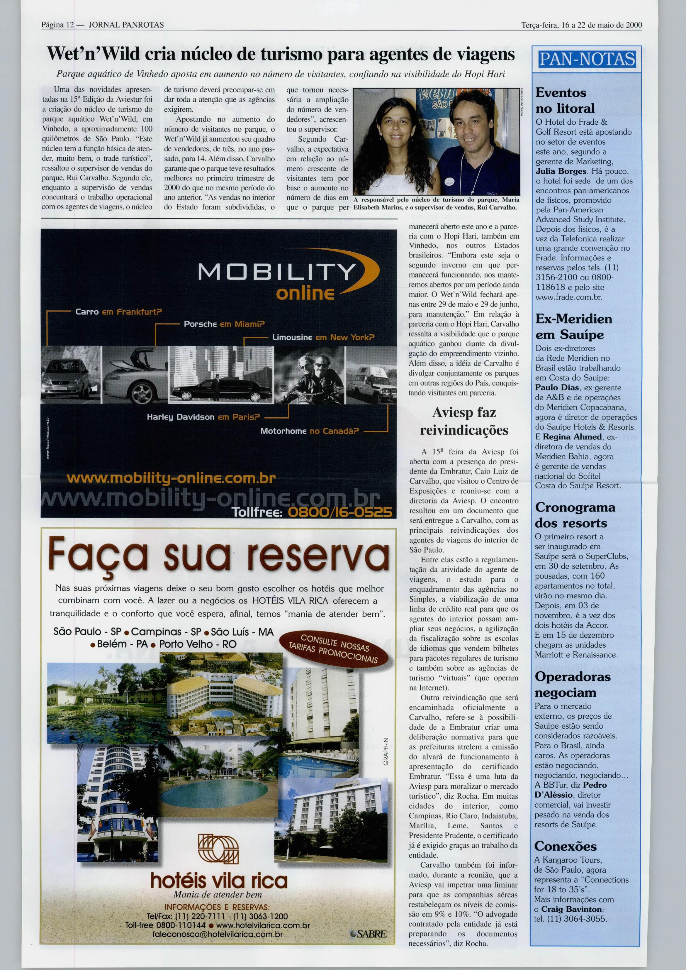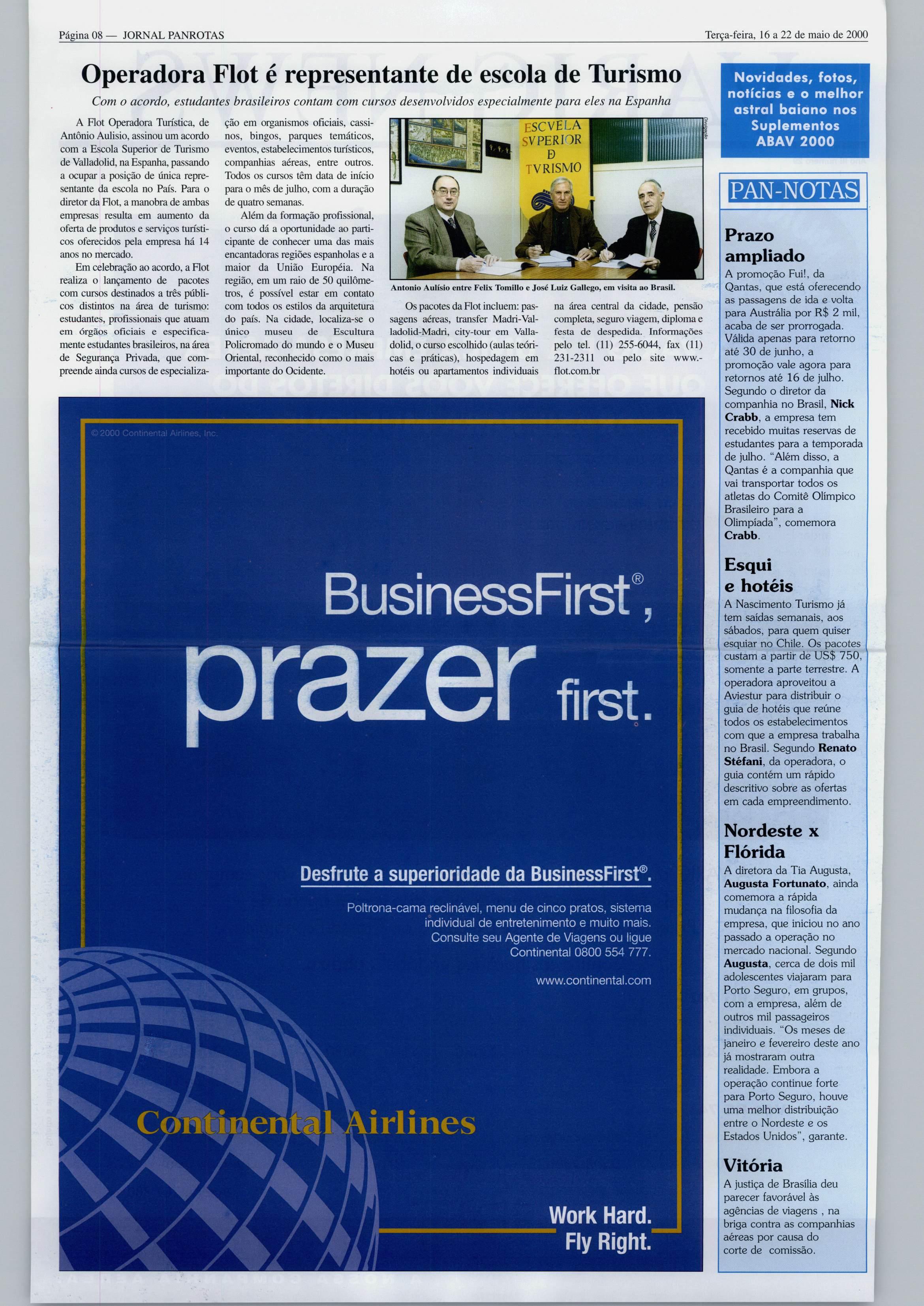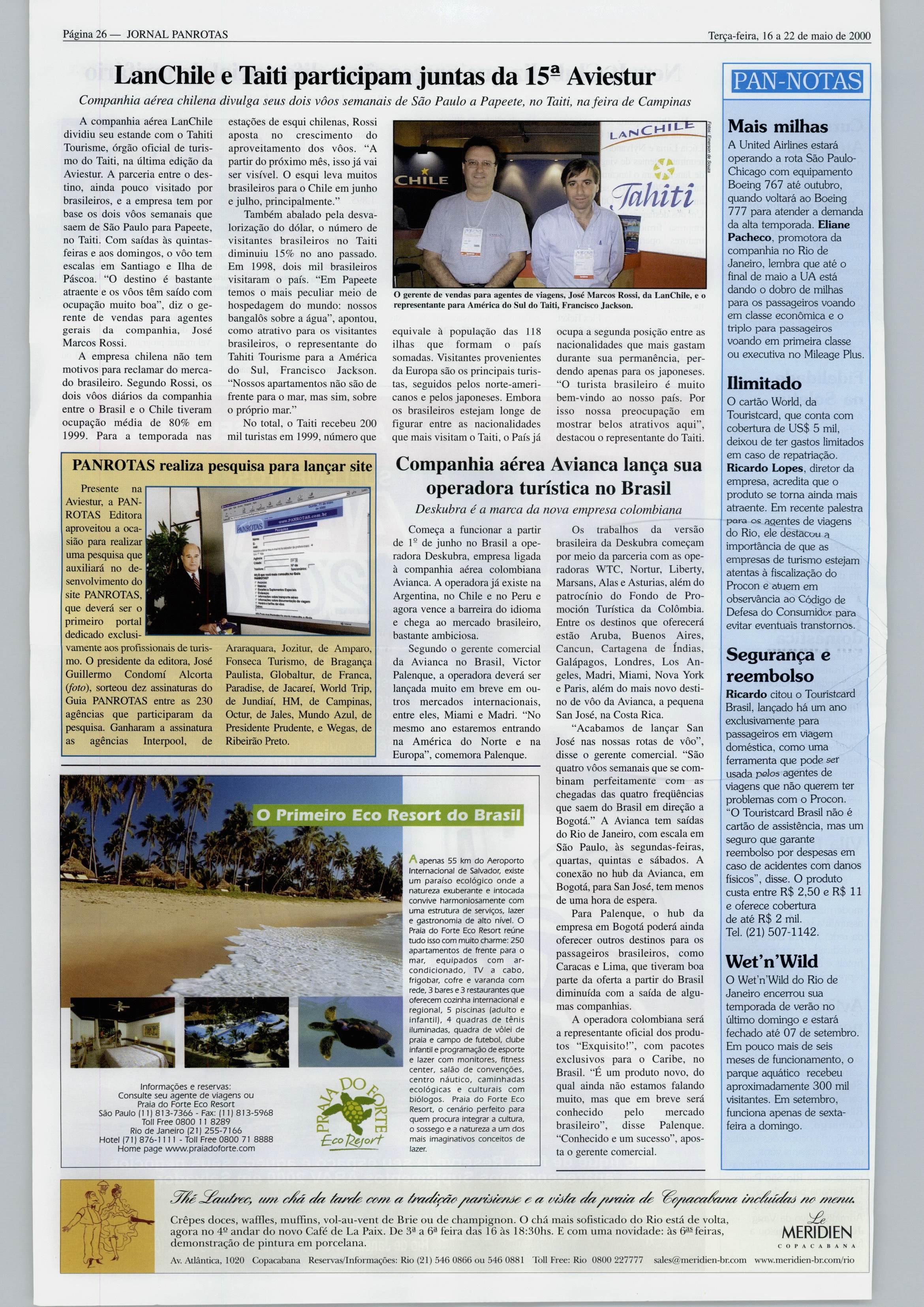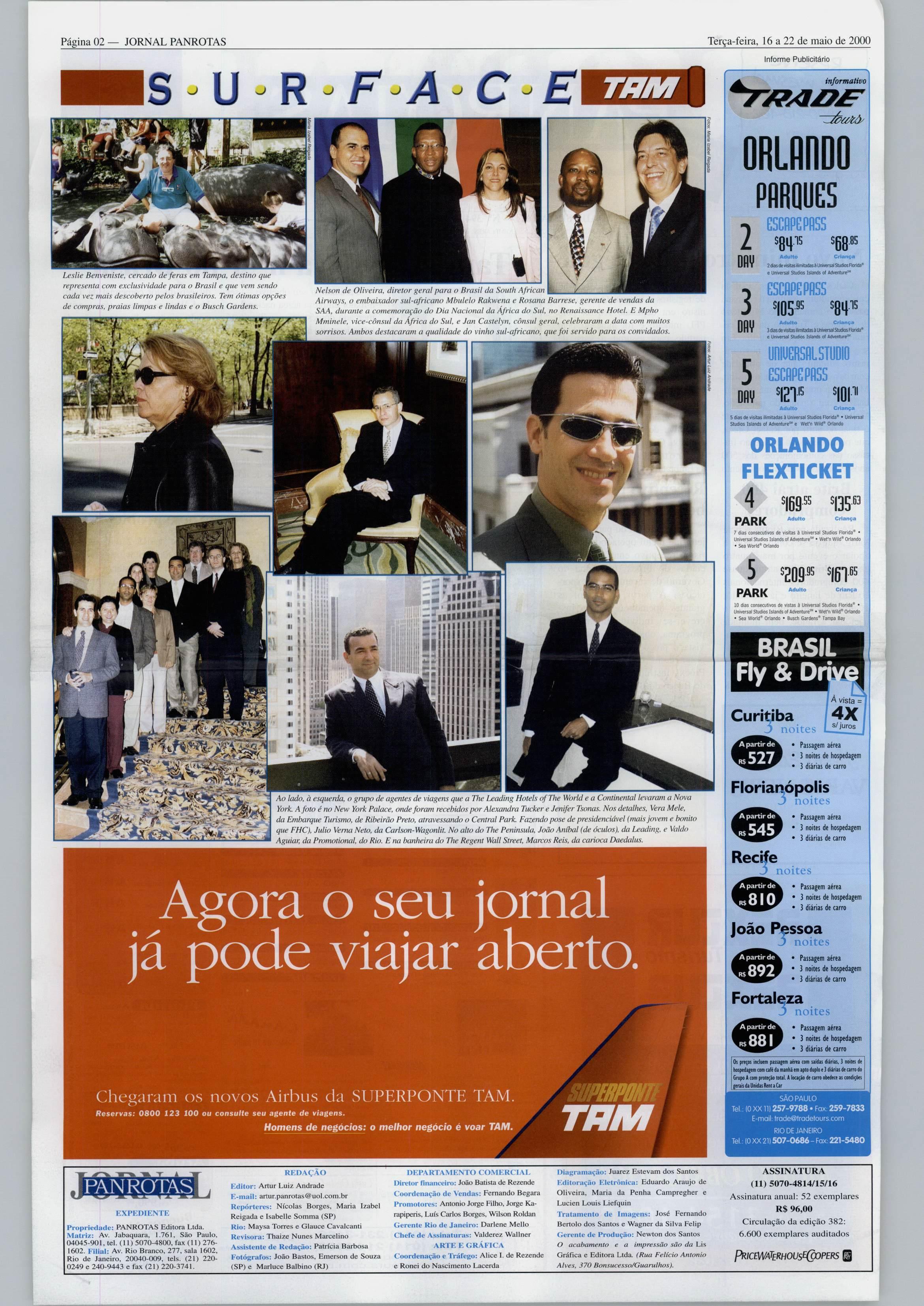 ogrupodeagentesde viagens queaTheLeading Hotéis of The World ea Continental levaram aNova York. Afotoéno New York Palace,ondeforam recebidos por Alexandra Tucker eJenifer Tsonas. Nosdetalhes. Vera Mele, da Embarque Turismo, de Ribeirão Prelo, atravessando oCentralPark. Fazendo posede presidenciável (maisjoveme bonito que FHC), Júlio Vema Neto, da Carison-Wagonlit. No alio doThePenínsula. JoãoAníbal(de óculos), da Leading. e Valdo Aguiar, da Pnmoiional, dt)Rio. EnabanheiradoTheRegem Wall Streei. Marcos Reis. dacarioca Daedaius Agorao seu jornal já pode viajar aberto. Chegaram os novos Airbus da SUPERPONTE TAM. Reservas: 0800 123 100 ou consuffe seu agente de viagens. Homens de negócios: o melhor negócio é voar TAM. PANROTAS KXPKDIENTR l'ii>|)rie<la(lc: PANROTAS Edilora Ltda. Matriz: Av. Jabaquara, 1.761, São Paulo, 04045-y{) l, lei. (11) 5070-4800. fax (11) 2761602. Filiítl: Av. Rio Branco. 277, sala 1602, Rio de Janeiro, 20040-009. leis. (21) 2200249 c 240-9443 e fax (21) 220-3741. REDAÇAO Kdilur: Artur Luiz Andrade F.-mall: artur.panrota-s@uol.com.br Repórteres: Nícolas Borges,Maria Izabel Reigada e Isabelie Somma (SP) Rio: Maysa Torres e Glauce Cavalcanti Rcvisura: Thaize Nunes Marcelino .Assistente dc Rcda^'ãn: Patrícia Barbosa Fotógrafos: João Ba-stos, Emerson de Souza (SP)e Marluce Balbino (RJ) DKPARI AMKN IO (OMKRCIAI. Diretor Unanccini: João Baiisia de Rezende Coordena(,-ão de Venda.s: Fernando Begara Promotores: Antonio Jorge Filho, Jorge Karapiperis,LuísCarlosBorges,WilsonRoldan Gerente Rio de Jancíni: Darlene Mello Chefe de Assinatura.s: Valderez Wallner ARTE E GRÁFICA Coordenuifão c Tráfego: AliceI.de Rezende e Ronei do Nascimento Lacerda THM l>iii}{r!ima<,-ão: Juarez Estevam dos Santos Editora«,-üo Eletrônica: Eduardo Araújo de Oliveira, Maria da Penha Campregher e Lucien Louis Liefquin Tratamento de Imagen.s: José Fernando Bertolo dos Santos e Wagner da Silva Felip Gerente de Prtidução: Newton dos Santos O acabamento ea impressão são da Lis Gráfica e Editora Ltda. (Rua Fetício Antonio Alves. 370 Bon.^ucesxo/Guarulhos). Informe Publicitário informativo ORLnnoo 2 DHV PHRQUGS fciUS8i|irvu.'líSS " sggfls Adulto Criança 2(lidS(}evi9t3sllirntt9C8SàUnh«nafStudiffi Flonda* e Ufiiversal SC/dios Islantls of A^vfTitur^* escflpepflss S|0595 sgnis Adwuo Criança 3 ftâs Mvisitas iiimisúasdUniverslStudies^tond^ üniverai Sluúlos Isiinds o* Adventun* UOlUeRSBLSTUDIO 5 CSCflPGPflSS duv Hir 11^' Adulto Criança S cias Devisitasilimitadasà Unnersai Studios Florida* Ufliversal Studios Islanús ot Adventure" Wet'n Wild' Orlando FLEXTICKET 4 S|gg.55 S|3S.63 PARK 7 Qias consecutivos dB visitas á Jniversal Studios Florida* * UniversalStudiQs Islandsof AdveirtLre'' Wel'n Wlld*Orlando Sea Wtirld" Orlando sjogss S|B-|.65 PARK 10 dias consecutivos de visras â Universal Stud'0$ Ronda* Uíijversal SfüiJjos Islânds of Adventure* Weí'n WHtí*Orlando Sea World' Orjando * Susch Gardens* Tampa Bay Á vista Curitiba 14X s/ juros * Passagem aérea *3 noites de hospedagem * 3 diáriasde urra Florianópolis J> Recife Passagem aérea 3 noites de hospedagem 3diáriasdecarro noites Passagem aérea 3 noites de hospedagem 3diáriasdecarro João Pessoa J noites Passagem aérea 3 noites de hospedagem 3diáriasdecarro Fortalc^za J noites Passagem aérea 3 noites de hospedagem 3diáriasdecarro Oipregos ídcImiti pimgem airu com saMai diáriu, 3nits de ho^edagem «nu cafí daminhá em iptcduplo (3 díáriai d(carro do Crupo it coB prote^total, i loca^ dt an« abedm u cmdí^ prMda Unidu Ktnt i Car SÃOPAULO TeL; (O XX11) 257-9788 •Fox:259-7833 E-mail: trade@frodetours.com RIODE JANEIRO TeL: 10XX 211507-0686 - Fox: 221-5480 ASSINATURA (11)5070-4814/15/16 Assinatura anual; 52 exemplare.s R$ 96,00 Circulação da edição 382: 6.600 exemplares auditados PRICBWATeRHOUS^PERS Q r
