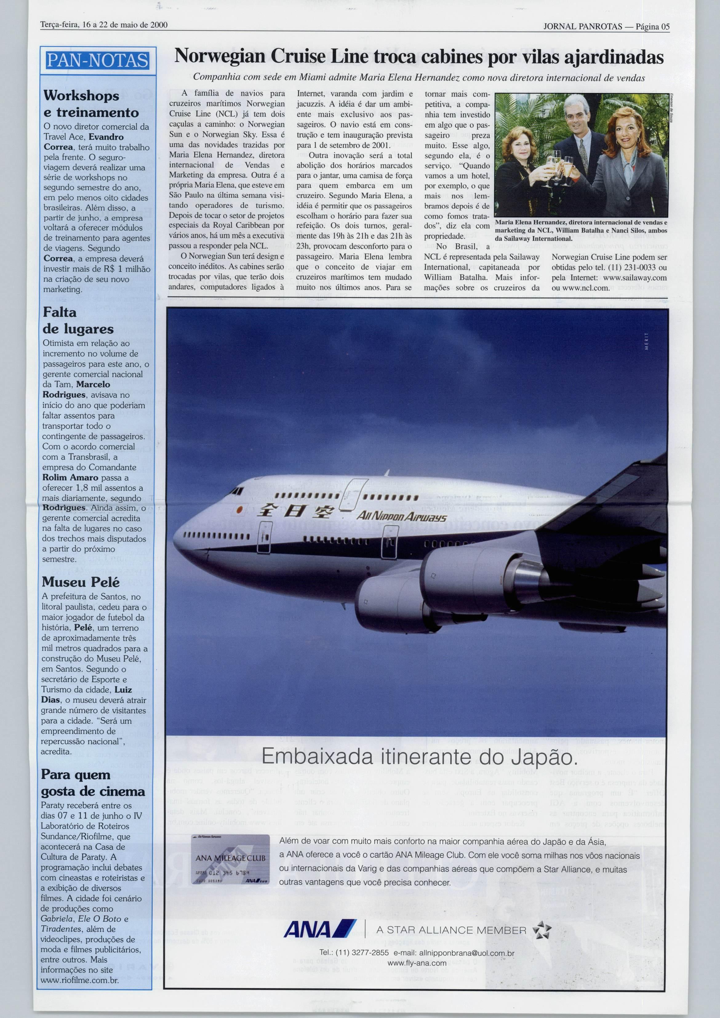 A família denaviospara cruzeiros marítimos Norwegian CruiseLine(NCL)játemdois caçulasacaminho:oNorwegian SuneoNorwegianSky.Essaé umadasnovidadestrazidaspor Maria Elena Hemandez, diretora internacional de Vendas e Marketingdaempresa.Outraéa própriaMariaElena,queesteveem São Paulo na última semana visi tando operadores de turismo. Depoisdetocarosetordeprojetos especiaisda Royal Caribbeanpor vários anos, há um mês a executiva passou a responder pela NCL.
