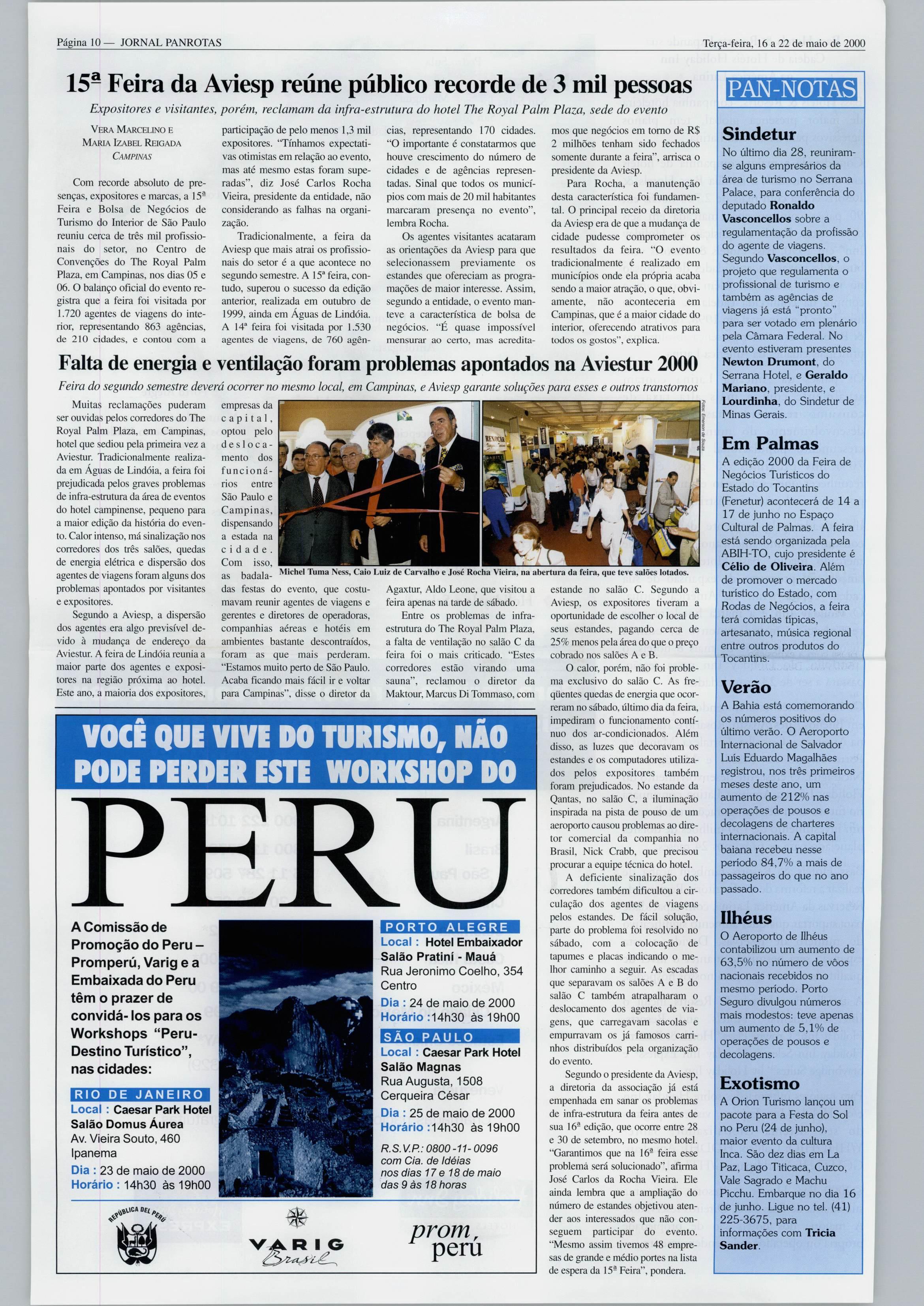 Cerca de R$ 2 milhões em negócios foram movimentados na 15-ediçãodaAviestur,realizada pela primeira vezem Campinas, segundo o presidente daAviesp, José Carlos da Rocha Vieira. A feiratevepúblicorecordecom maisdetrêsmil profissionais de turismo.Mas, problemas com a infra-estrutura do Royal Palm Plaza provocaram uma série de queixas.Págs.10a14.