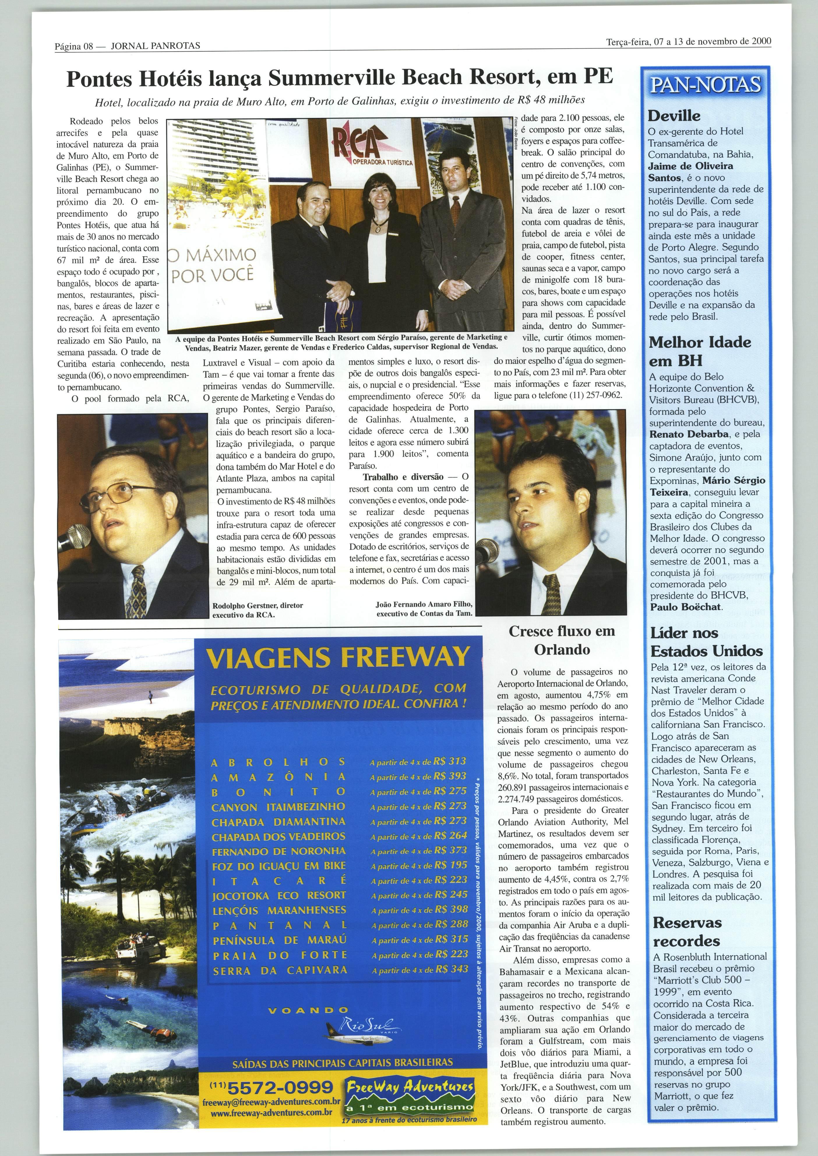 Está programada para20de dezembro, a inauguração do Sum merville Beach Resort. Localizado em Porto de Galinhas, na costa Sul de Pernambuco, o resort recebeu o investimento de R$ 48 milhões. Numa área de67 mil m^, o novo empreendimento do Grupo Pontes conta com um centro de con vençõescomcapacidadesuperiora 2.000pessoas,alémdetodaainfraestruturadeesporteelazercomuns aos resorts depraia.Pág.08