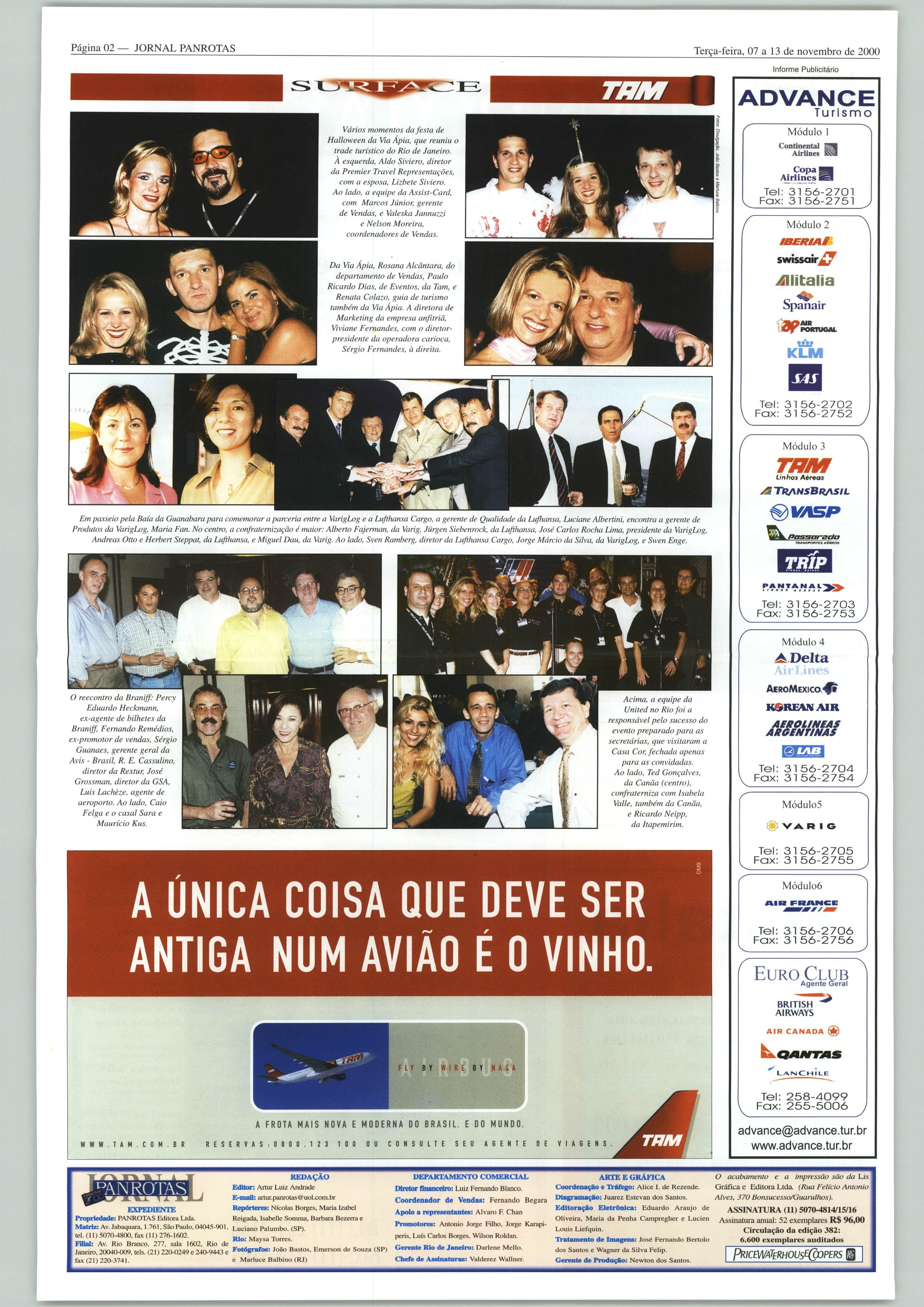 da Branijf: Percy Eduardo Heckmann, ex-agente de bilhetes da Braniff, Fernando Remédios, ex-promotor de vendas, Sérgio Guanaes, gerente geral da Avis • Brasil, R.E. Cassulino, diretor da Rextur, José Grossman, diretor da GSA, LuísLachèze, agente de aeroporto. Aolado,Caio Feíga eo casal Sara e Maurício Kus. Acima, a equipe da United noRio foi a responsável pelo sucesso do evento preparado para as secretárias, que visitaram a Casa Cor, fechada apenas para as convidadas. Aolado,Ted Gonçalves, da Canãa (centro), confraterniza com Isabela Valle, também da Canãa, e Ricardo Neipp, da Itapemirim. A ÚNICA COISA QUE DEVE SER ANTIGA NUM AVIÃO ÉO VINHO f LY BYWI R E B Y WWW.TAM.C0H.6R AFROTAMAIS NOVA EMODERNA DO BRASIL. E DO MUNDO. RESE R VAS ; Oe Q O.12 3 100 OU CONSULTE SEU AGENTE DE VIA6EN '^AN ROTAS \ A. tel. (11) 5070^800, fax (11) 276-1602. REDAÇÃO Edltcr: Artur Luiz Andrade E-mafl: aTtur.panrotas@uol.com.br EXPEDIENTE Repórteres: Nícolas Boi:gcs, Maria Izabel Pnqniedade: PANROTAS Editora Ltda. Reigada, Isabelle Somma, Barbara Bezerra e Matriz:Av.Jabaquara, 1.761,SãoPaulo.04045-901,LucianoPalumbo.(SP), Rio: Maysa Torres. Filial: Av. Rio Branco, 277, sala 1602, Rio de Janeiro, 200«M)09. tels. (21) 22CM)249 e 240-9443 e ^otógndos-. João Bastos, Emerson deSouza(SP) fax (21) 220-3741. e Marluce Balbino (RJ) DEPARTAMENTO COMERCIAL Dirrtor financeiro: Luiz Fernando Blanco. Coordenador de Vendas: Fernando Begara Apoio a r^rcsentantes: Álvaro F. Chan Promotores: Antonio Jorge Filho. Jorge Karapiperis, Luís Carlos Boiges. Wilson Roldan. Gerente Rio de Janeiro: Darlene Mello. Chefe de Asdnatnras: Valderez Wallner. ARTE E GRÁFICA >e IMfego: Alice I.de Rezende. Dtagramaçfto: Juarez Estevan dos Santos. Editoração Eletrônica: Eduardo Araújo de Oliveira, Maria da Penha Campregher e Lucien Louis Liefquin. Tratamento de Imagou: José Fernando Bertolo dos Santos e Wagner da Silva Felip. deProdoçio: Newton dos Santos. Informe Publicitário ADVANCE Turismo Módulo 1 Continental » Airlines ^ CopaM ^linesB Tel: 3156-2701 Fax: 3156-2751 í Módulo 2 ÊBERMÊ swissoir^^ /IliCalia Spanair SAS Tel: 3156-2702 X Fax: 3156-2752 Módulo 3 Tm¥ Irnhos Aéreos jSTí^nsBrasil TRIP Tel: 31 56-2703