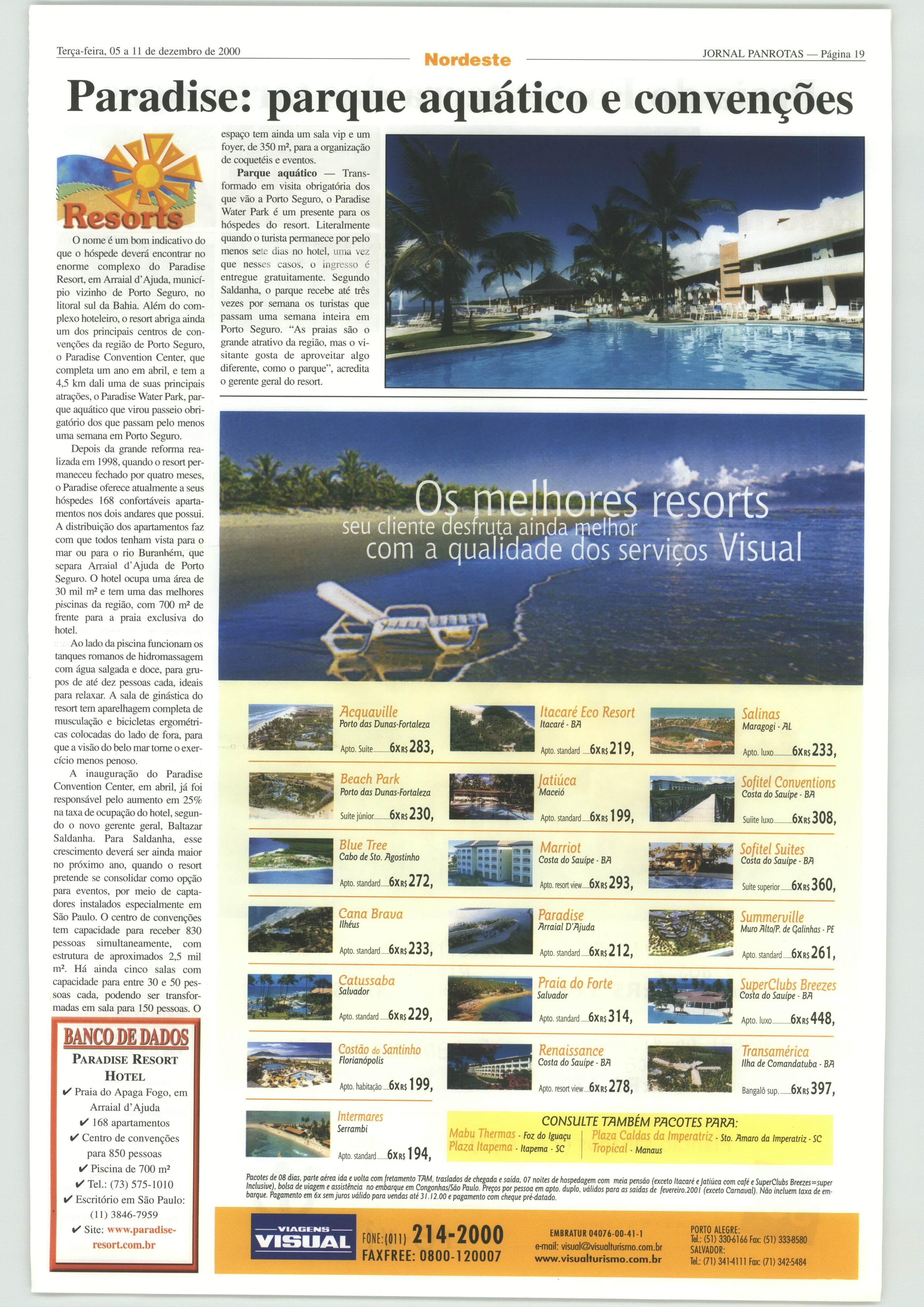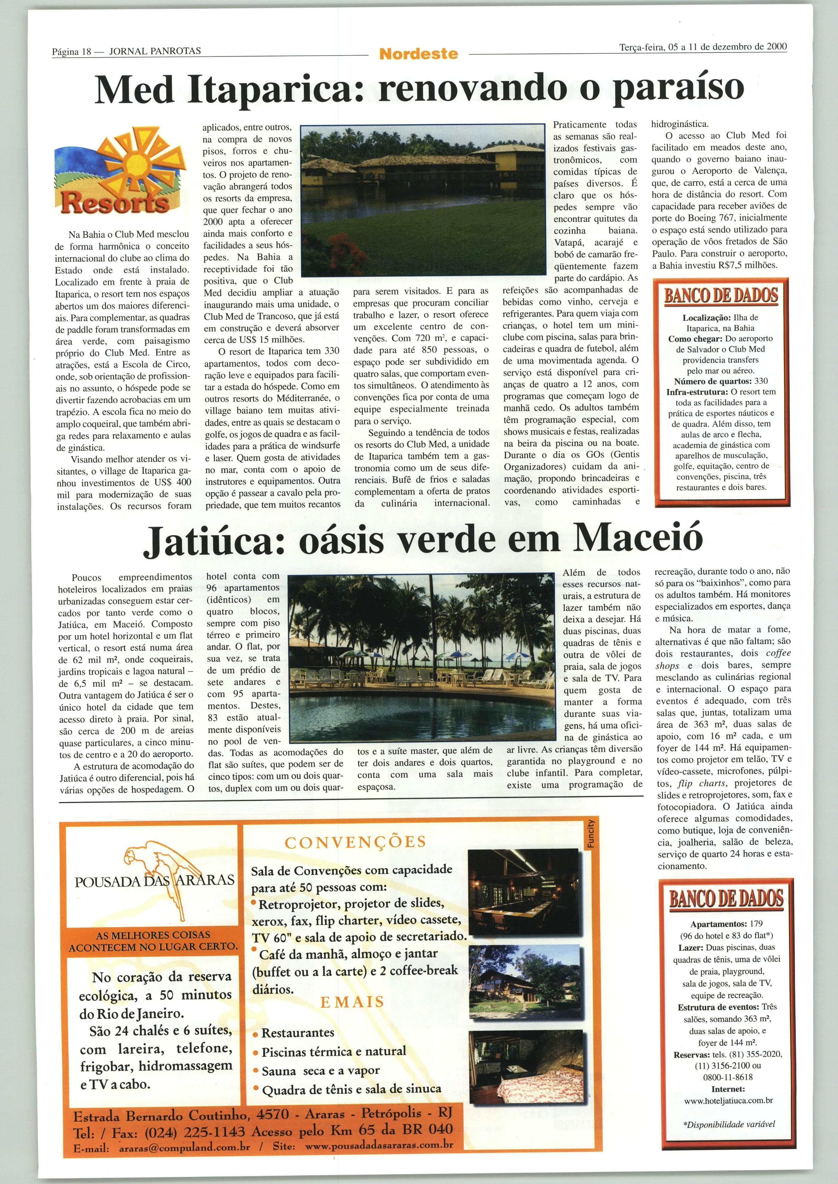 Nesta edição especial do Jor nal PANROTAS você encontrará reportagens sobreos principais resortsdoPaís, divididos por região. São37, passando por empreendimentos já tradicionais, comoosMédde Itaparica eRio das Pedras eo Transamérica Ilha deComandatuba,etambémpor novidadescomoCostadoSauípe, BlueTreeAngradosReiseSummerville. Apesar dea maioria estar no litoral, do Rio, Bahia, Pernambuco, Santa Catarina, entre outros Estados, há algumas boas surpresas pelointerior,como as pousadas Caiman, no Mato