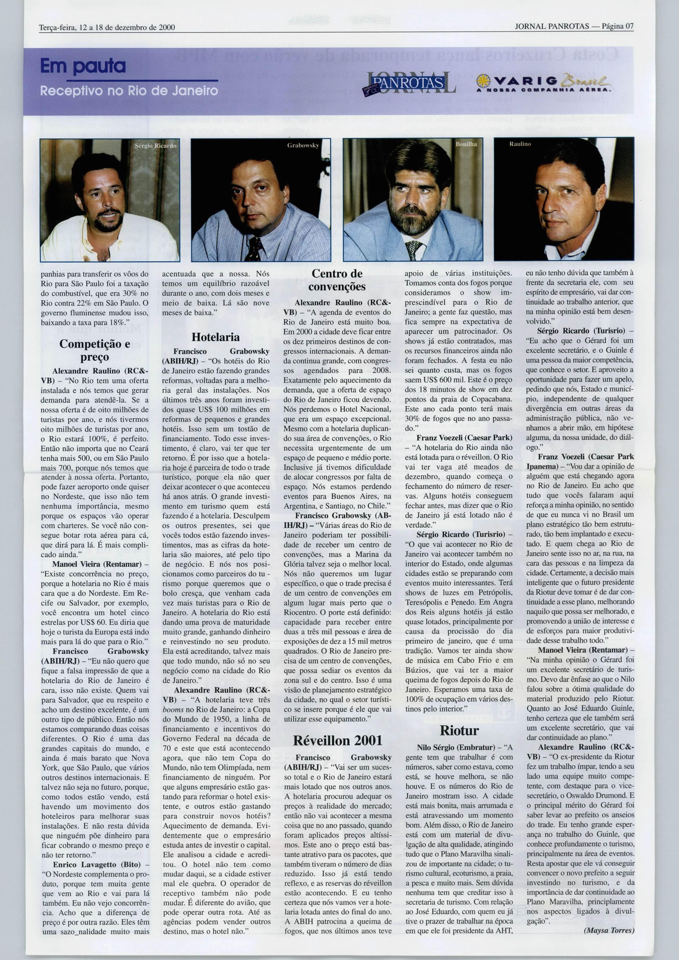 Luis Felipe Bonilha, Franz Voezeli, Nilo Sérgio Félix, Alexandre Raulino, Manuel Vieira,SérgioRicardo,Francisco Grabowsky eEnricoLavagetto debateram, a convite do Jornal PANROTAS,os rumos do turismo receptivo noRiode Janeiro para a série Brasil 21- Türismo éo Futuro. Págs.06e07