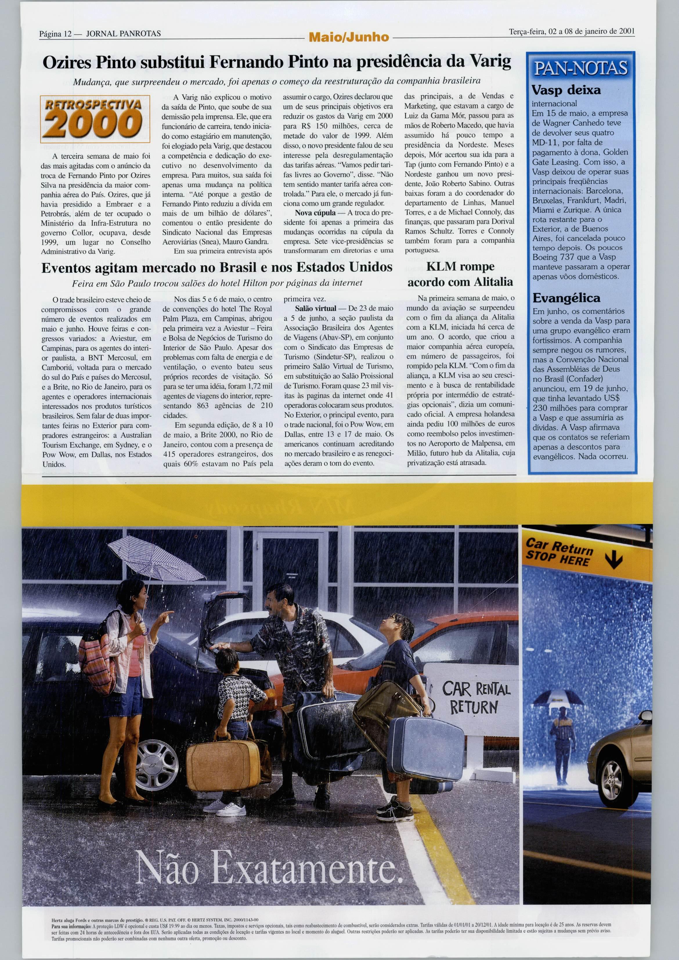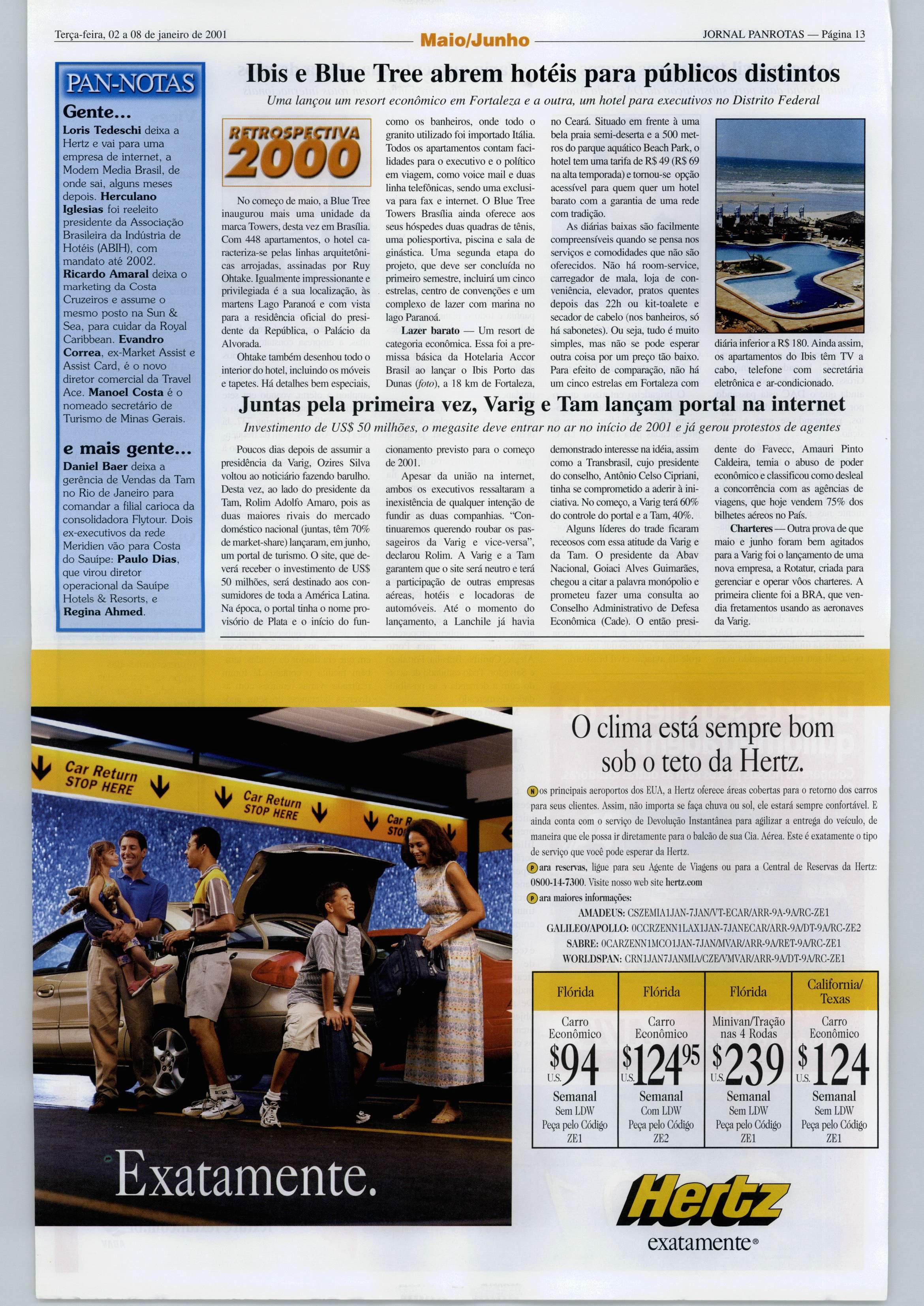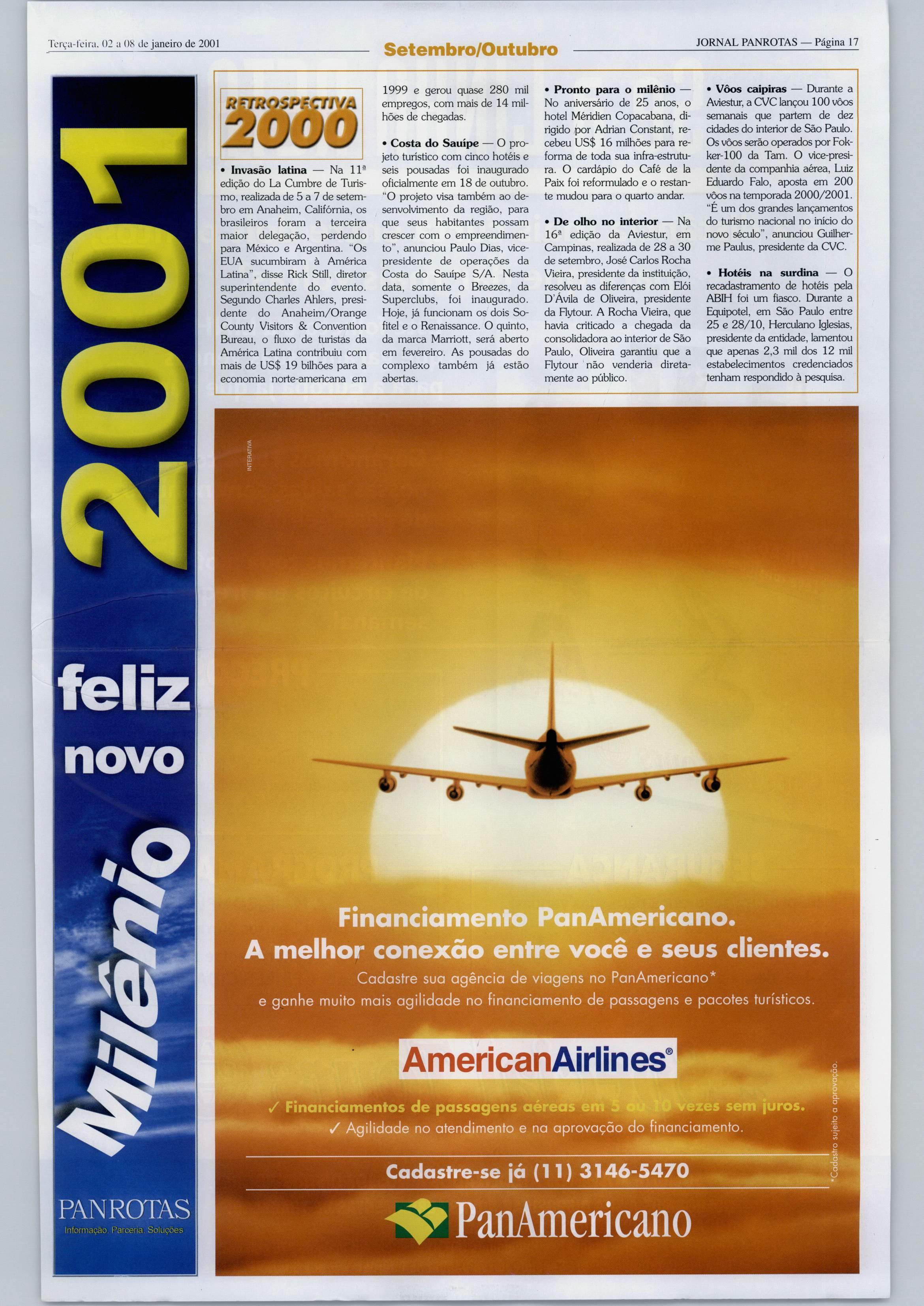Mas antes,vamos relembrar os fatos importantes para a indústria turística brasileira no ano 2000.Quemse destacou, quem está prometendo para 2001eos anos seguintes,quemdecepcionou,quembrilhou,quem superou as dificuldades,quem ganhou guerras ou batalhas, quem construiu. Na página 24,vejaa agenda dos principais eventos para onovo ano. Pois é,é hora de fazer tudo denovo. Mas aprendendo comos erros e acertos de 2000 e buscando sempre melhorar. Feliz Ano Novo.