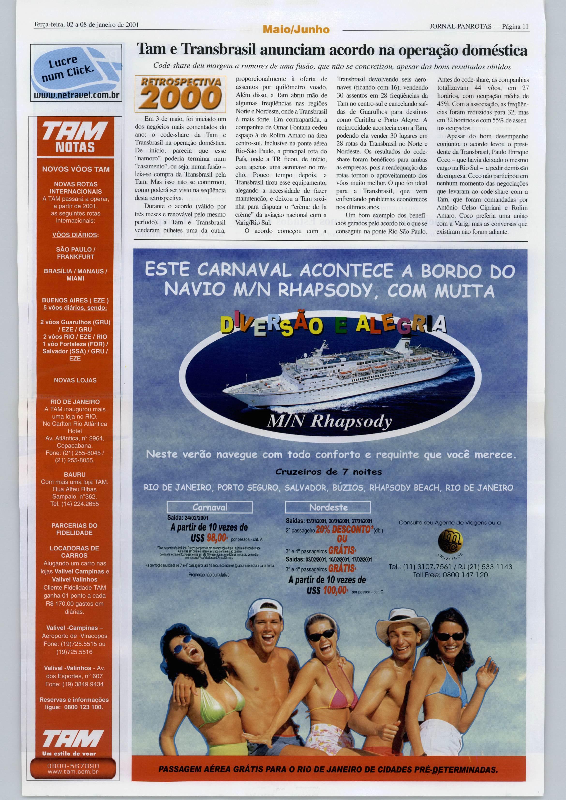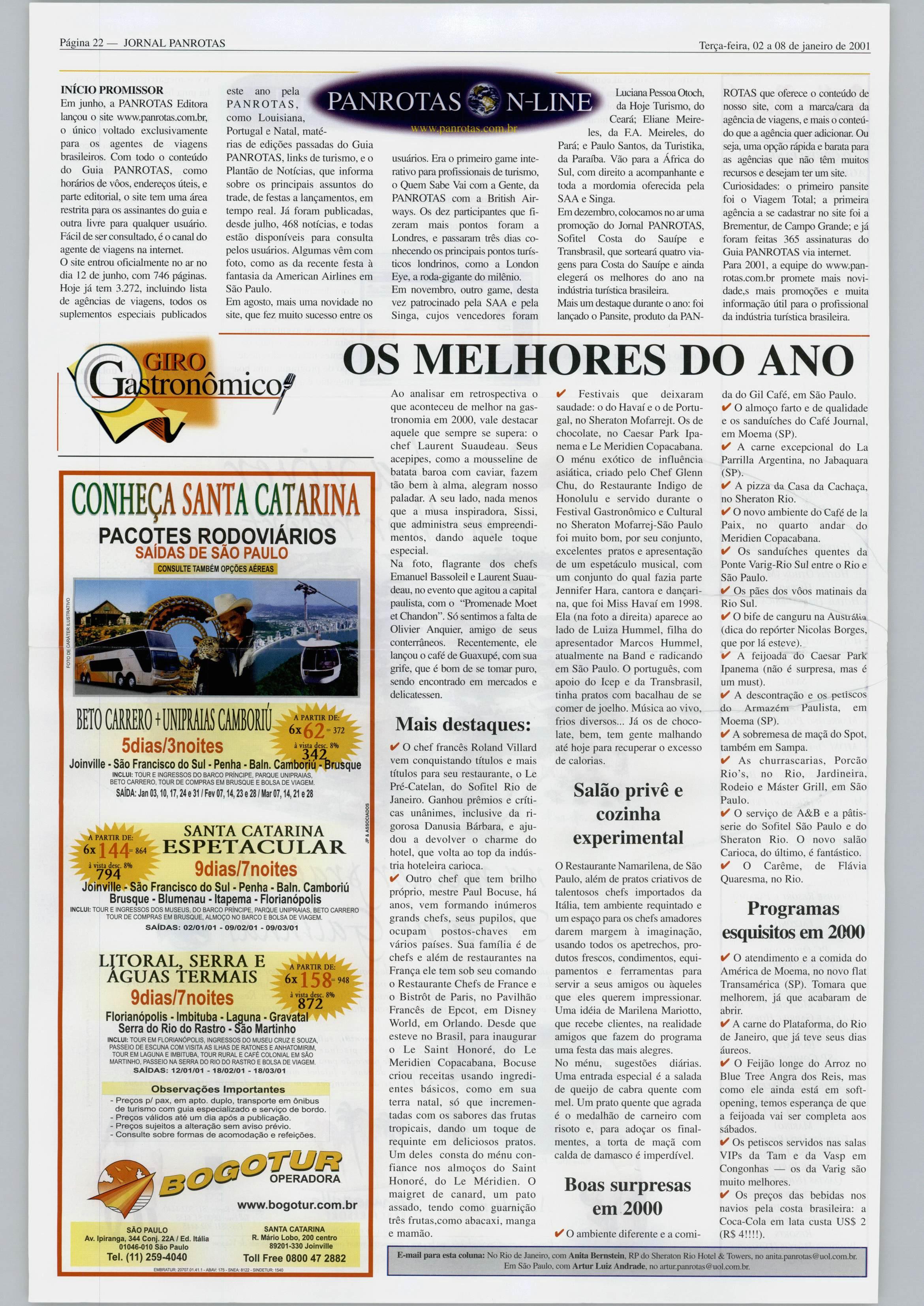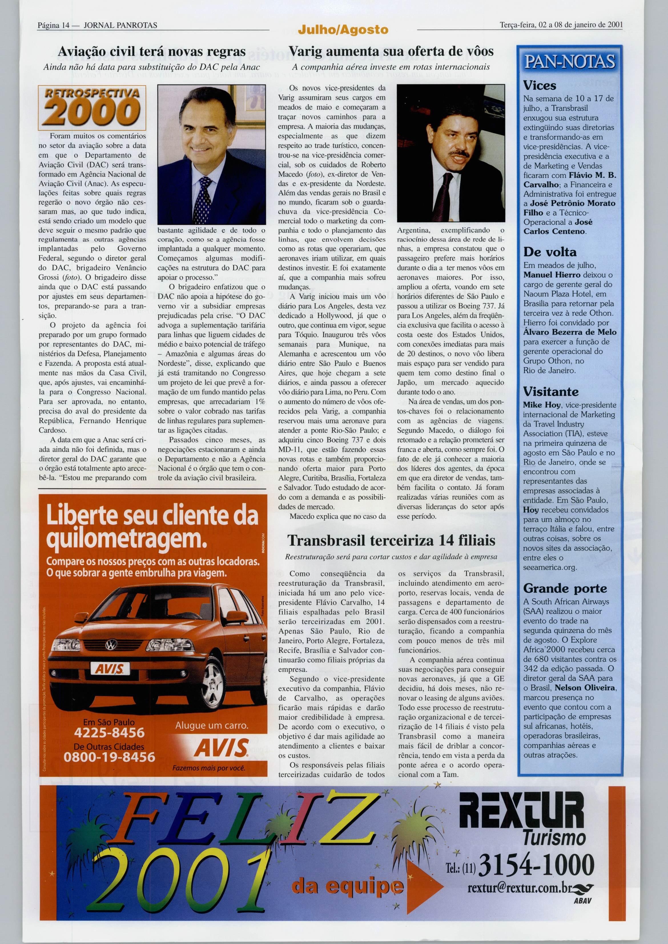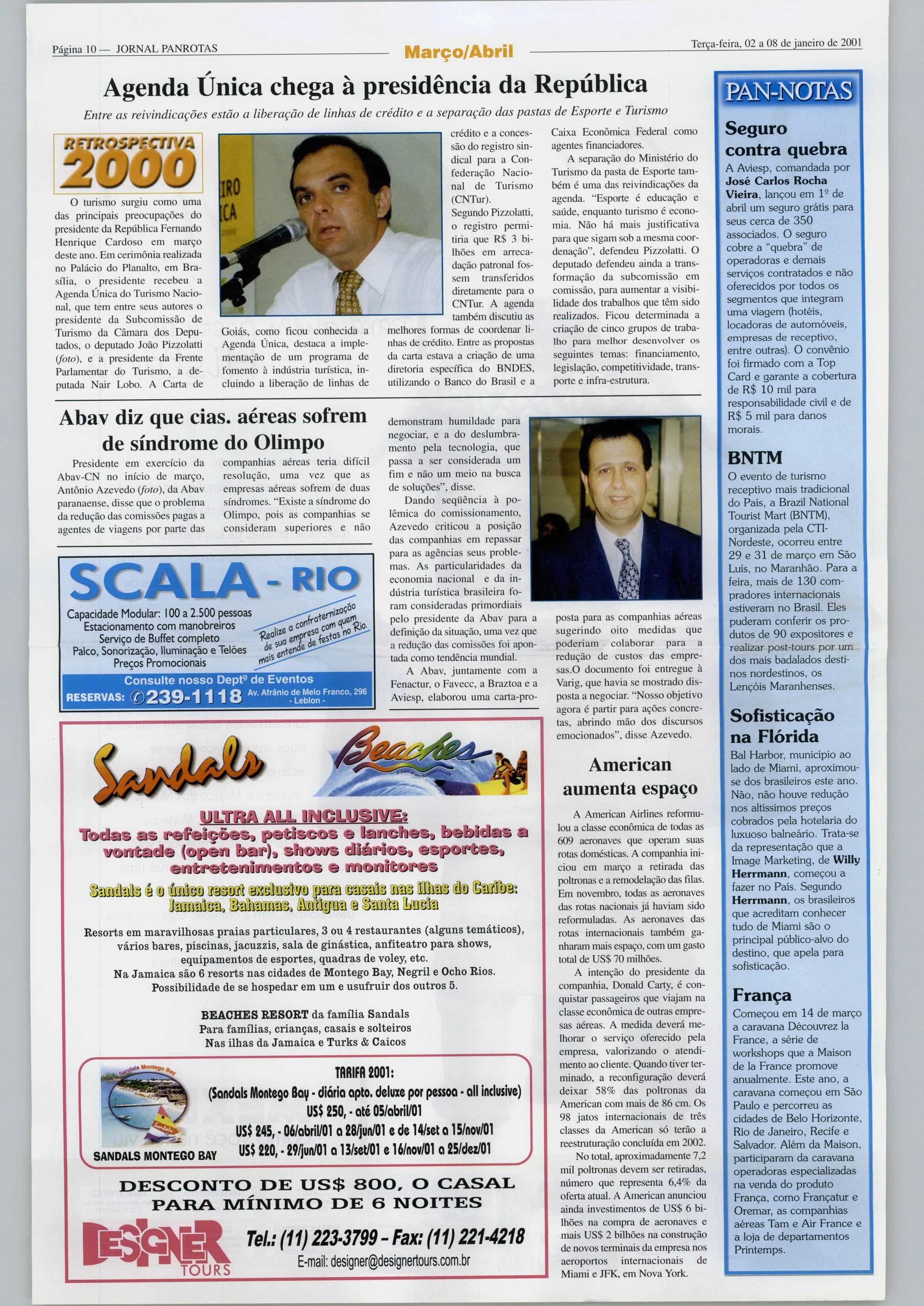 Mas antes,vamos relembrar os fatos importantes para a indústria turística brasileira no ano 2000.Quemse destacou, quem está prometendo para 2001eos anos seguintes,quemdecepcionou,quembrilhou,quem superou as dificuldades,quem ganhou guerras ou batalhas, quem construiu. Na página 24,vejaa agenda dos principais eventos para onovo ano. Pois é,é hora de fazer tudo denovo. Mas aprendendo comos erros e acertos de 2000 e buscando sempre melhorar. Feliz Ano Novo.