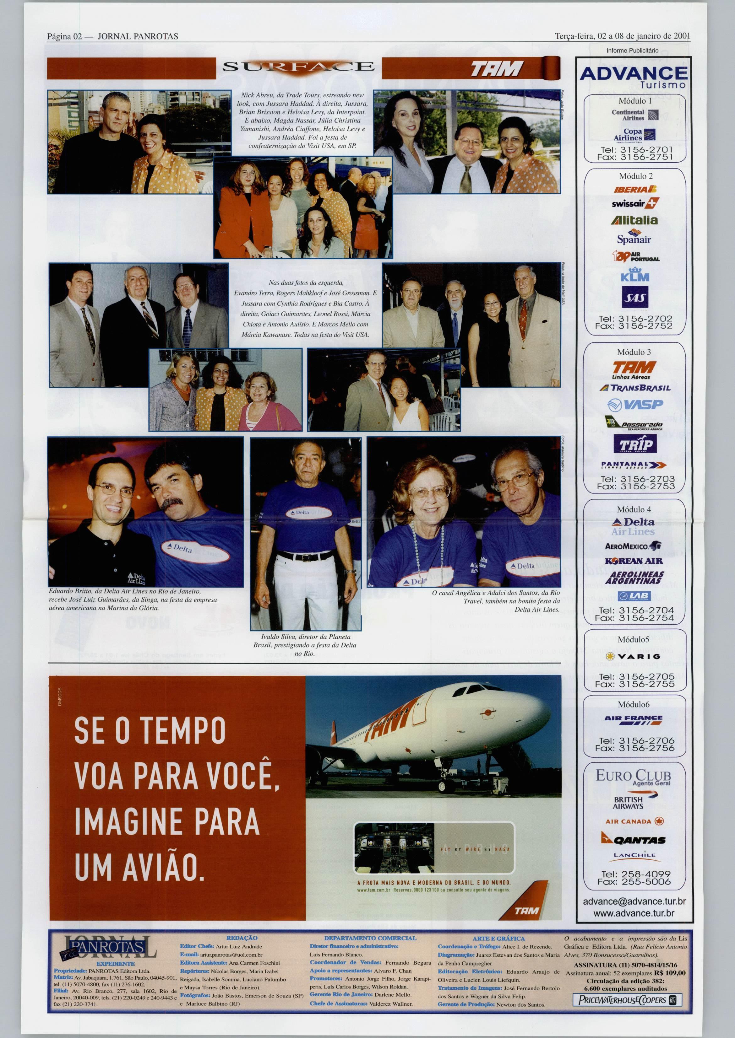 Página 02— JORNAL PANROTAS Terça-feira, 02a08de janeiro de2001 Nick Abreu, da Trade Tours, estreando new look, comJussara Haddad. A direita,Jussara, Brían Brission e Heloísa Levy,da Interpoint. E abaixo, Magda Nassar, Júlia Chrislina Yamanislii, Andréa Ciajfone. Heloísa Levye Jussara Haddad. Foi a festa de confraternização doVisitUSA.emSP. nas duas fotosda esquerda. Evandro Terra, Rogers Mahkloof e José Grossman. E Jussara comCynthiaRodrigueseBiaCastro.A direita. Goiaci Guimarães, Leonel Rossi. Mania Chiota e Antonio Aulísio. E Marcos Mello com Márcia Kawamse. Todasna festa do Visit USA. Ifl Eduardo Urino, da Delia .\ir Lincí^ noRio de Janeiro, recebeJoséLuizGuimarães,daSinga,na festa daempresa aérea americana na Marina da Glória. O casal Angélica t Adalci dos Santos, daRio Travei,tambémna bonita festa da Delta Air Lines. Ivaldo Silva, diretor da Planeta Brasil, prestigiando a festa da Delta no Rio. 'ItáiiitS':.. FLT er WIttE lY lASt SEO TEMPO VOA PARA VOCÊ, IMAGINE PARA UM AVIÀO. AFROTAMAIS NOVA E MOOERNA DO BRASIL E 00 MUNDO. www.litn.coiii.br Reservas:OBQ0123 IDO qu consulle siu agente di viagens í^ANRO'lAS R£DAÇAO Edhm- Oirfe: Artur Luiz Anilrade E-mait: ujiurpiuvuuv>@uol.com.br EXPEDIENTE Edilora AadstoUe: Ana Carnien Foscbini Pn^riedade: PANROTAS Editom Leda. Repórtacs: Nícolas Borges,Maria Imbel Matriz: Av. Jabaquara. 1.761. São Paulo. 04045-901, Reigada. Isabelle Somma, Luciano PaJumbo lel.(ll)5070^tó0().fax(n)276-1602, .d ,4 _c Mavsa Torres (Rio de Janeiro). Flüal: Av. Rjo Branco, 277. .saJa 1602, Rio de Janeiro. 2<)CXMW)09. tels. (21) 220-0249 e 240-9443 e fotógrafos: João Bastos. Etncrson de Souza (SP) fax (21) 220-.174I, e Marluce Balbino (RJ) DEPARTAMENTO COMERCIAL Direhw finaDcemi e «dminÍBlratiTo: Luís Fernando Blanco. Coordenador de Vendas: Fernando Begara Apoio a representantes: Álvaro F. Chan Prunotorea: Antonio Joige Filho, Joige Karapiperis. Luís Carlos Borges, Wilson Roldan. Gereate Rio de Jandro: Darlene Mello. Cbefe de Asstnatoras: Valdercz Wallner. ARTE E GRÁFICA Coordenação e Tráfego: Alice I.de Rezende. Dlagnunação: Juurez Escevan dos Santos e Maria da Penha Campreghcr Editoração Eletrônica: Eduardo Araújo de Oliveira e Lucien Louis Liefquin. l^atamento de Imagraw: José Fernando Bertolo dos Santos e Wagner da Silva Felip. Gerente de Produção: Newton dos Santos. Informe Publicitário ADVANCE Turismo Módulo 1 Continental AlrUnet