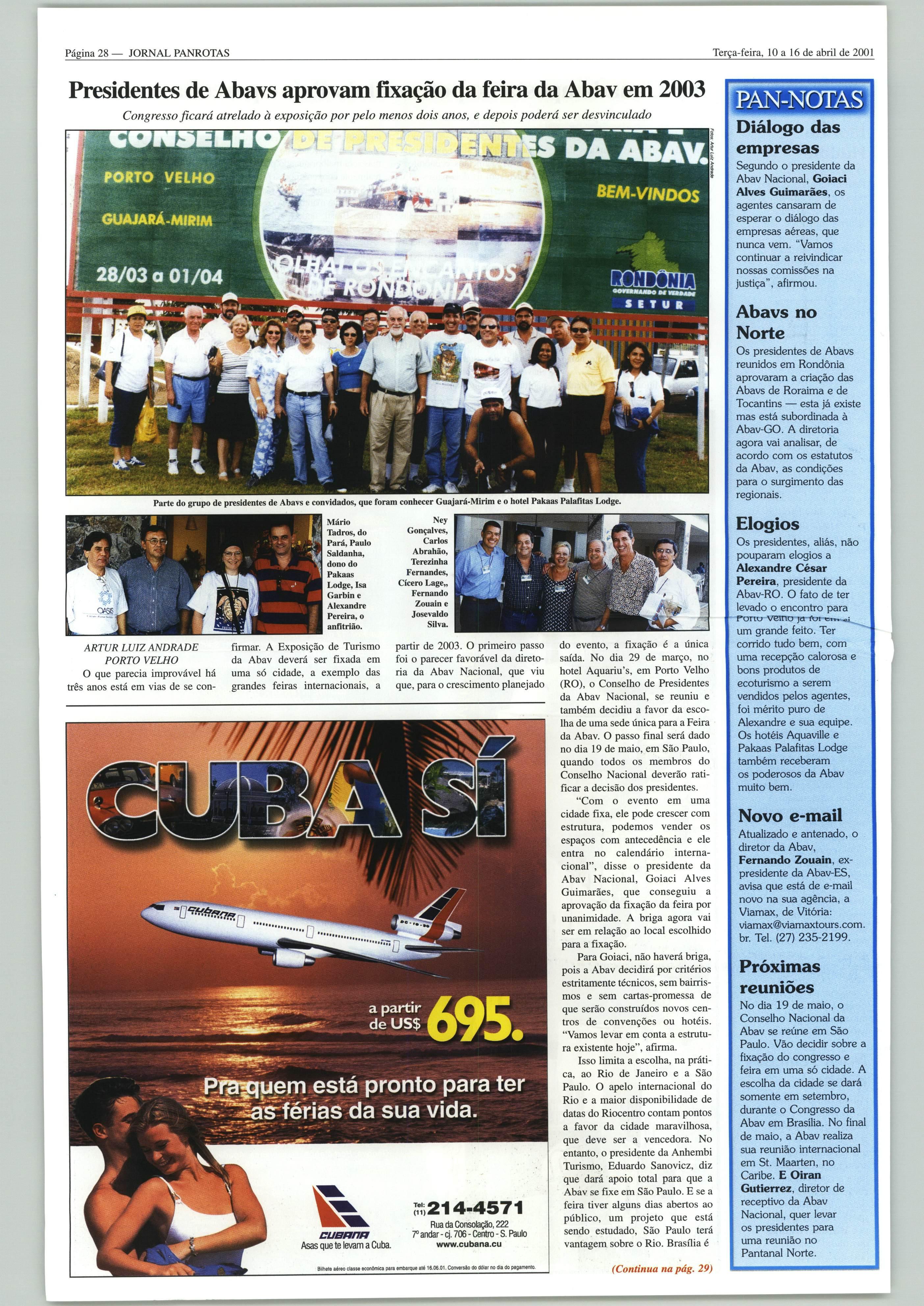 ReunidosemPortoVelho(RO),os presidentes de Abavs ea diretoria da Abav Nacional votaram a favor da fixaçãodaExposiçãodeTurismoda entidadeemumacidade.Abrigaserá entreSãoPauloeoRiodeJaneiro,ea decisãovaleapartirde2003.Nodia19 de maio, haverá uma reunião do Conselho Nacional daAbav,em São Paulo,paraavotaçãofinalsobrea fixação do evento. Seráo último passo paraqueamedidaentreemvigor.A escolha da cidade-sede se dará em setembro,duranteoCongressodaAbav emBrasília.Ocongressopoderáser desmembrado dafeira, massóa partir de2005.