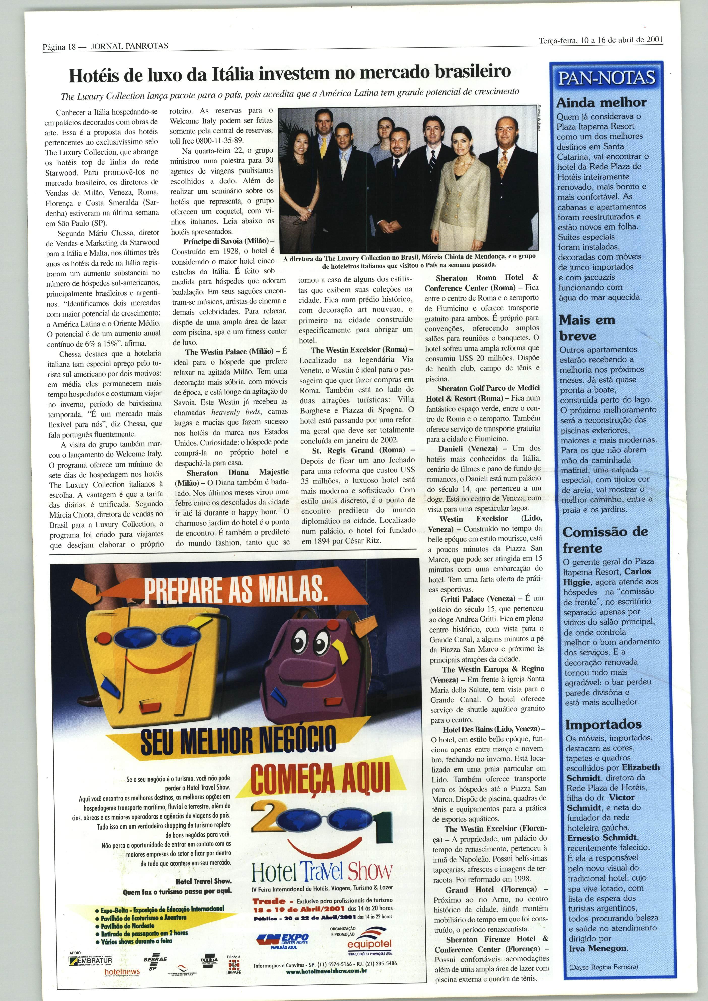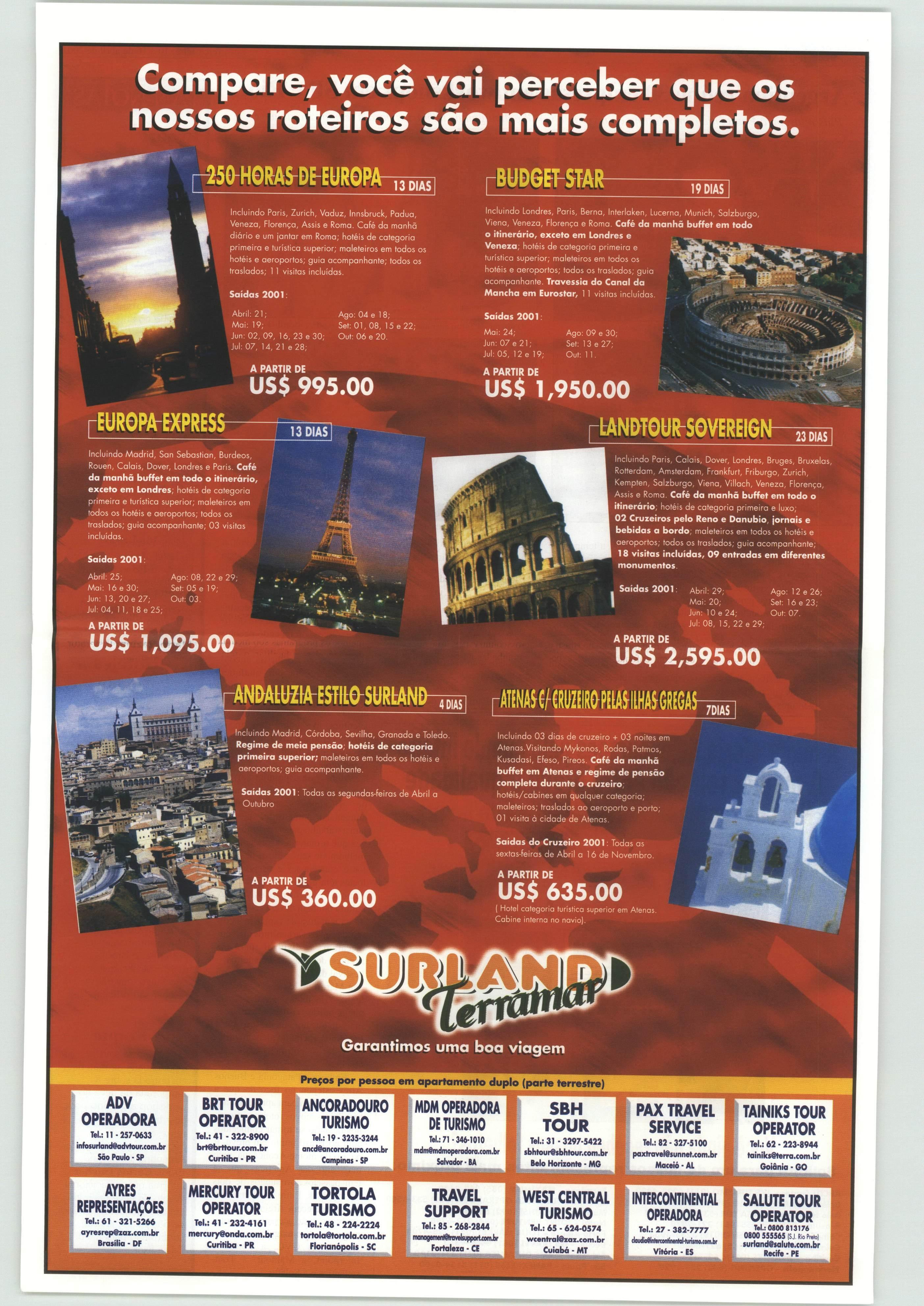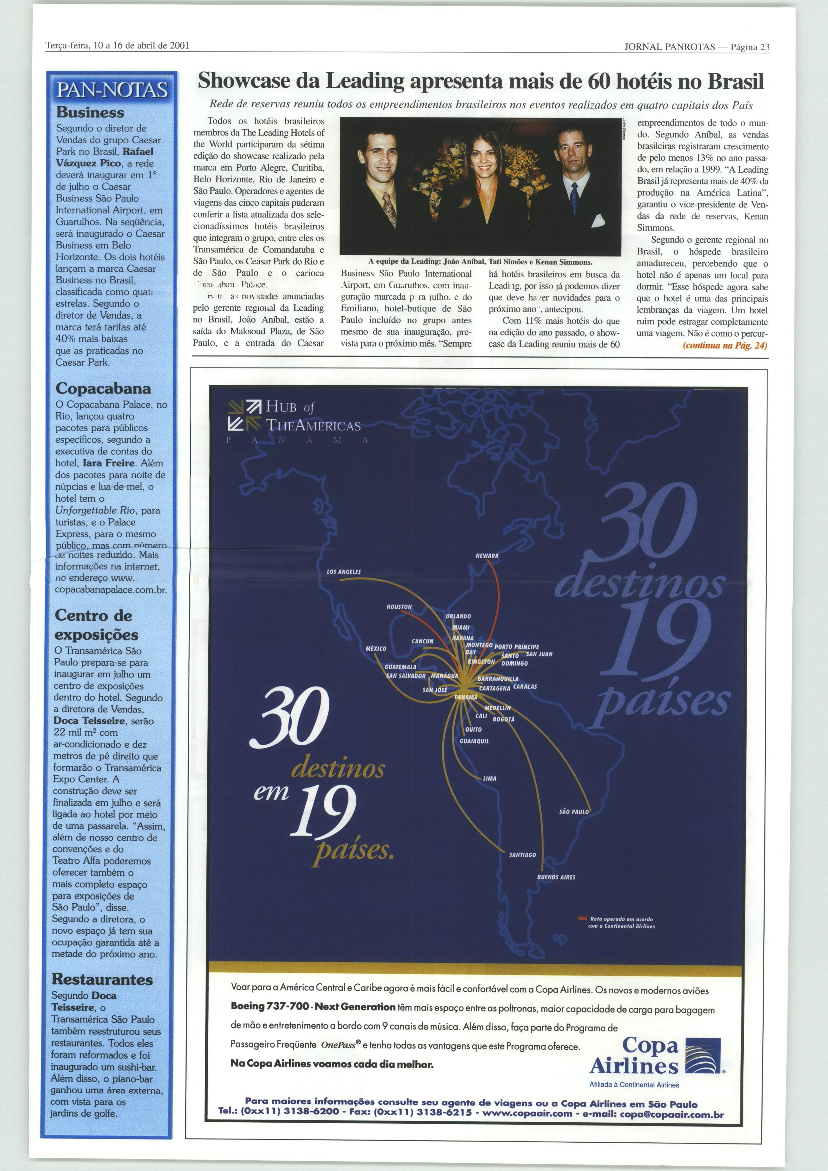 Página 02— JORNAL PANROTAS y-v w-v ^ TA ^ REDAÇÃO Editor ClidBe: Aitur Luiz Andrade : artur.paiirotas@uol.corttbr EXPEDIENTE Bepdrtee; Maria Izabel Reigada, Isabelle Somma. IVopriíd«le:PANROT/^ E^u^raLtda. Schapochnik. Beatriz MrtriKAv.Jabaquara,1.761,SâoPaulo.04045-901. tel. (II) 507(M800, fax (11) 276-1602. Vieira eMaysa Torres (Rio de Janeiro). fUal: Av. Rio Branco. 277.sala 1602. Riode JoãoBastos,EmersondeSouza(SP) Janeiro. 20040009. tels. (21) 22(M)249 e 240-9443 e fa, (21) 220-3741. eMTluceBalbmodU) THM ESSAS TORCIDAS NUNCA SE SENTIRAM TÃO CONFORTÁVEIS JUNTAS. 1 VEZES POR DIA NOS NOVOS AIRBUS PONTOS EM DOBRO NO PR06RANA FIDEUOAOE Luís Fernando Blanco. Coordenador de Vendas: Fernando Begara Apoioa rcpreaentantea: Álvaro F.Chan Promotores: AntonioJorgeFilho.Jorge KaraiMperis, Luís Carlos Borges. VWlson Roldan. Geicnte Rio de Janeiro: Darlene Mello. ÇM» de Afldnatorafl: Valderez Wallner. Fif i( «rftt ií ARTE E GRÁFICA Coordenação eAliceI.de Rezende. DiagramaçSo: JuarezEstevamdosSantose Maria da Penha Campregher Edttoraçio Eletrânicn: LucienLouis Liefquin. Ttetimaito de Imagem: JoséFernandoBertolo dosSantoseWagnerdaSilva Feüp. Gerente de Prodnçio: Newton dosSantos. Terça-feira, 10a16de abril de 2001 Informe Publicitário ADVANCE Turismo & SOUTH AFRICAN Ai R WAYS Agente de Viagens A partir de agora você pode emitir SOUTH AFRICAN A RWAYS na ADVANCE Turismo Sempre a sua meiiior opção Consulte-nos íeMOxxl 1)3156-2704 Fax: (Oxxl 1)3156-2754 advance@advance.tur.br Euro Club Agente Geral BRITISH AIRWAYS Londres —. r . PRMÍOÍÊÍ(HMÍL^ i777nn
