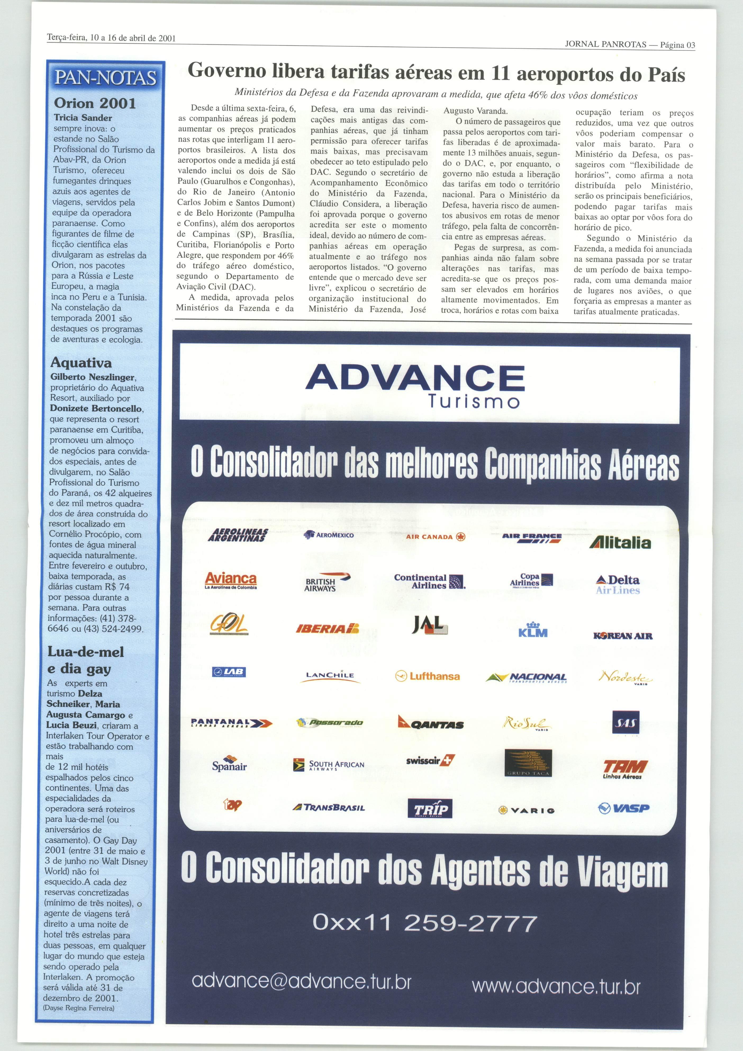 oCMsoliilailor das melliores Compaiihlas Aépos Avíanca Spanair ^AEROMCXiCO BKITISH AIRWAYS êberíaR laniChile fi^m£Êf-a£/o jjS SouthAfrican •a AI R WAVS jaTr^NsBnAsiL AIR CANADA ^ Continental Alrllnes J4t ' ifliitalia •.Delta Airíines 0 Lufthansa >1^ TRÍP # VA. R I O Tfm Unho$ Aévat OConsolidadop dos Agentes de Viagem 0xx11 259-2777 advance@advance,tur. br www.advance.tur.br