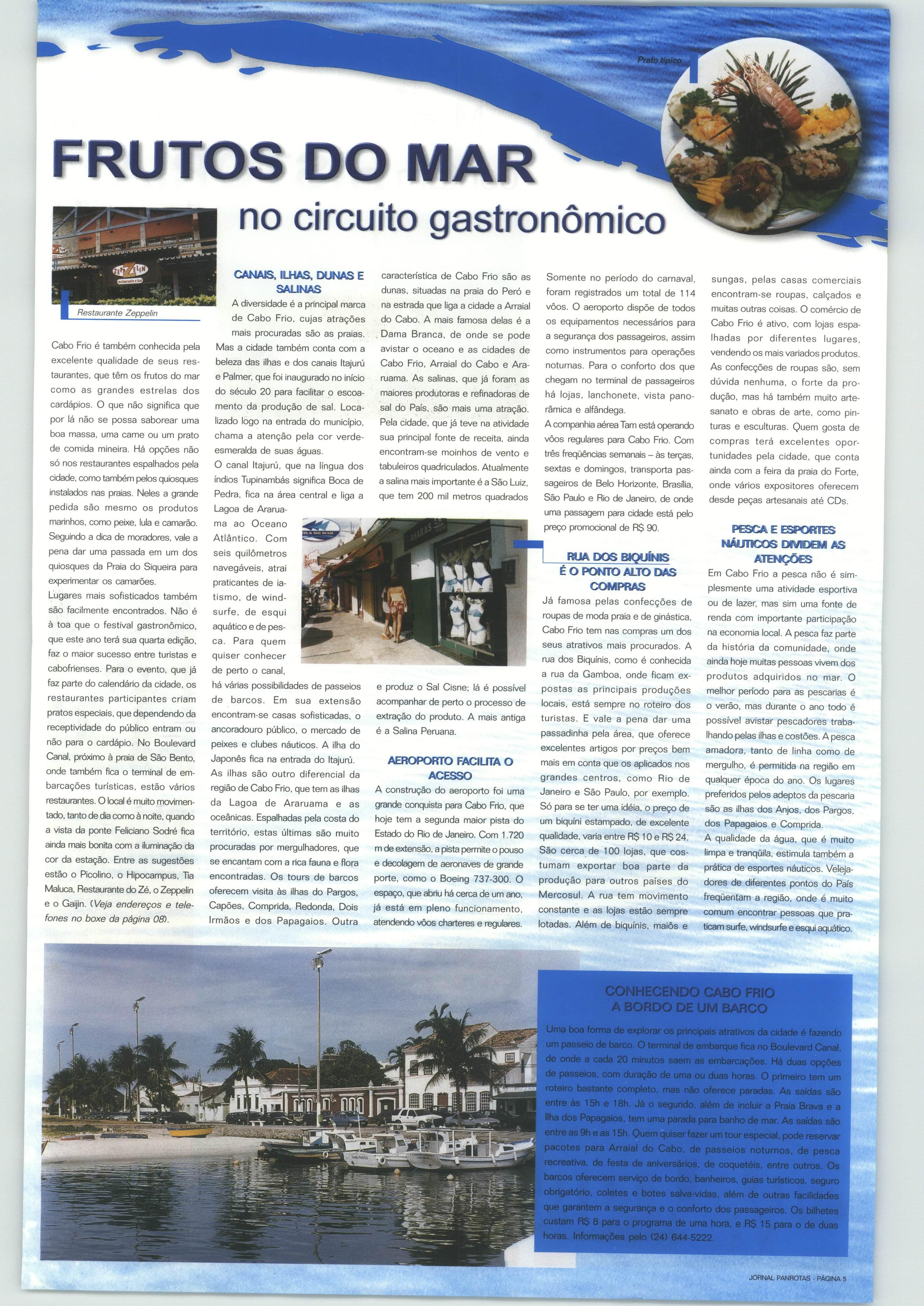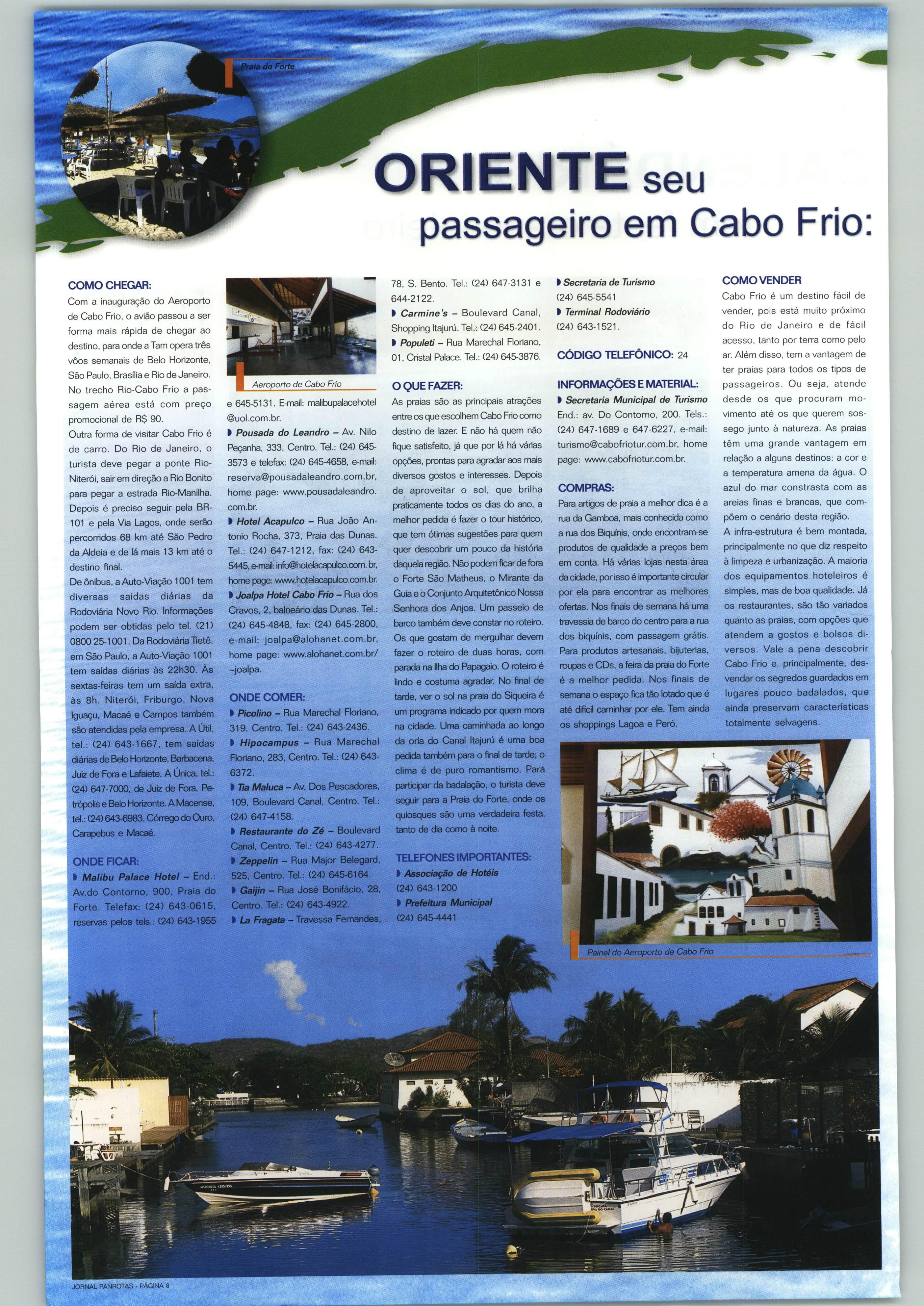 Cabo Frio éum destino fácil de vender,pois está muitopróximo do Rio de Janeiro e de fácil acesso, tantoporterracomopelo ar.Além disso, tem a vantagem de terpraiasparatodosostiposde passageiros. Ou seja, atende desde os que procuram mo vimento até os que querem sos sego juntoànatureza.Aspraias têm uma grande vantagem em relação aalguns destinos: acore atemperaturaamenadaágua.O azul do mar constrasta com as areias finase brancas, que com põemocenário desta região. A infra-estrutura é bem montada, principalmente noquedizrespeito à limpeza eurbanização.A maioria dos equipamentos hoteleiros é simples,masdeboa qualidade. Já os restaurantes, são tão variados quanto as praias, com opções que atendem a gostos e bolsos di versos. Vale a pena descobrir Cabo Frio e, principalmente, des- : vendar os segredos guardados em [ lugares pouco badalados, que ainda preservam características totalmente selvagens.