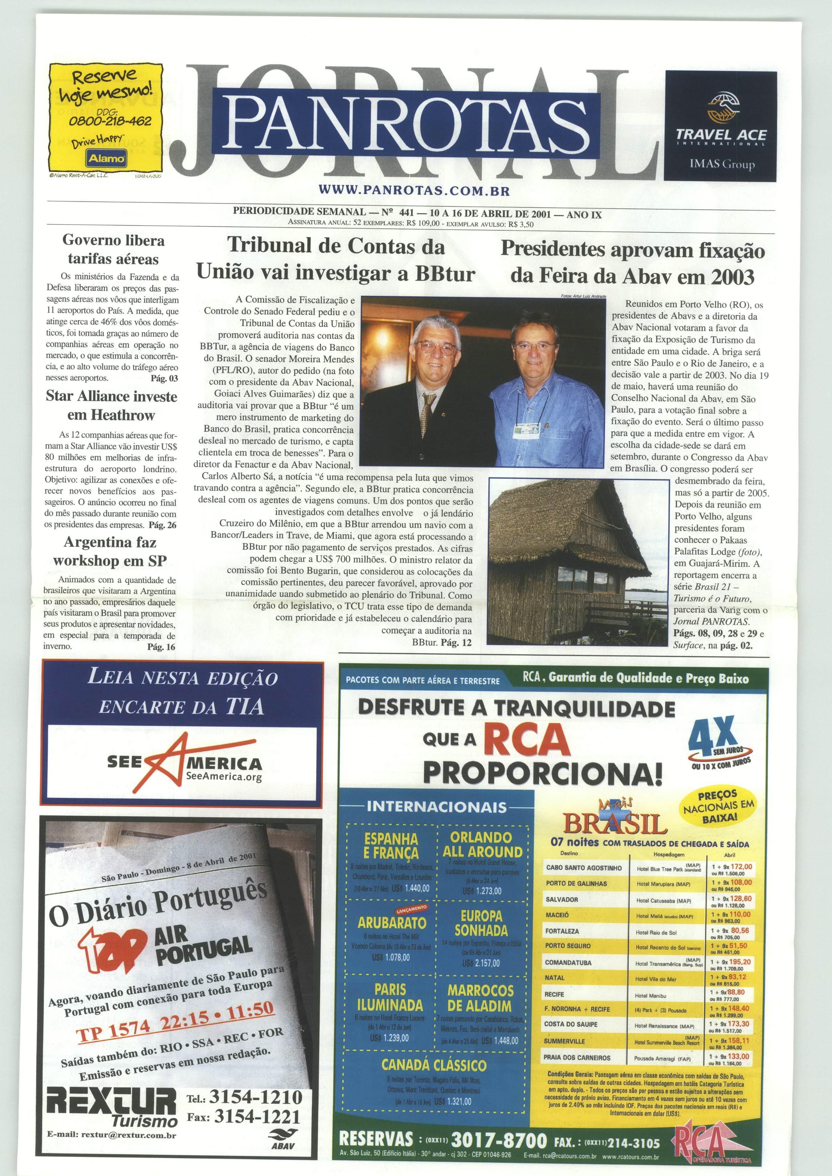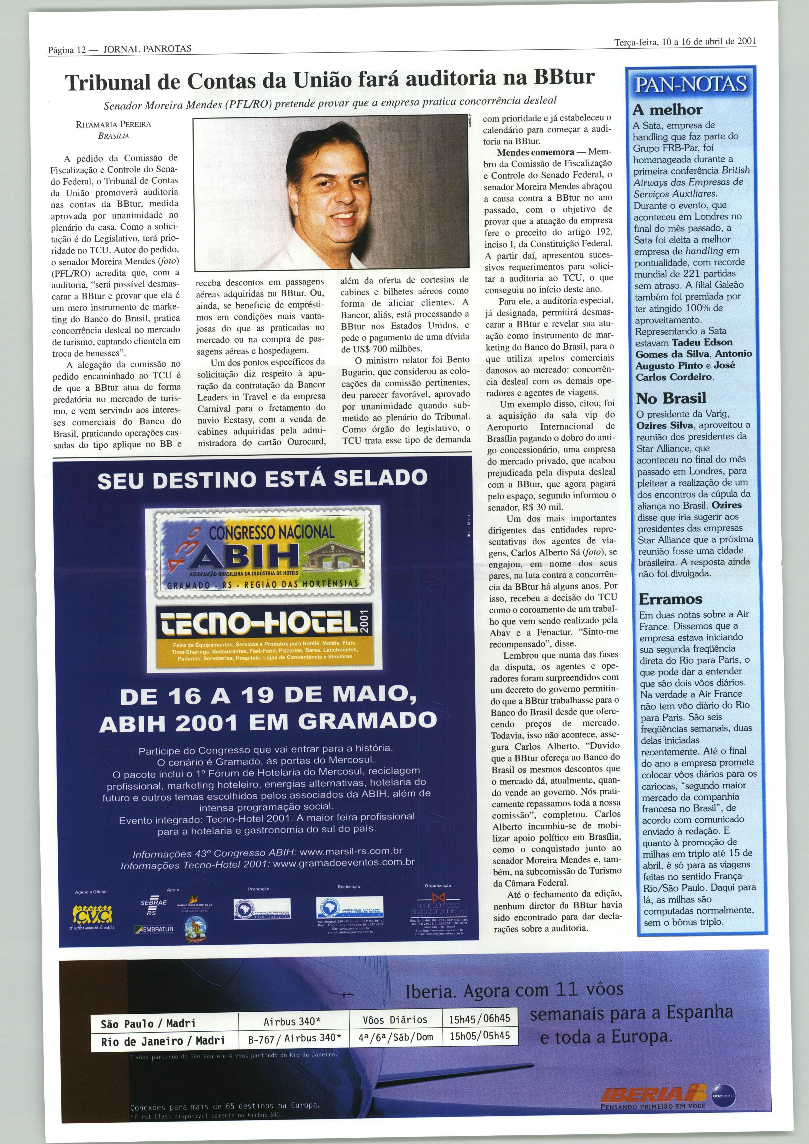 Tribunal de Contas da União promoverá auditoria nas contas da BBTur,aagênciadeviagensdoBanco do Brasil. O senador Moreira Mendes (PFL/RO),autordopedido(nafoto com o presidente da Abav Nacional, GoiaciAlvesGuimarães)dizquea auditoriavaiprovarqueaBBtur "é um meroinstrumentodemarketingdo BancodoBrasil,praticaconcorrência deslealnomercadodeturismo,ecapta clientela em troca de benesses". Para o diretor da Fenactur edaAbav Nacional, Carlos Alberto Sá, a notícia "é uma recompensa pela luta que vimos travandocontraa agência". Segundo ele,aBBturpratica concorrência desleal comos agentes de viagens comuns. Um dos pontos que serão investigados com detalhes envolve ojá lendário CruzeirodoMilênio,emqueaBBturarrendouumnaviocoma Bancor/Leaders in Trave, de Miami, que agora está processando a BBturpornãopagamentodeserviçosprestados.Ascifras podem chegar aUS$700 milhões. O ministro relator da comissão foi Bento Bugarin, que considerou as colocações da comissão pertinentes, deu parecer favorável, aprovado por unanimidadeuandosubmetidoaoplenáriodoTribunal.Como órgão do legislativo, oTCUtrataessetipode demanda com prioridade ejá estabeleceu o calendário para começar a auditoria na BBtur. Pág. 12