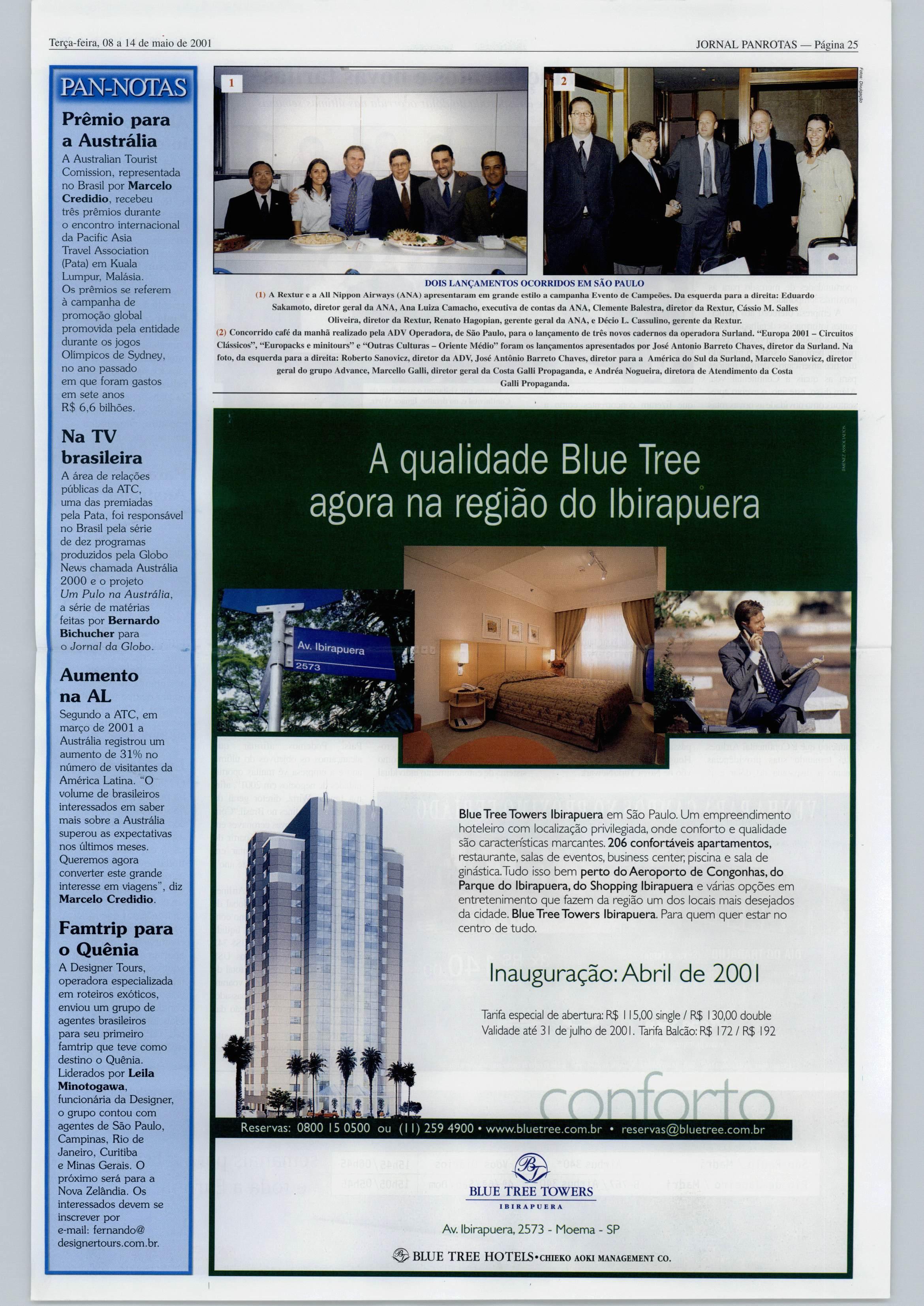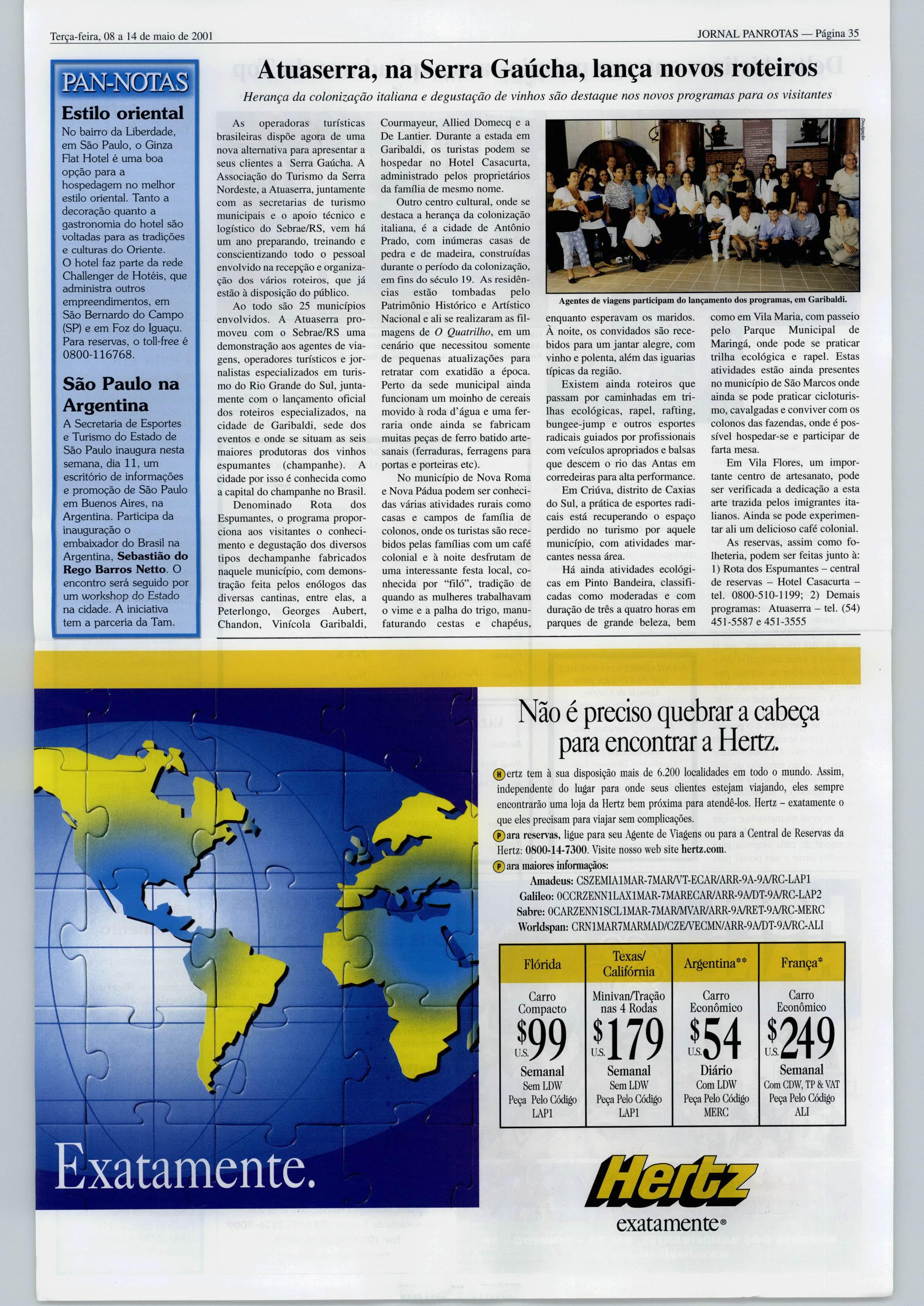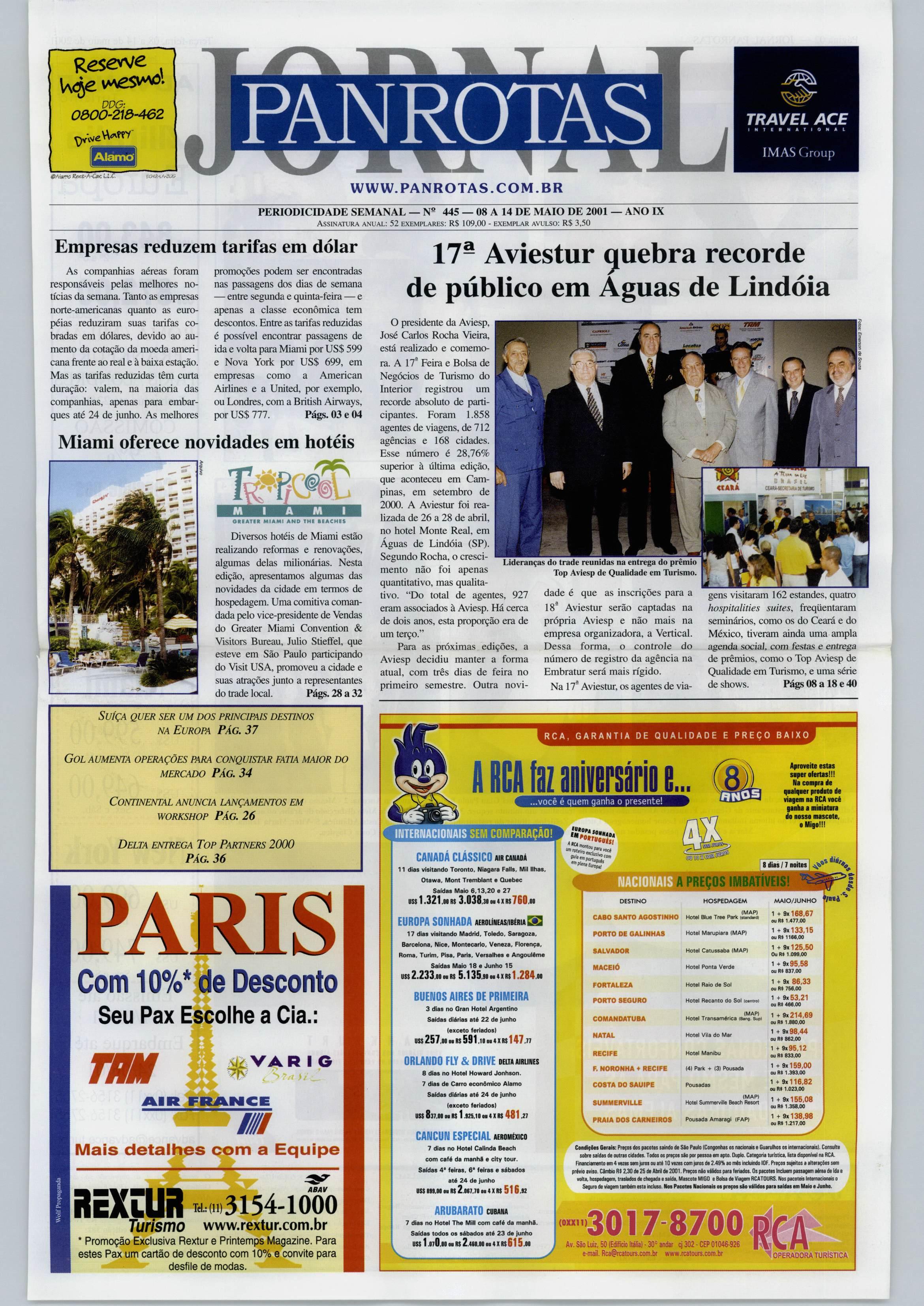 TRAVEL ACE IMTianftTIONAl IMAS Group Alamo' ^AwTV Ecr.í-A-<>^; www.panrotas.com.br PERIODICIDADE SEMANAL N® 445 08 A 14 DE MAIO DE 2001 ANO IX Assinatura anual: 52 exemplares: RS 109,00 - exemplar avulso: R$ 3,50