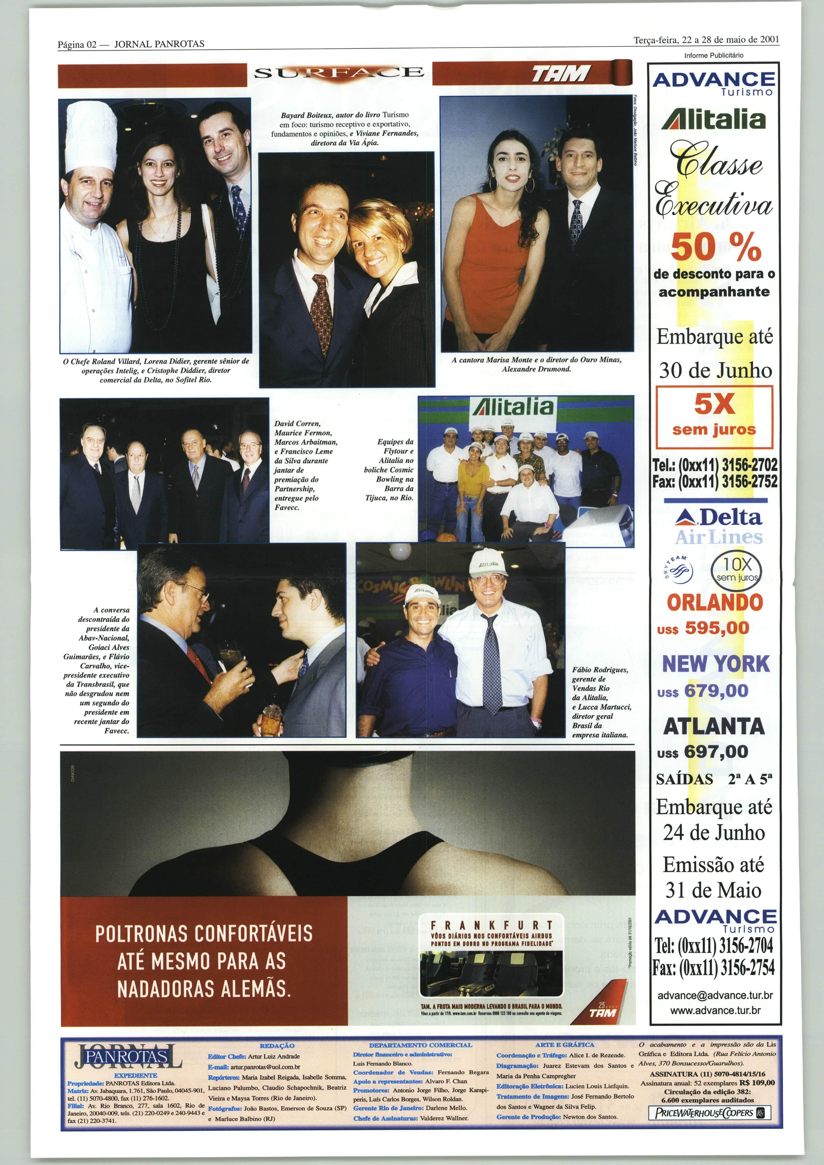 conversa descontraída do presidente da Abav-Nacional, Goiaci Alves Guimarães, e Flávio Carvalho, vicepresidente executivo da Transbrasil, que não desgrudou nem um segundo do presidente em recente jantar do Favecc. PANROIAS tr\yYt: EXPEDIENTE Propriedade: PANROTAS Editora Ltda. Matriz: Av. Jabaquara, 1.761, SãoPaulo. 04045-901 tel. (11) 50704800, fax(11) 276-1602. FQial: Av. Rio Branco, 277, sala 1602. Rio de potógrafos: João Bastos. Emereon de Souza (SP) Janeiro. 20040-009. tels. (21)220-0249 e 240-9443 e ^ fax (21) 220-3741. e Marluce Balbino (RJ) David Corren, Maurice Fermon, Marcos Arbaitman, e Francisco Leme da Silva durante jantar de premiação do Partnership, entregue pelo Favecc. REDAÇÃO Editor Chefe: Aitur Luiz Andrade E-mafl: aitiir.panrotas@uol.com.br Repârteres: Maria Izabel Reigada, IsabelleSomma, Luciano Palumbo. Cláudio Scbapochnik, Beatriz Vieira e Maysa Torres (Rio de Janeiro). iíllitalia Equipes da Flytour e Alitalia no boliche Cosmic Bowling na Barra da Tijuca, no Rio. Fábio Rodrigues, gerente de Vendas Rio da Alitalia, e Lucca Martucci, diretor geral Brasil da empresa italiana. FRANKFURT VBOS DíARIOS nos confortáveis AIR8U8 PONTOS EM DOIRO NO MOORAMA FIOELIDASr Tr, TAH. AFROn KAI8MOOERNA LEVANDO OBRASIL FARA O NONS& ftHiMírdtmmimoabr DEPARTAMENTO COMERCIAL Diretor ftnancriro e adminbtmUvu; Luís Fernando Blanco. Coordenador de Vendas: Fernando Begara Ap<do a representantes: Álvaro F. Chan Promotores: Antonio Joige Filho,Jorge Kar^petis. Luís Carios Boiges, Wilson Roldan. Gerente Rio de Jandro: Darlene Mello. Chefe de Assinaturas: Valderez Wallner. ARTE E GRÁFICA Coordenação e IVáTcgo: AUce I.de Rezende. Diagramaçfto: Juarez Estevam dos Santos e Maria da Penha Campregher Editoração laetrõnica: Lucien Louis Liefquin. Tratamento de Imagens: José Fernando Bertolo dos Santos e Wagner da Silva Pelip. Gerente de Prodnçio: Newton dos Santos. Informe Publicitário ADVANCE Turismo /Ilitalia '^ocecuMmiy 50% de desconto para o acompanhante Embarqueaté 30 de Junho sem juros Oxxll) 3156-2702 Oxx11 3156-2752 ^Delta ORLANDO us$ 595,00 NEW YORK us$ 679,00 ATLANTA us$ 697,00 SAÍDAS 2"A5» Embarqueaté 24 de Junho Emissão até 31 de Maio ADVANCE Turismo Tel:(Onll) 3156-2704 Fax: (Onll) 3156-2754 advance@advance.tur.br www.advance.tur.br O acabamento ea impressão são da Lis Gráfica e Editora Ltda. (Rua Felício Antonio Alves, 370 BonsucessoAjuarulhos). ASSINATURA (11) 5070-4814AS/16 Assinaturaanual:52exemplares R$ 109,00 Circulação da edição 382: 6.600 exemplares auditados PriciwaTerhous^pers