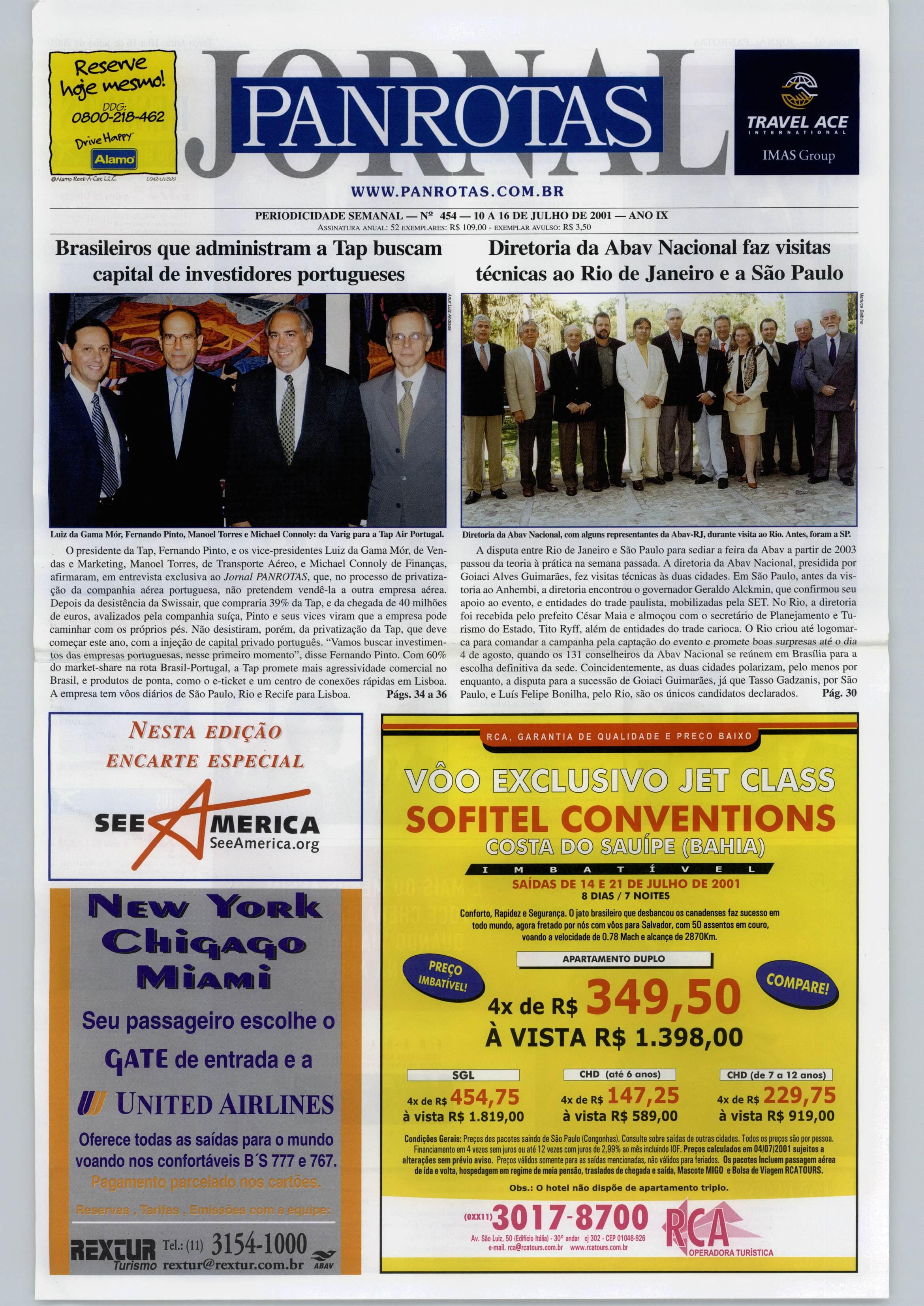 T • oaoo-zia-Aez PANROTAS TRAVEL ACE INTERNATIONÜL ÍMÃS Group Alamo 0Aivrw EaríC-A-Co': li,£> www.panrotas.com.br PERIODICroADE SEMANAL N® 454 10 A 16 DE JULHO DE 2001 ANO IX Assinatura anual: 52 exemplares: R$ 109,00 - exemplar avulso: R$ 3,50
