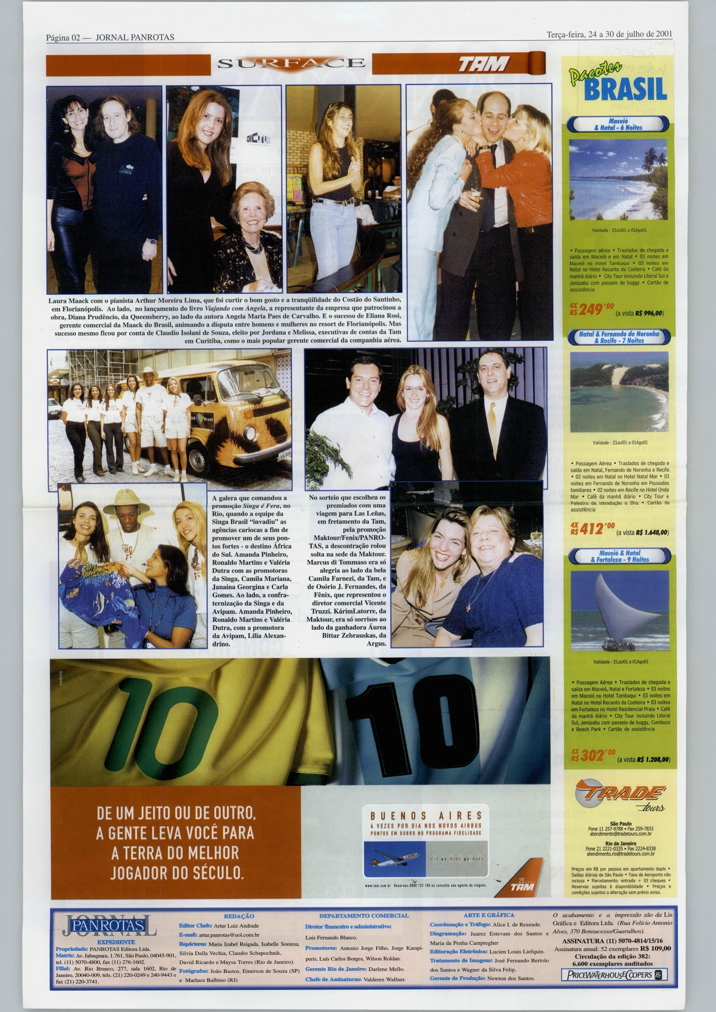 LauraMaackcomopianista Arthur Moreira Lima,quefoi curtir obomgostoeatranqüilidadedoCostãodoSantinho, em Florianópolis. Ao lado,no lançamento dolivro Viajando com Angela, a representante da empresa que patrocinou a obra,DianaPrudêncio,daQueensberry,aoladodaautora Angela MariaPaesdeCarvalho.EosucessodeElianaRosi, gerente comercial daMaackdo Brasil, animando adisputaentre homens e mulheres noresortde Florianópolis. Mas sucesso mesmo ficou porcontade Cláudio Isolani deSouza, eleito porJordanae Melissa, executivas decontasdaTam em Curitiba, comoomais popular gerentecomercialda companhia aérea.
