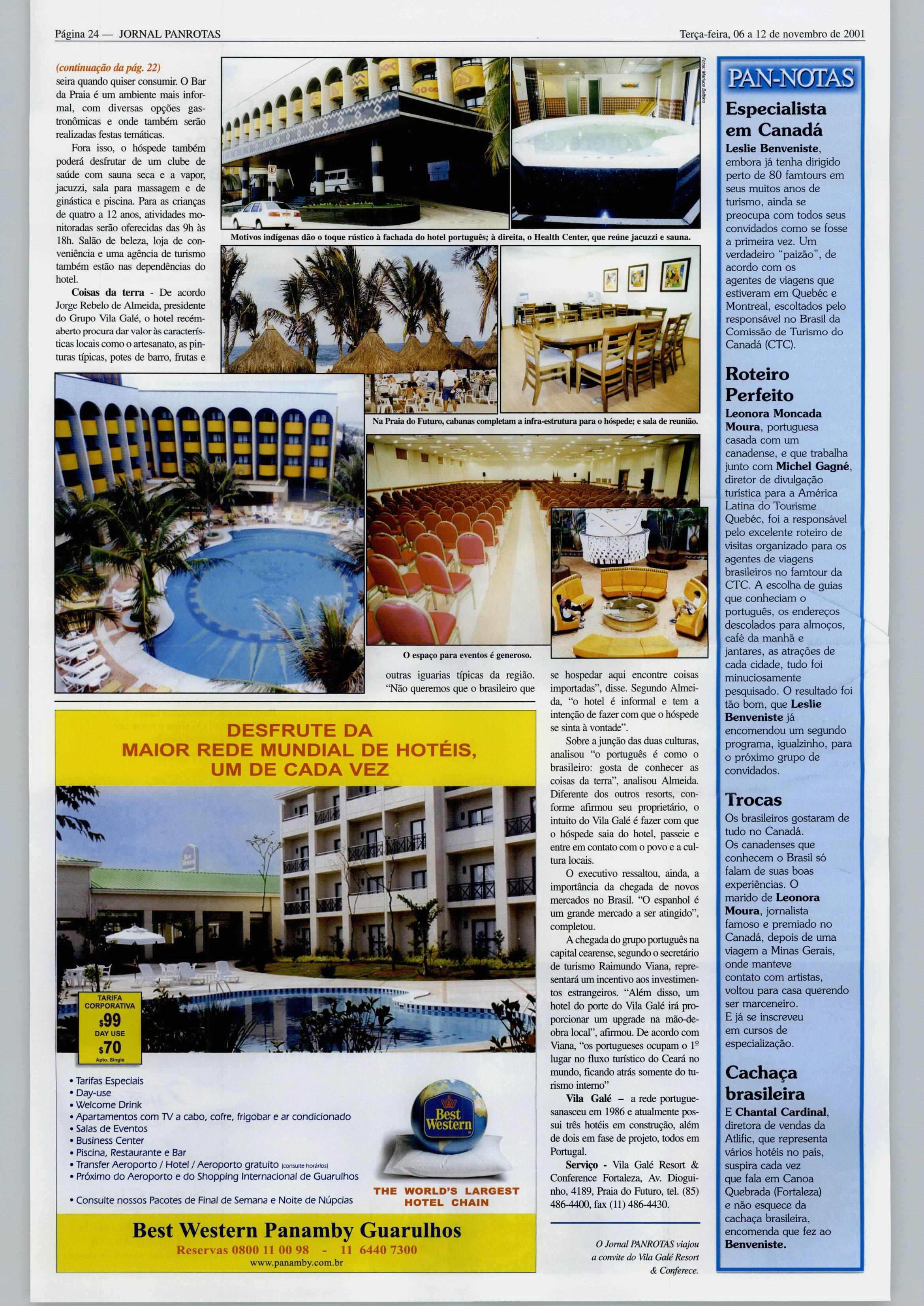 oõoo-ziô-Aez Alamú TRAVEL ACE INTERNAtIONAl IMAS Group www.panrotas.com.br PERIODICIDADE SEMANAL 471 06 A 12 DE NOVEMBRO DE 2001 ANO IX Assinatura anual: 52 exemplares: R$ 109,00 - exemplar avulso; RS 3,50 OVila Galé, o mais novo rusort de Fortaleza (CE) eo primeiro na Praia do Futuro, éo maior investimento desse tipo no Estado. Págs. 22e24