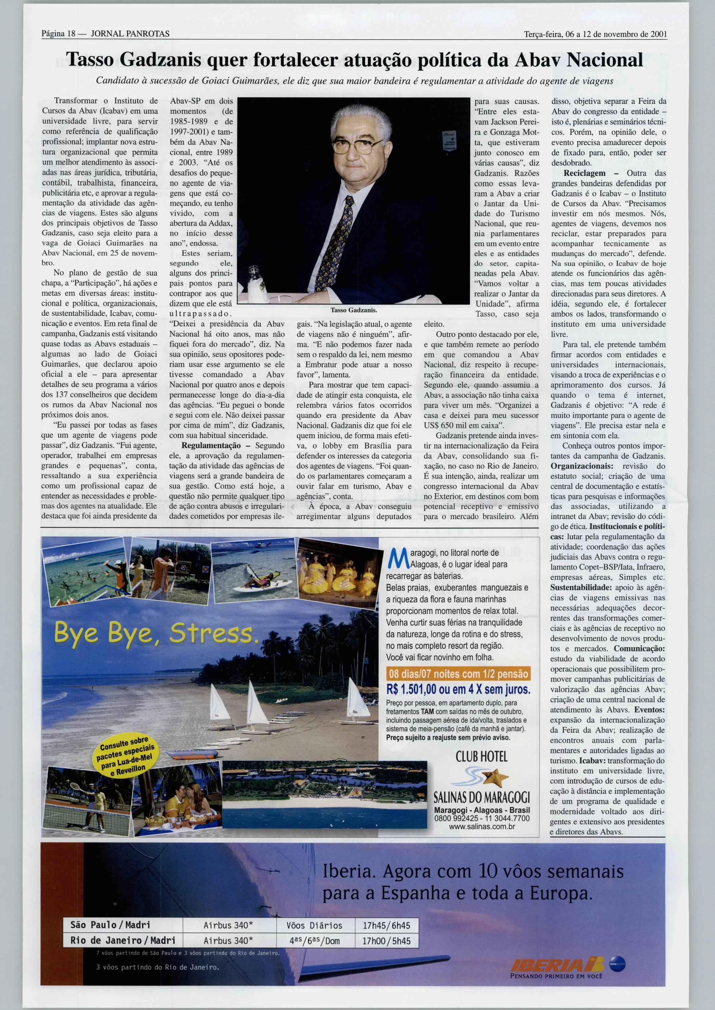 Nesta edição,leiaduas entrevistas exclusivas com Luís Felipe BoniIha, da Abav-RJ, e Tasso Gadzanis,da Abav-SP. Eles querem, e muito,a presidência daAbav Nacional. Poder suceder Goiaci Alves Guimarães e passar doisou quatro anos tirando fotos,.tetyiQ^ dordecabeças,viajando,fazendo algo pelo crescimentodoBrasil... uma maratona. Págs. 10e18
