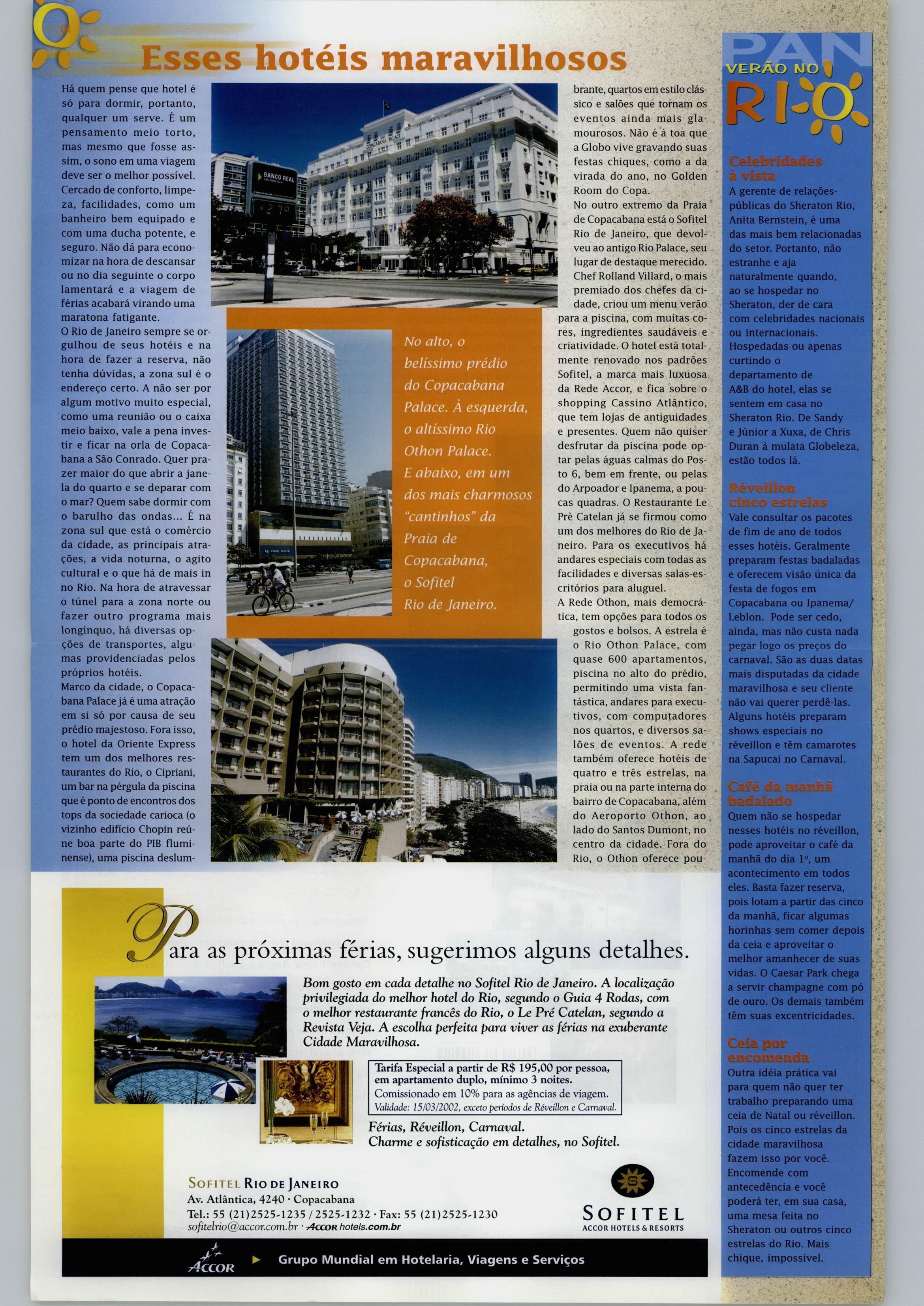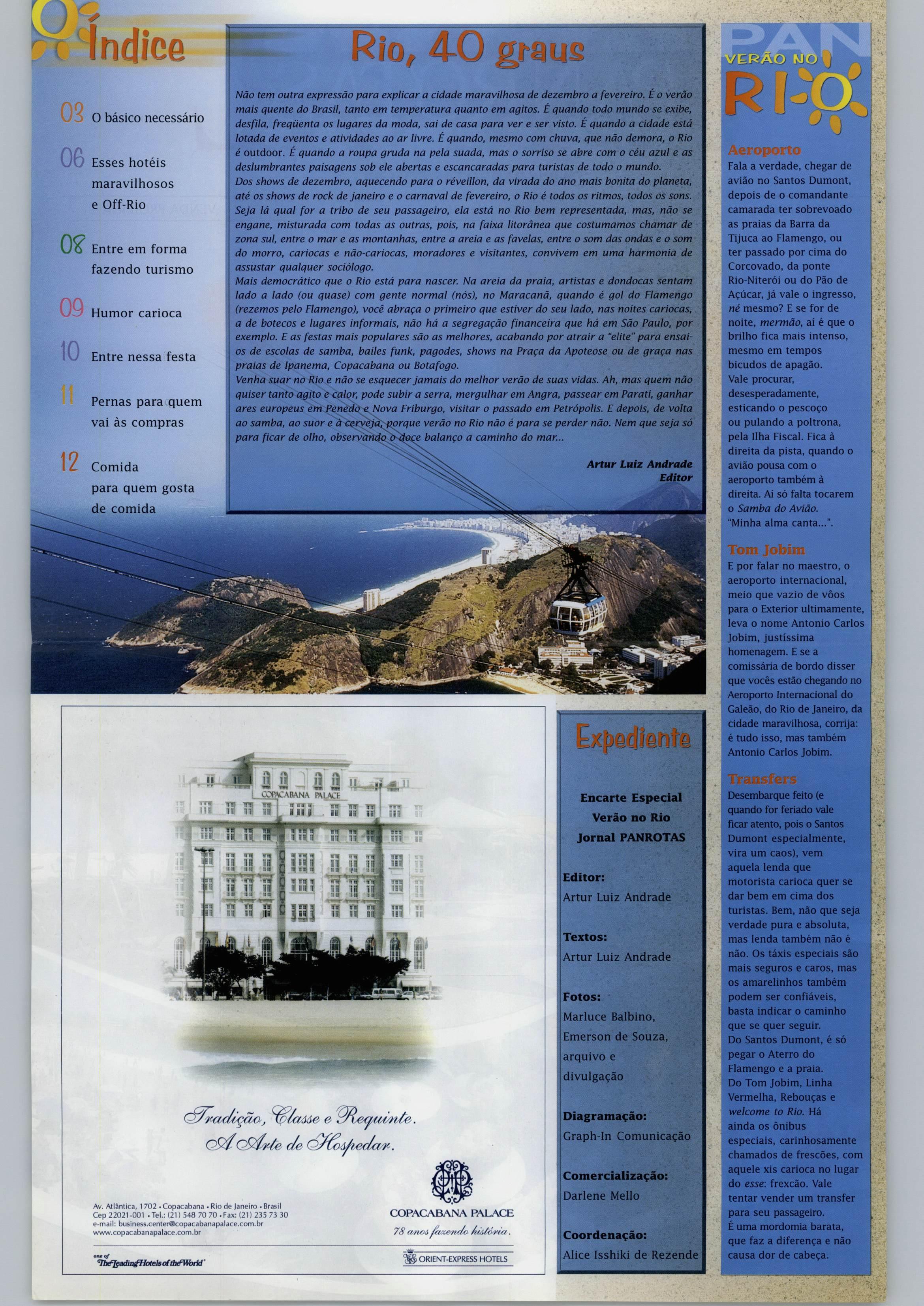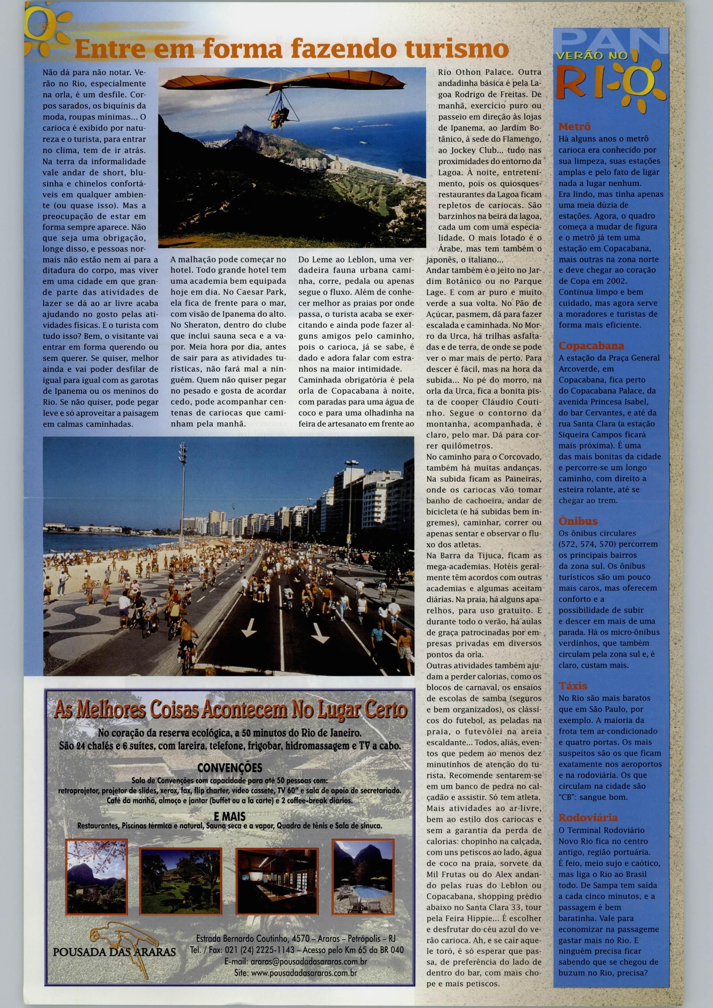 espalhados e os próprios sam bistas e moradores controlam os excessosquepossamocorrer.É diversão garantida, e ainda aju da a queimar calorias. A quadra do Salgueiro está repleta de gen te do turismo ultimamente, já que a Tam está patrocinando a escola. Na Beija-Flor, o patrocí nio é da Varig.E na Grande Rio, Roberto Amaral comanda a Ala do Turismo. Nas três escolas a representatividade do trade pro mete ser das maiores. Durante o carnaval, além do imperdível desfile das escolas de samba, principalmente as do gru po especial, há as bandas e blo cos de bairros. As mais famosas. são a Carmen Miranda (Ipanema), do público GLS,a de Ipanema, o Suvaco do Cristo (Jardim Botâni co), o Monobloco Uardim Botâ nico), sucesso moderninho do último carnaval, o Simpatia é Quase Amor (Ipanema), o Caci que de Ramos (Centro) eo Cor dãodoBolaPreta(Centro).Éo carnaval de rua informal e brin calhão, com som sujo e as famo sas marchinhas. Já o desfile na Sapucai é coisa séria e arrepia qualquerum.Émesmoomaior espetáculo da terra. Festa também éo réveillon e há desde banquetes caríssimos e requintados, até festas comuni tárias mais em conta ou a gran de apoteose dos fogos na areia de Copacabana, com direito a shows de graça. Não perca, ainda, uma final de campeonato no Mara canã.Éaépocado Estadual, eo Flamengo ganhou nos últimos três anos. Vale conferir as revistas culturais dos jornais cariocas para saber dos shows gratuitos no fim de semana. Sempre há uma boa op ção na orla ou mesmo na zona norte. As festas pagas em luga resexóticos,comooCinemaíris. ou as mansões nos bairros chi ques, também fazem parte da pro gramação. ORio não éSão Paulo, que tem a melhor noite do País, mas mantém o alto astral em to dos os dias do verão -e tem praia para recarregar as energias. Um dos novos points da cidade éa Lapa. Rodas de samba, clu bes moderninhos e muita gente na calçada, sob os famosos ar cos, compõem um dos cenários mais festivos e badalados. Aga lera alternativa toda se reúne ali ou nos bares de Santa Teresa, um pouco acima, o bairro gaúche número um do Rio de Janeiro. Seo negócio do seu passageiro é algo mais tradicional, mais american way of life, a festa énaBar ra. Boates, restaurantes temáticos (Hard Rock Café e Rock in Rio Ca fé), shoppings, casas noturnas (ATL Hall, Garden Hall, onde o show Ela Brasil, com Valéria Valenssa, está em cartaz) ea Ilha dos Pescadores, tudo muito comportado e cheio de néon, são as opções. Na Barra, tudo é feito de carro. E há ilhas isoladas de di versão, para que se circule sem pre no mesmo "compIexo"de lazer.