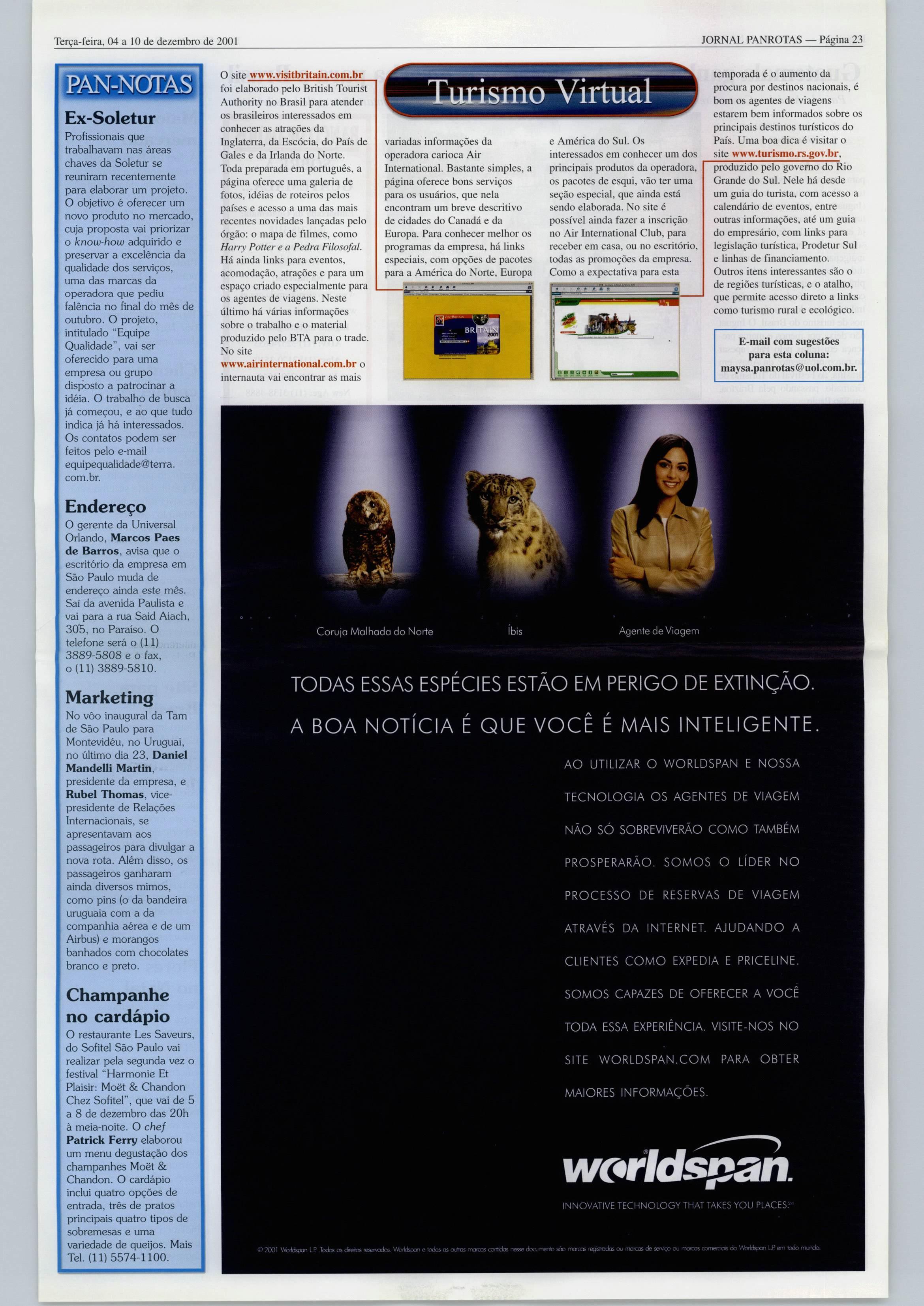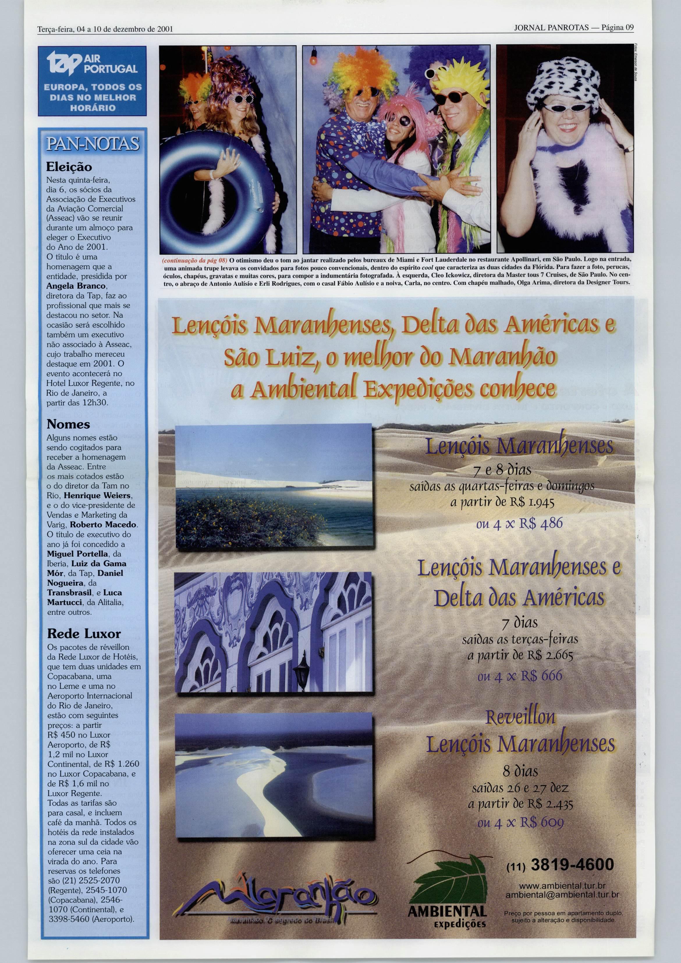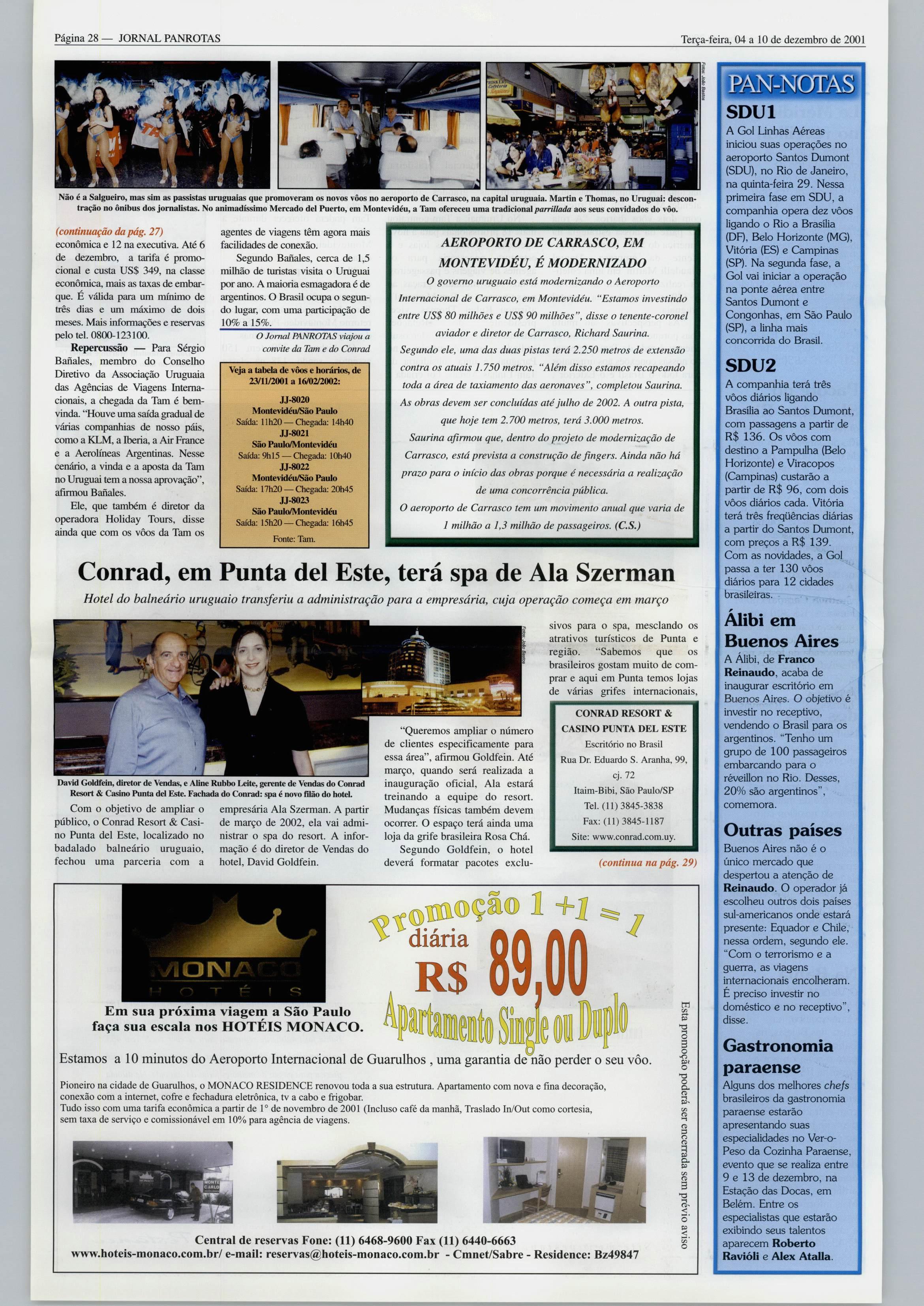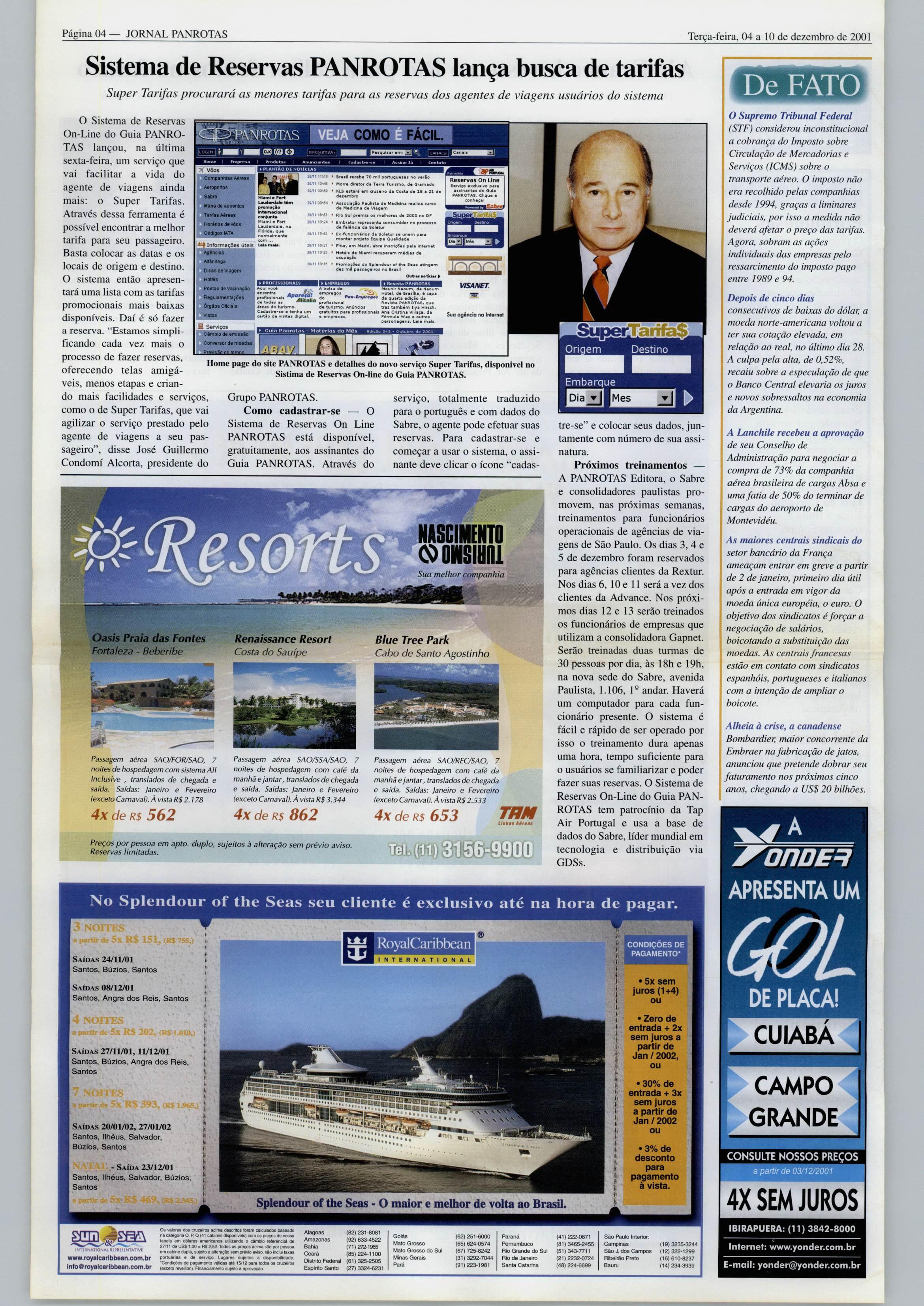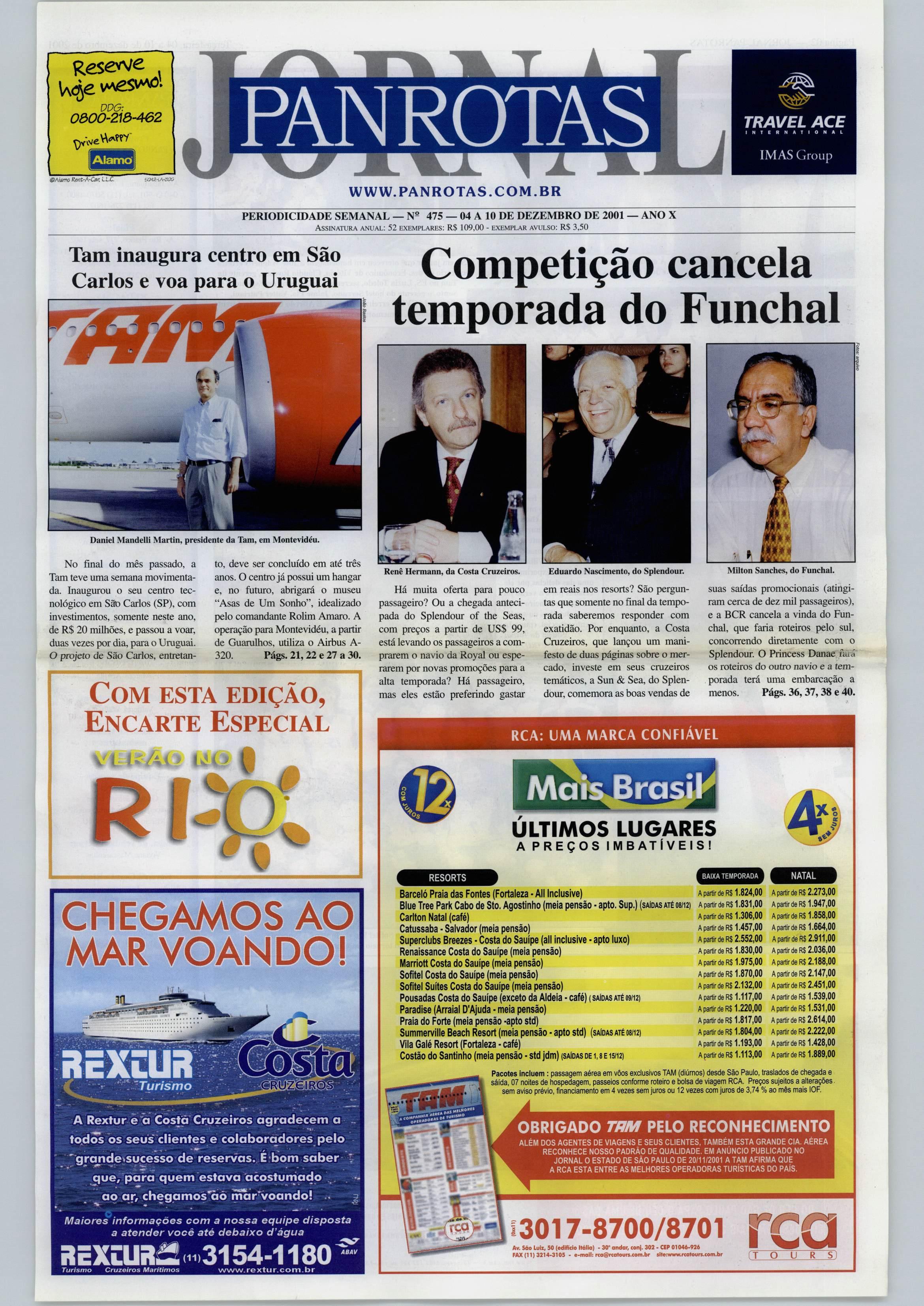 T • PDO: 0300'213'4e2 PAN ROTAS TRAVEL ACE INtCRKATIONAL IMAS Group Alamo anrt-A-Ülr: iiXi SX2-LA-K» 1 www.panrotas.com.br PERIODICroADE SEMANAL N- 475 04 A 10 DE DEZEMBRO DE 2001 ANO X Assinatura anual: 52 exemplares: RS 109.00 - exemplar avulso: R$ 3,50