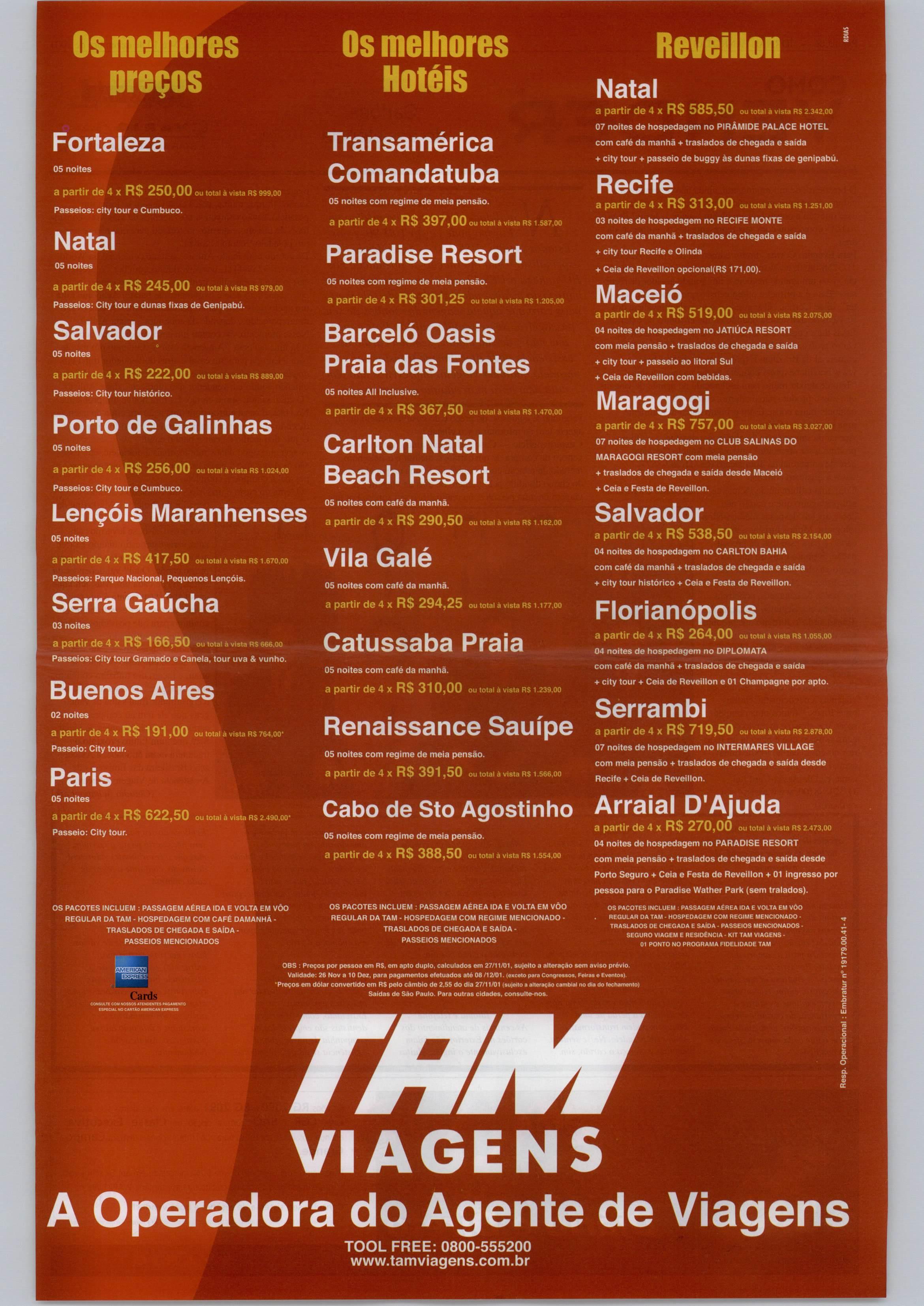 Apartir de RS 2.614,00 Apartirde RS 2.222,00 Apartirde RS 1.428,00 Apartrde R$ 1.889,00 Pacotes incluem; passagem aérea em vôos exclusivos TAM (diúmos) desde São Paulo, traslados dechegada e sáída, 07 noites de hospedagem, passeios conforme roteiro e bolsa de viagem RCA. Preços sujeitos a alterações. sem aviso prévio, financiamento em 4 vezes sem juros ou12vezes com juros de 3,74 %ao mês mais lOF. OBRIGADO TRM PELO RECONHECIMENTO ALÉM DOS AGENTES DE VIAGENS E SEUS CLIENTES, TAMBÉM ESTA GRANDE CIA, AÉREA RECONHECE NOSSO PADRÃO DE QUALIDADE. EM ANÚNCIO PUBLICADO NO JORNALO ESTADO DESÃO PAULO DE 20/11/2001 A TAM AFIRMA QUE A RCA ESTA ENTRE AS MELHORES OPERADORAS TURÍSTICAS 00 PAÍS. 413017-8700/8701 fCCÈ Av. São Luh. 50 tedtffcio Itália) • oivdflr. <sní. 302 • CEP 01044-926 H Av.São Luix, 50 (edtffcio Itália)- 30* andar,<sni.302• CEP 010M.926 FAX(11)3214-3I0S - e-mall: rca@rcateun.cem.br sHerwww.rcateun.cem.br TOUR S]