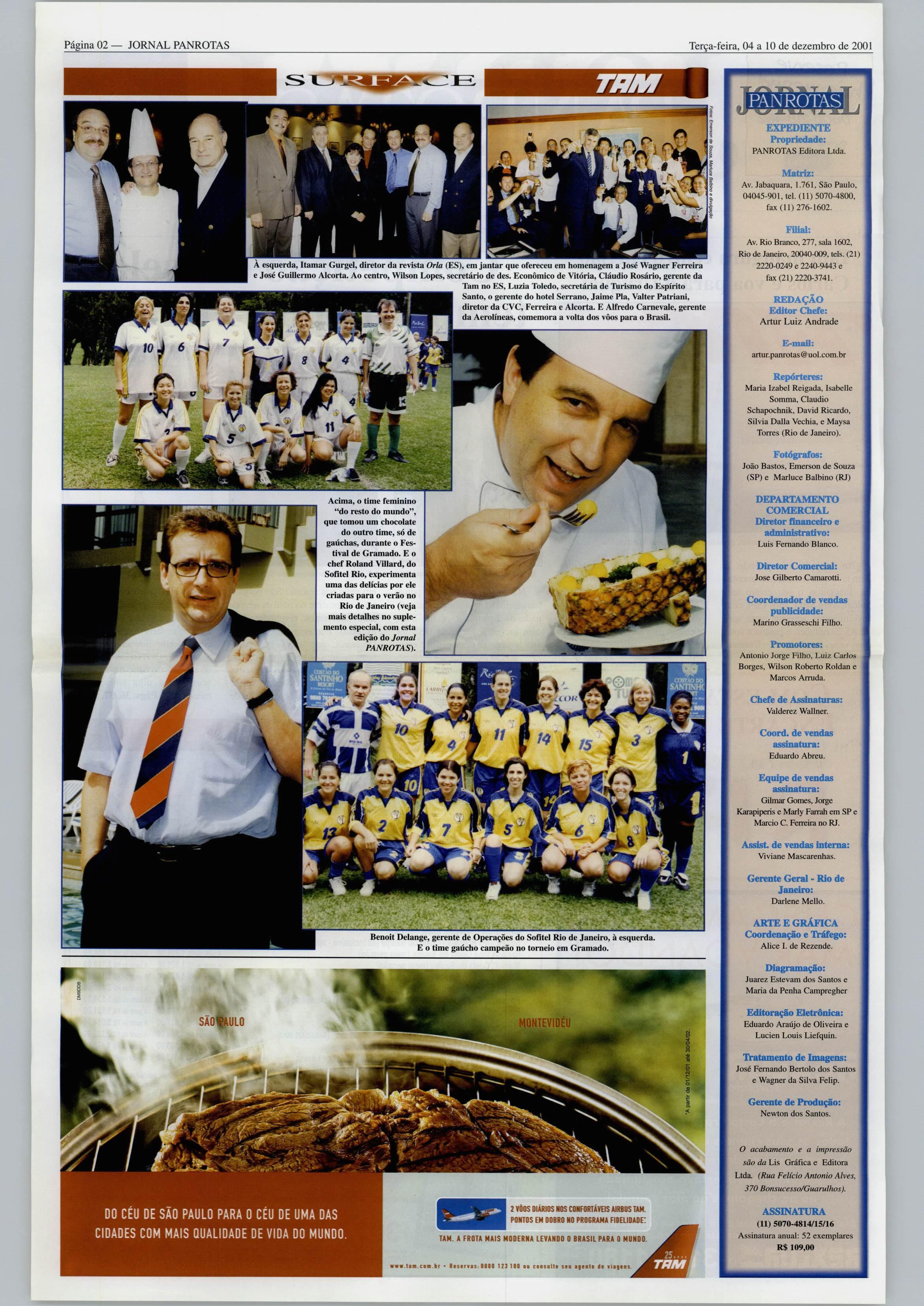 Acmia, o time feminino do resto do mundo que tomou um chocolate do outro time, sóde gaúchas, durante o Fes tival de Gramado. Eo chef Roland Villard, do Sofitel Rio, experimenta uma das delícias por ele criadas para o verão no Rio de Janeiro (veja mais detalhes no suple mento especial, com esta edição do Jornal PANROTAS).