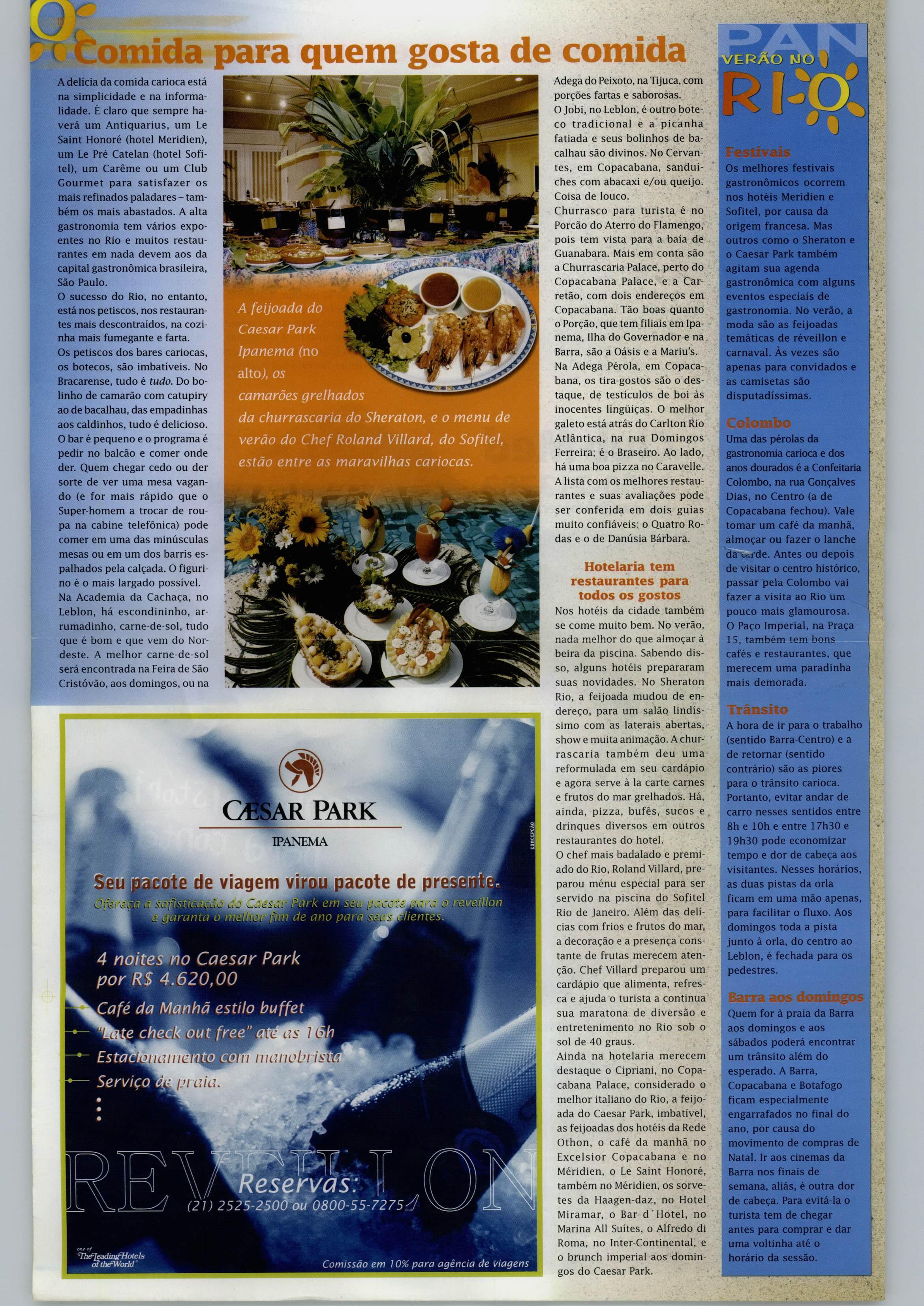 Nos hotéis da cidade também se come muito bem. No verão, nada melhor do que almoçar à beira da piscina. Sabendo dis so, alguns hotéis prepararam suas novidades. No Sheraton Rio,a feijoada mudou de en dereço, para um salão lindís simo com as laterais abertas, show e muita animação. A chur rascaria também deu uma reformulada em seu cardápio e agora serve á Ia carte carnes e frutos do mar grelhados. Há, ainda, pizza, bufês, sucos e. drinques diversos em outros restaurantes do hotel. O chef mais badalado e premi ado do Rio, Roland Villard, pre parou ménu especial para ser servido na piscina do Sofitel Rio de Janeiro. Além das delí cias com frios e frutos do mar, a decoração ea presença cons tante de frutas merecem aten ção. Chef Villard preparou um cardápio que alimenta, refres cae ajuda o turista a continua sua maratona de diversão e entretenimento no Rio sob o sol de 40 graus. Ainda na hotelaria merecem destaque o Cipriani, no Copa cabana Palace, considerado o melhor italiano do Rio,a feijo ada do Caesar Park, imbatível, as feijoadas dos hotéis da Rede Othon, o café da manhã no Excelsior Copacabana e no Méridien, oLe Saint Honoré, também no Méridien, os sorve tes da Haagen-daz, no Hotel Miramar, o Bar d'Hotel, no Marina Ali Suítes, o Alfredo di Roma, no Inter-Continental, e o brunch imperial aos domin gos do Caesar Park.