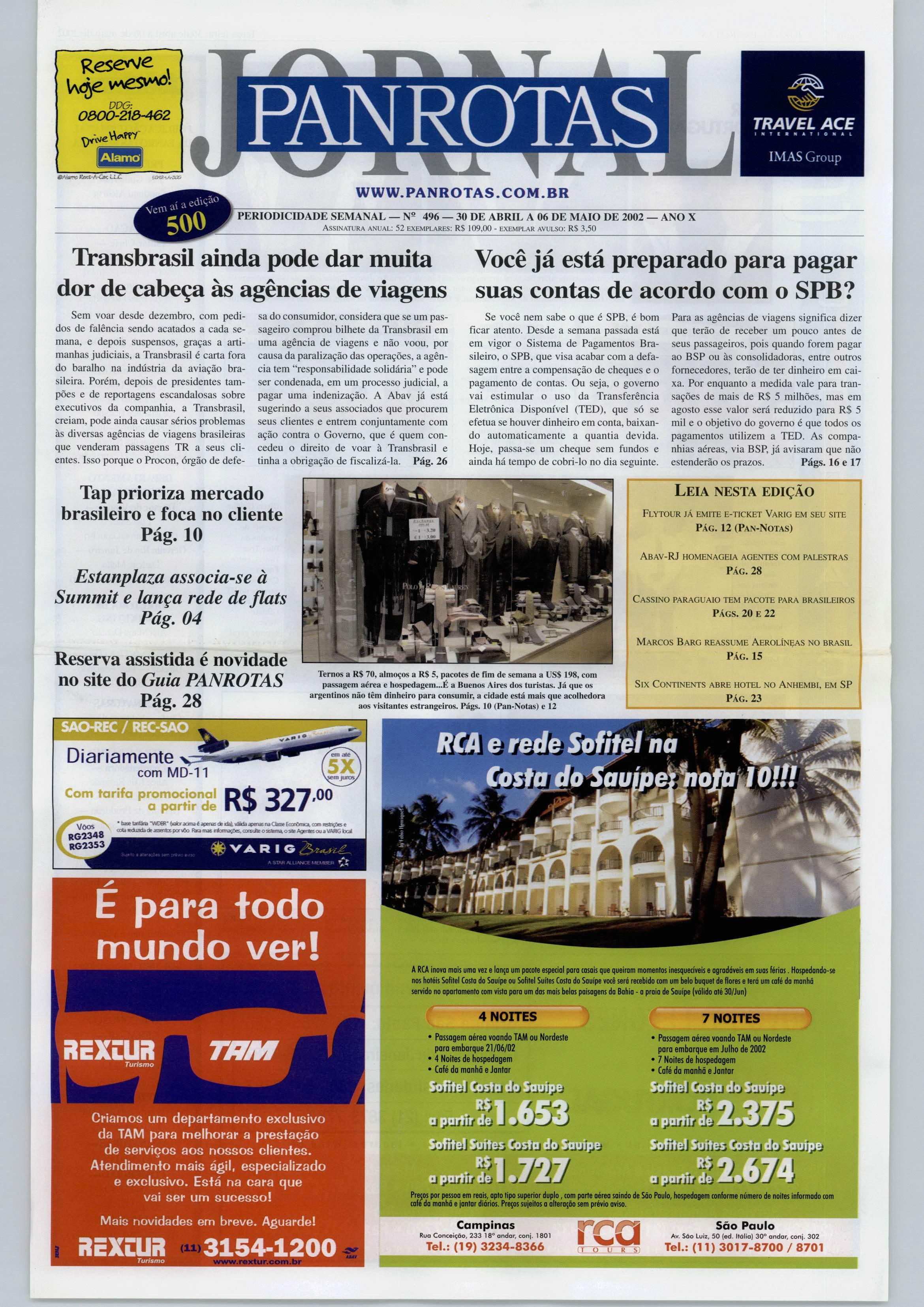 TÁ Resewe DPG: 0300-2^0-^2 W^ffy ^we PANROTAS TRAVEL ACE inTCVHâriOHAL IMAS Group Alamo' www.panrotas.com.br PERIODICIDADE SEMANAL 496 30 DE ABRIL A 06 DE MAIO DE 2002 ANO X Assinatura anual; 52 exemplares: R$ 109.00 - exemplar avulso: R$ 3.50