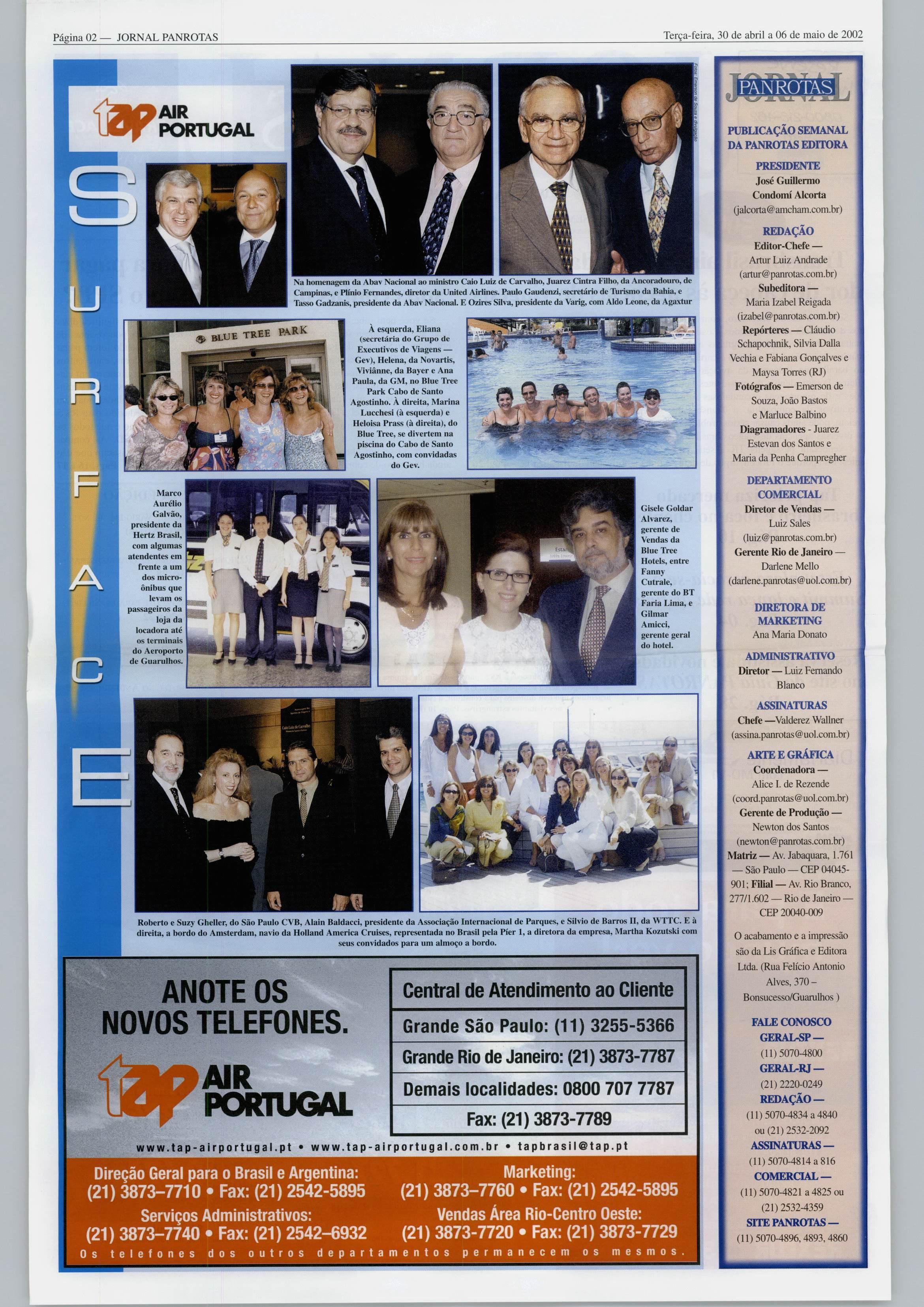 se divertem na piscina do Cabo de Santo Agostinho, com convidadas do Gev. Gisele Goldar Alvarez, gerente dc Vendas da Bluo Tree Hotéis, entre Fanny Cutrale, gerente do BT Faria Lima, e Gilmar Amicci. gerente geral do hotel. Roberto e Suzy Gheller. doSão Paulo CVB. Alain Baldacci, presidente da Associação Internacional de Parques, e Silvio de Barros H, da WTTC. Eà direita, abordodoAnisterdam.navioda Holiand América Cruises.representadanoBrasilpelaPíer1,adiretoradaempresa.MarthaKozulskicom seus convidados para um almoço a bordo. ANOTE os NOVOS TELEFONES. <^|AAIR UCPP^ PORTUGAL Central de Atendimento ao Cliente Grande São Paulo: (11) 3255-5366 Grande Rio de Janeiro: (21)3873-7787 Demais localidades: 0800 707 7787 Fax: (21) 3873-7789 1 www.tap-airportugal.pt • www.tap-airportugaLcom.br • tapbrasíl@tap.pt | Direção Geral parao Brasil e Argentina; Marketing: (21) 3873-7710 • Fax; (21) 2542-5895 (21) 3873-7760 • Fax: (21) 2542-5895 Serviços Administrativos; Vendas Área Rio-Centro Oeste; ii (21)