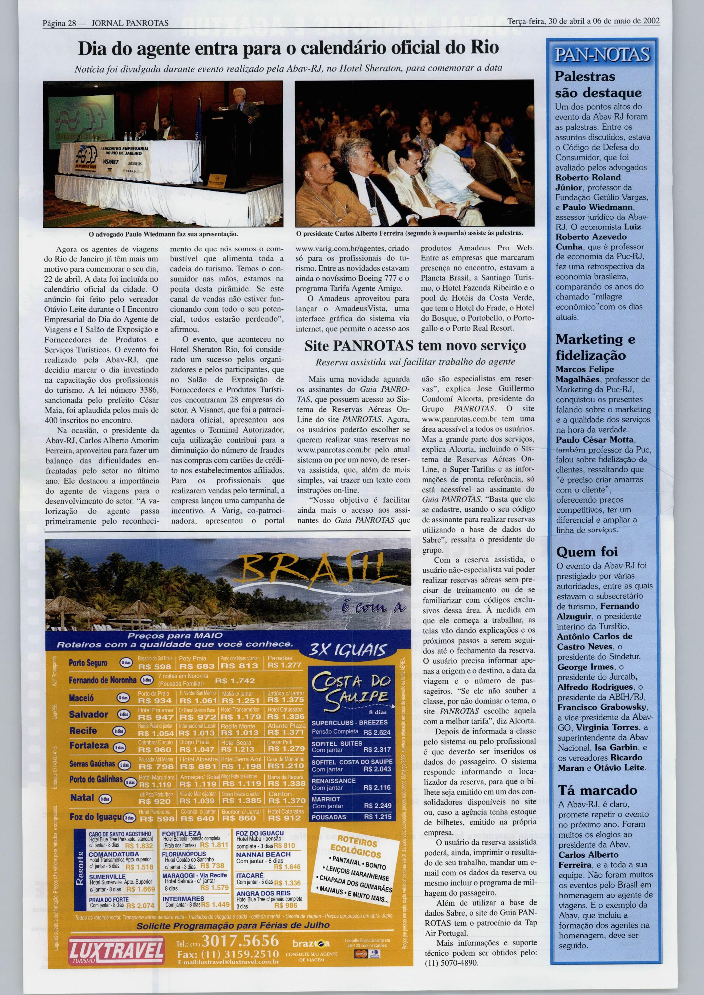 A Abav-RJ, é claro, promete repetir o evento no próximo ano. Foram muitos os elogios ao presidente daAbav, Carlos Alberto Ferreira, ea toda a sua equipe.Nãoforammuitos os eventos peloBrasilem homenagem aoagentede viagens.Eoexemploda Abav,queincluiua formação dos agentes na homenagem, deve ser seguido.