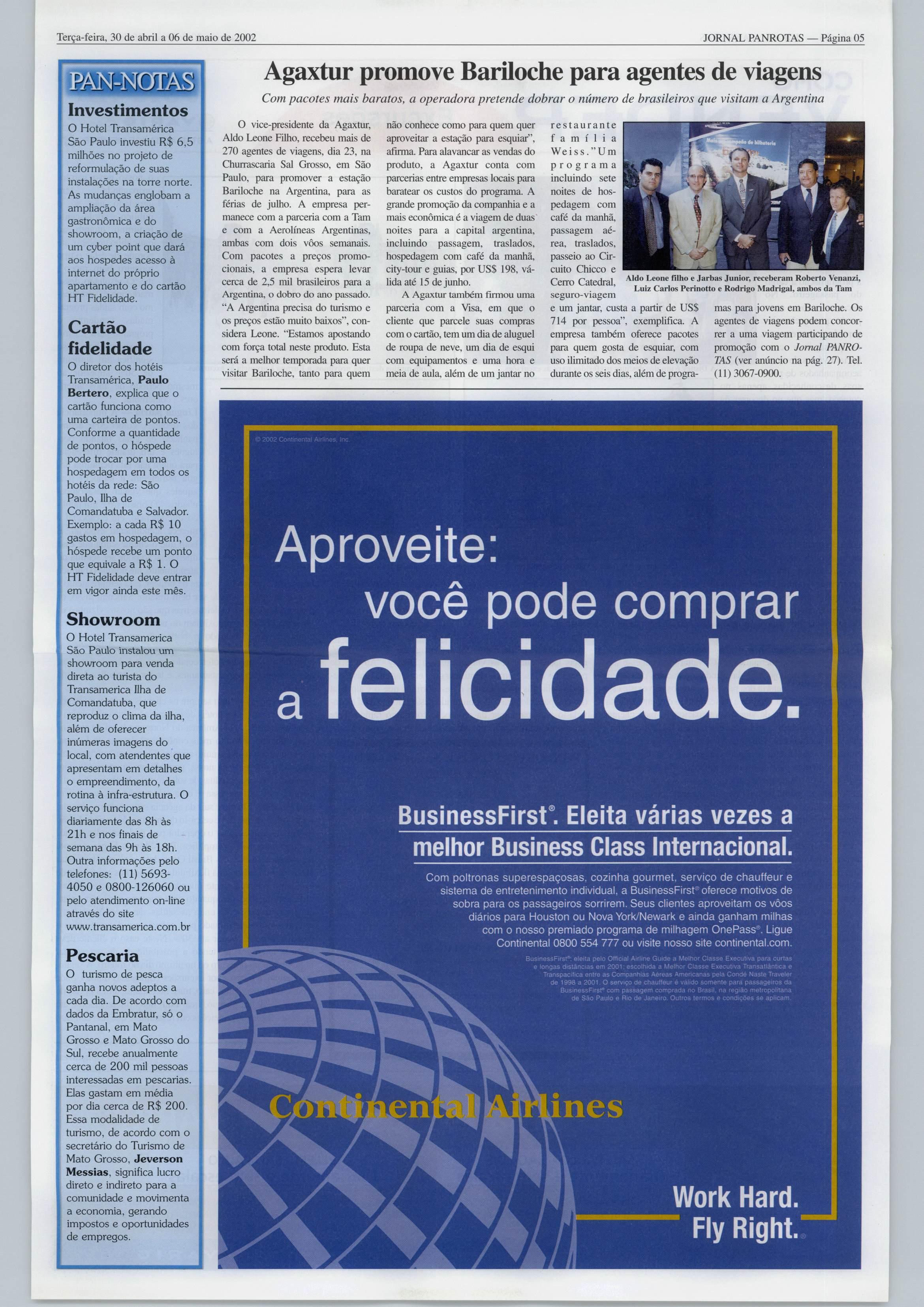 Já pensou você e seu acompanhante passando umo semana inteira em Bariloche -o maís famoso centro de lozer de inverno da América do Sul, com direito o parte aérea, 7 noites de hospedagem no Hotel Nevada, café da manhã e Snow Free exclusivo VISA?... Parece coisa de cinema, mas, esse filme pode virar realidade eoprotagonista pode ser você. Partícipe da promoção organizado pelo Jornal PANROTAS e pelo AGAXTUR -o operadora mais experiente e tradicional no destino Bariloche -e concorra à viagem mais divertida da temporada de inverno. Bosta responder com atenção às 3 perguntas abaixo e enviar o cupom preenchido pelo fax (11) 276-1602 ou pelo site do PANROTAS viww.panrotas.com.br até o dia 31/05/2002.
