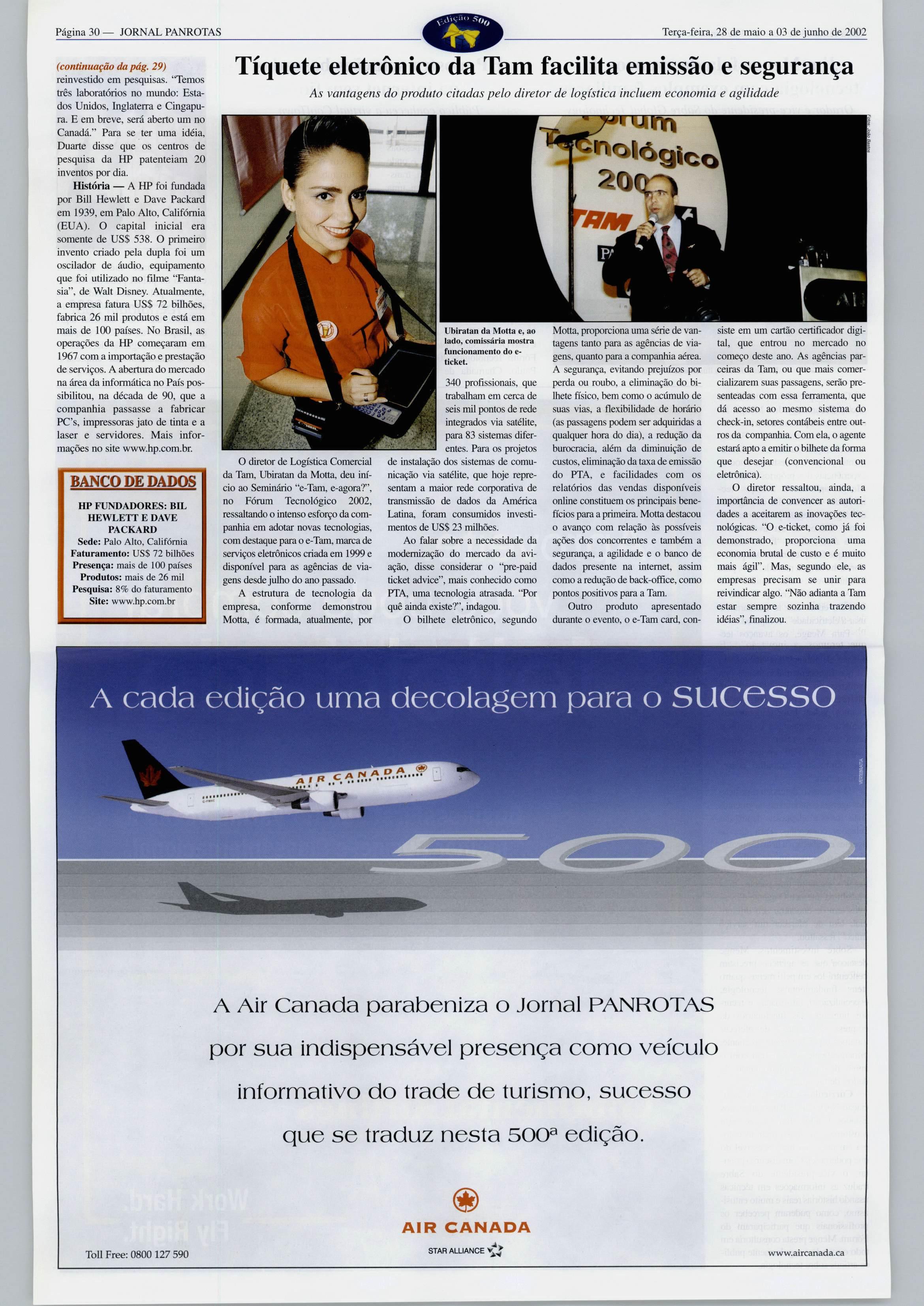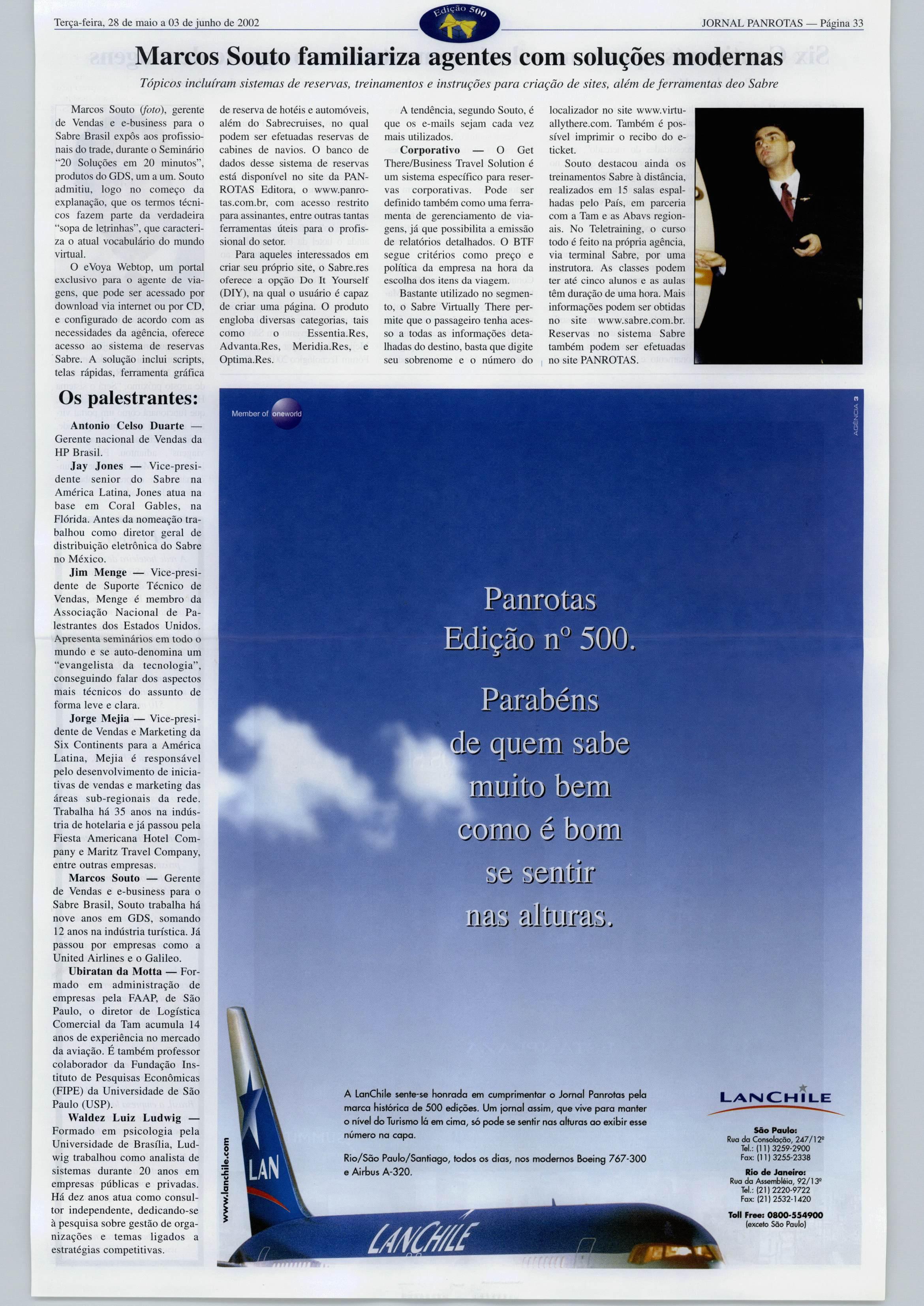 PANROTAS. Agora, nesta semana, comemora-se o número 500 da publicação que,deediçãoem edição, acompanhou de perto os acontecimentos mais importantes da indústria turística brasileira e internacional. Para presentear os leitores, osagentesdeviagens,que prestigiaramo jomal nessas499 edições, a número 500 vem com um enfoque especial;a valorização do trabalho do agente de viagens.