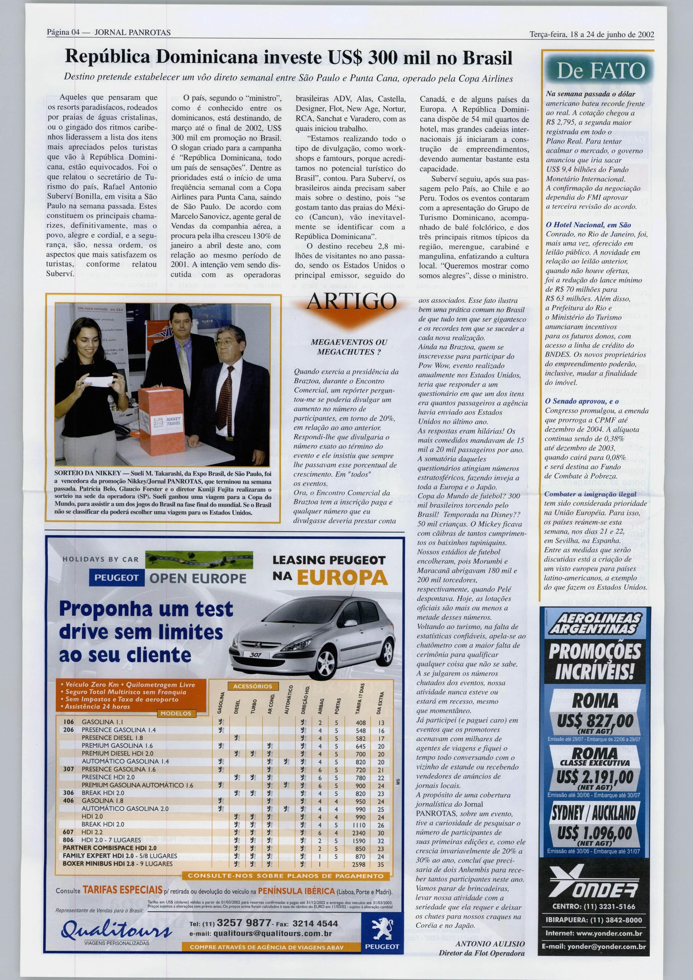 Opaís,segundoo"ministro", como é conhecido entre os dominicanos, está destinando, de março atéofinalde 2002, US$ 300milem promoção noBrasil. Oslogancriadoparaacampanha é "República Dominicana, todo umpaísde sensações". Dentre as prioridades está o im'cio de uma freqüênciasemanalcomaCopa Airlines para Punta Cana, saindo de São Paulo. De acordo com Marcelo Sanovicz, agentegeralde Vendasda companhia aérea,a procura pela ilha cresceu 130% de janeiro aabril deste ano, com relação ao mesmo período de 2001.Aintençãovemsendodis cutida comas operadoras